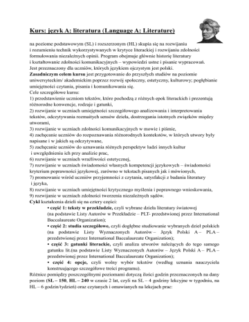 Kurs: język A: literatura (Language A: Literature) na poziome podstawowym (SL) i rozszerzonym (HL) skupia się na rozwijaniu i rozumieniu technik wykorzystywanych w krytyce literackiej i rozwijaniu zdolności formułowania niezależnych opinii. Program obejmuje głównie historię literatury i kształtowanie zdolności komunikacyjnych – wypowiedzi ustne i pisanie wypracowań. Jest przeznaczony dla uczniów, których językiem ojczystym jest polski. Zasadniczym celem kursu jest przygotowanie do przyszłych studiów na poziomie uniwersyteckim/ akademickim poprzez rozwój społeczny, estetyczny, kulturowy; pogłębianie umiejętności czytania, pisania i komunikowania się. Cele szczegółowe kursu: 1) przedstawienie uczniom tekstów, które pochodzą z różnych epok literackich i prezentują różnorodne konwencje, rodzaje i gatunki, 2) rozwijanie w uczniach umiejętności szczegółowego analizowania i interpretowania tekstów, odczytywania rozmaitych sensów dzieła, dostrzegania istotnych związków między utworami, 3) rozwijanie w uczniach zdolności komunikacyjnych w mowie i piśmie, 4) zachęcanie uczniów do rozpoznawania różnorodnych kontekstów, w których utwory były napisane i w jakich są odczytywane, 5) zachęcanie uczniów do uznawania różnych perspektyw ludzi innych kultur i uwzględnieniu ich przy analizie prac, 6) rozwijanie w uczniach wrażliwości estetycznej, 7) rozwijanie w uczniach świadomości własnych kompetencji językowych – świadomości kryterium poprawności językowej, zarówno w tekstach pisanych jak i mówionych, 7) promowanie wśród uczniów przyjemności z czytania, satysfakcji z badania literatury i języka, 8) rozwijanie w uczniach umiejętności krytycznego myślenia i poprawnego wnioskowania, 9) rozwijanie w uczniach zdolności tworzenia niezależnych sądów. Cykl kształcenia dzieli się na cztery części: • część 1: teksty w przekładzie, czyli wybrane dzieła literatury światowej (na podstawie Listy Autorów w Przekładzie – PLT- przedstwionej przez International Baccalaureate Organization); • część 2: studia szczegółowe, czyli dogłębne studiowanie wybranych dzieł polskich (na podstawie Listy Wyznaczonych Autorów – Język Polski A – PLA – przedstwionej przez International Baccalaureate Organization); • część 3: gatunki literackie, czyli analiza utworów należących do tego samego gatunku lit.(na podstawie Listy Wyznaczonych Autorów – Język Polski A – PLA – przedstwionej przez International Baccalaureate Organization); • część 4: opcje, czyli wolny wybór tekstów (według uznania nauczyciela konstruującego szczegółowe treści programu). Różnice pomiędzy poszczególnymi poziomami dotyczą ilości godzin przeznaczonych na dany poziom (SL – 150, HL – 240 w czasie 2 lat, czyli na SL – 4 godziny lekcyjne w tygodniu, na HL – 6 godzin/tydzień) oraz czytanych i omawianych na lekcjach prac: Część kursu 1. 2. 3. 4. Poziom podstawowy 2 prace 2 prace 3 prace 3 prace Poziom rozszerzony 3 prace 3 prace 4 prace 3 prace Pod pojęciem praca kryje się 1 większy tekst literacki (powieść, autobiografia lub biografia) lub kilka utworów, które odpowiadają obszerniejszemu utworowi ( np. 2 lub więcej nowel, 5-10 opowiadań, 5-8 esejów, kilka wierszy lub 1 długi – minimum 600 wersów). Przedmiot: Language A: Literature HL Poziom: rozszerzony Tematyka zajęć: Teksty kultury: Część 1: Wybrane dzieła literatury światowej. Przykładowe treści: J. Conrad: Jądro ciemności w kontekście filmu F. F. Coppoli: Czas Apokalipsy. - Joseph Conrad w lekturze nowoczesnej i ponowoczesnej; recepcja twórczości w kulturze polskiej i anglosaskiej; - Problem unde malum i conradowski kodeks etyczny; - Europejczyk wobec mieszkańców Afryki, cywilizacja a natura; - Jądro ciemności – utwór o opowiadaniu i słuchaniu opowieści; - Człowiek wobec zła w języku literatury i filmu. A. Camus: Dżuma. - Egzystencjalny heroizm bohaterów Dżumy Alberta Camusa; – Człowiek cierpiący wobec Boga; – Dżuma jako parabola; – Zagrożenia współczesności: Bakcyl dżumy nigdy nie umiera… - Techniki narracyjne w Dżumie. Patric Suskind: Pachnidło. - Czy cel uświęca środki? – marzenia bohatera Pachnidła; – Jak pachnie Paryż?- sensualna rzeczywistość w dziele P. Suskinda; – Motywy i techniki literackie oraz eksperymenty językowe. Część 2: Dogłębne studiowanie wybranych dzieł. Poezja Z. Herberta: Przesłanie Pana Cogito, Ornamentatorzy, Który skrzywdziłeś, Dlaczego klasycy, Apollo i Marsjasz. - Władcy i poddani w utworach Z. Herberta; - Dekalog Pana Cogito; - Klasycyzm i uniwersalizm w twórczości Z. Herberta. A. Mickiewicz: Dziady cz. III. - Bohaterowie III cz. Dziadów, kontekst historyczny i biograficzny; - Historiozofia romantyczna w wizji mesjanistycznej, funkcja nawiązań biblijnych; - Kreacjonizm i prometeizm, koncepcja Boga; - Obraz carskiej Rosji; - Arcydramat narodowy, realizacje teatralne i filmowe dramatu jako sposób interpretacji dzieła. B. Schulz: wybór opowiadań: Sklepy cynamonowe, Traktat o manekinach, Sierpień, Ulica Krokodyli. - Łamanie konwencji prawdopodobieństwa epickiego; – Człowiek w świecie symboli; - Analiza porównawcza filmu i opowiadania, język filmu a język literatury; – Świat Schulza w kontekstach: biograficznym, filozoficznym, literackim, obyczajowym; - Kreacja świata przedstawionego, cechy gatunkowe, uniwersalizm. Kontekst: Ulica Krokodyli – film animowany, reżyseria: Stephen Quay. Część 3: Rodzaje i gatunki literackie. A. Fredro: Śluby panieńskie. - Komedia intrygi i charakteru; - Uniwersalizm i konwencje literackie; – Śluby panieńskie- komedia romantyczna czy antyromantyczna?; – Język bohaterów dzieła A. Fredry. S. Wyspiański: Wesele. - Geneza Wesela, pierwowzory bohaterów, zjawisko chłopomanii; - Portret inteligenta i chłopa; - Co się komu w duszy gra, co kto w swoich widzi snach – rola widm i choch