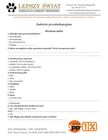 Cieszyn, ul. Limanowskiego 8/3 tel. 782 71 77 71 , e-mail: [email protected] www.fundacjalepszyswiat.pl ● jesteśmy ich głosem, ich wołaniem o godne traktowanie, o miłość i spokojne miejsce na Ziemi ● Ankieta przedadopcyjna Informacje ogólne 1. Jakiego typu psa poszukujesz? □ pracującego □ stróżującego □ do towarzystwa □ innego .................................. 2. Jakie szczególny cechy powinien posiadać Twój wymarzony pies? ……………………………………………………………………………………………………………….. ……………………………………………………………………………………………….......................... 3. Preferowany wiek psa □ szczenię /do 12 miesięcy/ □ młody /do 4 roku życia/ □ w średnim wieku /od 4 do 8 lat/ □ senior /od 8 w górę/ 4. Preferowana płeć □ pies □ suka □ bez znaczenia 5. Wielkość □ mały □ średni □ duży 6. Rasa □ w typie rasy: ………………………………………………………….…………………………………………………… □ mieszaniec 6. Czy kiedykolwiek miałeś już psa? □ tak - jak długo, co się z nim stało?............................................................................................................................................................. □ nie 7. Jak długo pies będzie przebywał sam w domu? .......................................................................................................... KRS 0000366266 , NIP: 5482630528 ING Bank Śląski, 33 1050 1403 1000 0090 3005 3319 Cieszyn, ul. Limanowskiego 8/3 tel. 782 71 77 71 , e-mail: [email protected] www.fundacjalepszyswiat.pl ● jesteśmy ich głosem, ich wołaniem o godne traktowanie, o miłość i spokojne miejsce na Ziemi ● 8. Czy szukasz psa głównie: □ na dwór □ do mieszkania/domu 9. Gdzie pies będzie przebywał podczas nieobecności domowników? ......................................................................................................................................................................... 10.Jeśli pies będzie trzymany na dworze, czy będzie posiadał wybieg i budę? □ tylko budę i wybieg □ budę i kojec 11.Czy spotkałeś się już z problemami hierarchii w stadzie, zapędami dominacyjnymi psa? □ tak □ nie 12.Czy zdajesz sobie sprawę, że często nie jest znana cała historia psa, który jest proponowany do adopcji i zdarzają się problemy z jego zachowaniem i zdrowiem, których nie jesteśmy w stanie przewidzieć? □ tak □ nie 13. Czy jesteś gotowy przyjąć do siebie psa z problemami behawioralnymi, brakiem w socjalizacji, nieprawidłowo ułożonego, wymagającego zwiększonej ilości pracy? □ tak □ nie 14.Jeśli wystąpią nieprzewidziane problemy z psem, czy wyrażasz zgodę na współpracę z osobą wskazaną (szkoleniowcem, behawiorystą, weterynarzem), aby je zniwelować? □ tak □ nie 15.Kto będzie się opiekował psem podczas dłuższej nieobecności właściciela i domowników? …………………………………………………………………………………………………………… 16. Czy zgadzasz się na sterylizację/kastrację zwierzęcia? □ tak □ nie 17. Czy wyrażasz zgodę na podpisanie umowy adopcyjnej? □ tak □ nie 18. Czy wyrażasz zgodę na kontrolę przedadopcyjną oraz poadopcyjną? □ tak □ nie KRS 0000366266 , NIP: 5482630528 ING Bank Śląski, 33 1050 1403 1000 0090 3005 3319 Cieszyn, ul. Limanowskiego 8/3 tel. 782 71 77 71 , e-mail: [email protected] www.fundacjalepszyswiat.pl ● jesteśmy ich głosem, ich wołaniem o godne traktowanie, o miłość i spokojne miejsce na Ziemi ● Informacje o innych zwierzętach przebywających w domu: 1. Czy posiadasz obecnie inne zwierzęta w domu? □ tak □ nie 2. Jeśli „tak” czy są one wykastrowane/wysterylizowane? ................................................................. 3. Jeśli „tak” wymień gatunek, rasę, wiek i płeć posiadanych zwierząt .......................................................................................................................................................................... 4. Czy wszystkie Twoje zwierzęta są zaszczepione? □ tak □ nie 5. Czy kiedykolwiek oddałeś zwierzę? □ tak, powód ……………………………………………………………………………………………………………….. □ nie Dane osobowe: 1. Imię i nazwisko ……………………………………………………………………………………. 2. Telefon domowy / komórkowy ………………………. , e-mail ………………………………. 3. Ilość osób w gospodarstwie domowym - dorośli, dzieci (w jakim wieku): …………………………………………………………………………………………………..………… 4. Czy w ciągu dnia jest ktoś stale obecny w domu? ……………………………………………………….. 5. Kto z domowników będzie się zajmował psem? ........................................................................................ 6. Czy jest możliwość wykorzystania przez kogoś z rodziny urlopu przez pierwsze dni pobytu psa w domu? □ tak □ nie Informacje dotyczące warunków mieszkaniowych: 1. Czy mieszkasz w: □ mieszkaniu □ domu wolnostojącym □ inne KRS 0000366266 , NIP: 5482630528 ING Bank Śląski, 33 1050 1403 1000 0090 3005 3319 Cieszyn, ul. Limanowskiego 8/3 tel. 782 71 77 71 , e-mail: [email protected] www.fundacjalepszyswiat.pl ● jesteśmy ich głosem, ich wołaniem o godne traktowanie, o miłość i spokojne miejsce na Ziemi ● 2. Czy masz ogród? □ tak □ nie 3. Jeśli „tak” czy ogród jest ogrodzony? □ tak (jak wysokie jest ogrodzenie?) …………………………………………………………………… □ nie 4. Jeśli „tak” czy pies będzie mógł swob