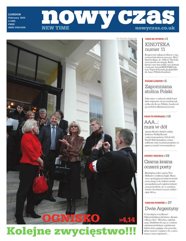 lONdON February 2013 2 (188) Free ISSN 1752-0339 czaS Na wySpIe »3 KINOTEKA numer 11 Bezsprzecznie najlepszym filmem w tegorocznym festiwalowym menu jest „Róża” Smarzowskiego, ale „Obława” Kryształowicza niewiele mu ustępuje. Będzie klasyka i nowe kino polskie oraz spotkania z twórcami. Gośćmi KINOTEKI będą m,in. Wojciech Pszoniak, Jan Jakub Kolski, Anna i Wilhelm Sasnalowie. pOlSKI lONdyN »5 Zapomniana stolica Polski Setki tysięcy w większości młodych polskich emigrantów nie jest świadoma jak wielką rolę dla nas, Polaków, Londyn odgrywał ledwie kilkadziesiąt lat temu. czaS tO pIeNIĄdz »18 AAA...: nura w dół Agencja Moody’s obniżyła ranking kredytowy Wielkiej Brytanii z najwyższego poziomu AAA do AA1. Powód? Słaba koniunktura, rosnące zadłużenie, brak wyraźnych perspektyw na poprawę sytuacji i wzrost gospodarczy. ludzIe I mIejSca »19 Czarna kraina oczami poety Birmingham,stolica regionu West Midlands w środkowej Anglii. Miasto wraz z przylegającymi miejscowościami tworzy drugi co do wielkości ośrodek metropolitalny pod względem ludności zaraz po Londynie, ale co ważniejsze, również i liczebności naszych rodaków – około 400 tys. czaS Na pOdrÓŻe » 27 Dwie Argentyny OGNISKO »4,14 Kolejne zwycięstwo!!! Z czym kojarzy ci się Buenos? Odpowiedziałabym jak bohater „Kwintet z Buenos Aires”: Maradona, zaginieni, tango. Dodałabym do tego, że z małymi, zadymionymi lokalami, wypełnionymi ludźmi, którzy popijając wino prowadzą głośne rozmowy z tangiem w tle, o tańcu, muzyce i może zaginionych… |17 nowy czas | luty 2013 historie mało znane SieDzieć cicho Zjednoczonych. Napisał do znajomych, którzy tam mieszkają. Odpisali, obiecując szukać dla niego zajęcia. Mimo trudnej sytuacji finansowej wysyła żonie paczki, których zawartość ta sprzedaje w Warszawie, zdobywając środki na utrzymanie syna. Za przygotowanie witryny sklepu otrzymuje wynagrodzenie w postaci używanej (z 1962 roku) maszyny do pisania. Później zamienia ją na taką z polską czcionką, wymiany dokonał z pewną panią, która przepisywała teksty dla księgarza specjalizującego się w polonikach. Na niej spisuje teksty piosenek. Dokucza mu brak przyjaciół. „Jak się okazuje, przyjaźń to luksusowe uczucie i rozwija się tylko wśród urządzonych i sytych. Tutaj ludzie na ten luksus nie pozwalają sobie; wszystkie kontakty są powierzchowne i zdawkowe. I człowiek wpada w samotność jak w studnię. Jak ciężko wtedy sprostać troskom i niepowodzeniom! Może tylko pycha jest w samotności przyjacielem” – zastanawiał się. W jednym z utworów tak podsumowuje swoje życie: „Nie dorosłem do swych lat, masz mnie za nic, dobrześ zgadł, jak tak można? Pytam was, tyle lat marnować czas?”. W lutym 1968 roku znajduje jednak stałą pracę u paryskiego architekta René Serraza. Pensja 2000 franków. Pobudka o siódmej, kilka minut po ósmej stoi na peronie, czekając na metro. Pracę zaczyna o dziewiątej, kończy o siódmej, wpół do ósmej wieczorem. Na przerwę nie wychodzi. Zostaje sam w biurze, przygotowuje kawę i pożywia się przyniesionymi sandwiczami wertując tomy przepisów, norm oraz katalogi. Pomimo setek godzin poświęconych na naukę francuskiego nadal towarzyszą mu trudności językowe. Zajmuje się prawie wszystkim, od rysunków stolarskich i mebli do planów urbanistycznych. Otrzymuje kartę pracy i prawo do świadczeń w wypadku choroby lub leczenia. Ostatni raz z rOdziną Nie rusza się bez kołonotatnika. Robi w nim zapiski, na osobnych kartkach utrwala wszystko, co trzeba i (zwykle w weekend) rozdziela wszystko do działów: „Informacje do Paryżu”, „Gdzie co kupić”, „Jak to powiedzieć”, „Co to znaczy”, „Słownik obrazkowy”. Notuje myśli, rysunki, wyliczenia pieniężne i adresy. Oprócz właściwości praktycznych to także rodzaj terapii, dowód na istnienie, trwanie w nadziei. Jest świadkiem rewolucji majowej 1968 roku, strajku generalnego zamieszek. Atmosferę tamtych dni opisuje w piosence „Marianna”: „[…] jest rewolucja, śmietnik płonie, policja pędzi, no co z tą pałą do kurwy nędzy, łap pióro, ponuro w odezwie opisz flika gwałcącego panny z barykad”. Nie wierzy w ideały tego ruchu społecznego, drugi raz nie daje się oszukać. Gdy miał dwadzieścia lat, uwierzył w realizację utopii, teraz podchodzi do tego z dystansem, ironią i cynizmem. Po utracie zatrudnienia wyjeżdża na krótko do nadmorskiego Boulogne-sur-Mer. Wraca jednak do Paryża. Wakacje 1971 roku spędza z żoną i synem. Codziennie kino, rozpieszczanie potomka. Zwiedzanie stolicy, która pada u ich stóp, gdy wjeżdżają na wieżę Eiffla. Chwile beztroski na basenie. To ostatnie ich spotkanie. Pozostały po nim tylko czarno-białe fotografie i wspomnienia. W obawie przed uniemożliwieniem wyjazdu do Francji nie przyjeżdża na Pierwszą Komunię syna. nie pojawia się też na pogrzebie ojca. Z biegiem lat zmienia pracę na lepszą, jest aktywny jako kreślarz w biurze projektowym, finansowo powodzi mu się coraz lepiej. Latem 1971 roku poznaje o dwadzieścia dwa lata młodszą Polkę, kelnerkę w bistro, w którym jada z przyjaciółmi. Zaczyna się jego ostatnia miłość. Zamieszkują razem w mieszkaniu wynajmowanym przez niego na ul. Oberkampf. Wspólnie odwiedzają jego znajomych, głównie żydowskich emigrantów. W bagażniku samochodu zawsze gitara – nie rozstaje się z nią, na spotkaniach u znajomych śpiewa. Magnetyzuje. Oczarowuje. Uwodzi. Przy akompaniamencie instrumentu stwarza duchową ucztę. Tak samo zapamiętano go i w Płocku, i w Warszawie. Z paryskich biesiad wraca pijany za kierownicą swej banioli, dziewczyna namawia go, by przejeżdżał na czerwonym świetle… i zawsze mają szczęście. Ani wypadku, ani nawet kontroli policji. Pech dopada go w innym miejscu, w innych okolicznościach. W styczniu 1973 roku chorujący na serce Staszewski uskarża się 
