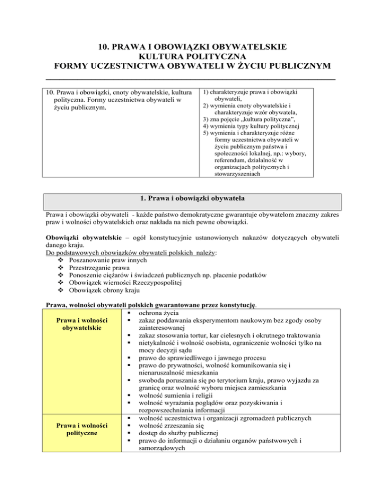 10. PRAWA I OBOWIĄZKI OBYWATELSKIE KULTURA POLITYCZNA FORMY UCZESTNICTWA OBYWATELI W ŻYCIU PUBLICZNYM ________________________________________________________________ 10. Prawa i obowiązki, cnoty obywatelskie, kultura polityczna. Formy uczestnictwa obywateli w życiu publicznym. 1) charakteryzuje prawa i obowiązki obywateli, 2) wymienia cnoty obywatelskie i charakteryzuje wzór obywatela, 3) zna pojęcie „kultura polityczna”, 4) wymienia typy kultury politycznej 5) wymienia i charakteryzuje różne formy uczestnictwa obywateli w życiu publicznym państwa i społeczności lokalnej, np.: wybory, referendum, działalność w organizacjach politycznych i stowarzyszeniach 1. Prawa i obowiązki obywatela Prawa i obowiązki obywateli - każde państwo demokratyczne gwarantuje obywatelom znaczny zakres praw i wolności obywatelskich oraz nakłada na nich pewne obowiązki. Obowiązki obywatelskie – ogół konstytucyjnie ustanowionych nakazów dotyczących obywateli danego kraju. Do podstawowych obowiązków obywateli polskich należy: Poszanowanie praw innych Przestrzeganie prawa Ponoszenie ciężarów i świadczeń publicznych np. płacenie podatków Obowiązek wierności Rzeczypospolitej Obowiązek obrony kraju Prawa, wolności obywateli polskich gwarantowane przez konstytucję. ochrona życia zakaz poddawania eksperymentom naukowym bez zgody osoby Prawa i wolności zainteresowanej obywatelskie zakaz stosowania tortur, kar cielesnych i okrutnego traktowania nietykalność i wolność osobista, ograniczenie wolności tylko na mocy decyzji sądu prawo do sprawiedliwego i jawnego procesu prawo do prywatności, wolność komunikowania się i nienaruszalność mieszkania swoboda poruszania się po terytorium kraju, prawo wyjazdu za granicę oraz wolność wyboru miejsca zamieszkania wolność sumienia i religii wolność wyrażania poglądów oraz pozyskiwania i rozpowszechniania informacji wolność uczestnictwa i organizacji zgromadzeń publicznych wolność zrzeszania się Prawa i wolności dostęp do służby publicznej polityczne prawo do informacji o działaniu organów państwowych i samorządowych Prawa i wolności ekonomiczne, socjalne i kulturalne prawo wyborcze i prawo udziału w referendum prawo do składania petycji i skarg prawo do własności i dziedziczenia prawo wyboru zawodu i miejsca pracy prawo do ochrony zdrowia prawo do nauki, która do 18. roku życia jest obowiązkowa, a w szkołach publicznych bezpłatna wolność twórczości artystycznej, badań naukowych i korzystania z dóbr kultury 2. Cnoty obywatelskie Cnoty obywatelskie to wartości, którymi człowiek powinien się kierować w życiu publicznym. Cnoty składają się na wzór obywatela w państwie demokratycznym. Współczesne cnoty obywatelskie: Dyscyplina wewnętrzna – uporządkowanie i determinacja w realizacji planów; umiejętność narzucenia sobie określonych planów działania oraz konsekwencja w ich realizacji, co wiąże się z odpowiedzialnością Tolerancja – poszanowanie i poglądów innych ludzi Krytycyzm – umiejętność dokonywania rozsądnych ocen rzeczy, zjawisk czy opinii. Umiejętność krytycznego myślenia pozwala wybrać te propozycje, które są najbardziej realne i mają niewiele wspólnego z demagogią Odpowiedzialność za słowa – świadomość konsekwencji swoich wypowiedzi Uspołecznienie – podejmowanie różnych inicjatyw społecznych, zainteresowanie problemami społecznymi i podejmowanie działań w celu ich przezwyciężania. Jednym z takich działań jest wolontariat – świadoma i bezinteresowna działalność dla dobra innych. Największe polskie organizacje humanitarne działające na podstawie wolontariatu: Polska Akcja Humanitarna – Janina Ochojska, Wielka Orkiestra Świątecznej Pomocy – Jerzy Owsiak, „Caritas” Polska, Krajowy Komitet Pomocy Dzieciom i Młodzieży Wzór obywatela 3. Formy uczestnictwa obywateli w życiu publicznym. Patrz temat 8. Demokracja bezpośrednia i pośrednia. Formy samoorganizacji społeczeństwa stowarzyszenia - dobrowolna organizacja społeczna; samorządne, trwałe zrzeszenie o celach niezarobkowych, które samodzielnie określa swoje cele, program działania i strukturę organizacyjną, która skupia członków pracujących społecznie (np. Caritas Polska, PCK, PTTK) fundacje - organizacja ustanowiona przez założycieli dla realizacji określonych działań np. dla ochrony zdrowia, rozwoju nauki, oświaty, popierania współpracy młodzieżowej z zagranicą, ochrony środowiska itp. (np. Fundacja „Polsat”, Polska Fundacja Dzieci i Młodzieży, Fundacja Jolanty Kwaśniewskiej „Porozumienie bez barier”, Fundacja Rozwoju Sztuki Filmowej, Fundacja Pomocy Osobom Niepełnosprawnym, Fundacja „Wielka Orkiestra Świątecznej Pomocy). Fundacja rożni się od stowarzyszenia tym, iż każdy jej członek musi wnieść aport – czyli wkład finansowy. ruchy społeczne - zmierzają do przeprowadzenia zmian w danym społeczeństwie lub grupie. Celem ruchów społecznych jest ustanowienie nowego porządku. Ruchy społeczne nie mają charakteru instytucji i brak im silnej organizacji wewnętrznej. Najczęściej rodzą się spontanicznie. (np. ruch antyglobalistów) związki zawodowe – masowe organizacje pracowników najemnych. Ich celem jest ochrona interesów pracowników, przede wszystkim poprawa warunków pracy i płacy. Tracą na znaczeniu w społeczeństwach, w których państwo zapewnia wiele świadczeń socjalnych. (np. NSZZ Solidarność) partie polityczne – organizacje obywateli skupionych wokół pewnego programu i założeń ideologicznych. Powstają one w celu zdobycia władzy lub przynajmniej wywarcia wpływu na rządzenie państwem (np.PIS, PO) 4. Kultura polityczna Kultura polityczna jest zbiorem postaw, wartości i wzorów zachowań uczestników życia politycznego. Do kultury politycznej zalicza się następujące elementy: poznawczy – zainteresowanie polityką i wiedzę emocjonalny – sposób odnos