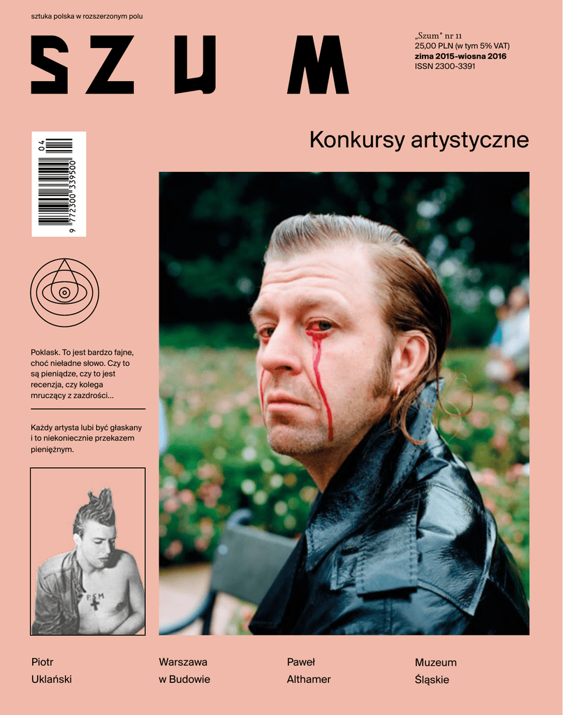 sztuka polska w rozszerzonym polu „Szum” nr 11 25,00 PLN (w tym 5% VAT) zima 2015-wiosna 2016 ISSN 2300-3391 Konkursy artystyczne Poklask. To jest bardzo fajne, choć nieładne słowo. Czy to są pieniądze, czy to jest recenzja, czy kolega mruczący z zazdrości… Każdy artysta lubi być głaskany i to niekoniecznie przekazem pieniężnym. Piotr Uklański Warszawa w Budowie Paweł Althamer Muzeum Śląskie rezydencja w Nowym Jorku | opieka kuratorska | wystawy | rezydencja w Walencji | inkubator młodych talentów | finaliści konkursu w Pawilonie Sztuki | międzynarodowe kontakty A N Z T I I URS C Y E S NK T YS Ż HKI KO T CH Ó R Y S L A D R PO TÓW CZN PO ÓLNOUDEN TYSTY 00 13 OG A ST I AR nad ów o N L p at D ZEL – e r u am 1 lau je UC r g pro w – 3 spirac t ó la n 14 estnik one i ucz iezlicz –n www.artystycznapodrozhestii.pl Monika Sosnowska, Martwa natura Fundacja Galerii Foksal, Warszawa 27.11.2015 – 30.01.2016 Projekt dofinansowany ze środków Ministra Kultury i Dziedzictwa Narodowego Dofinansowano ze środków Gminy Wrocław | www.wroclaw.pl MA 50 LAT Muzeum Sztuki w Łodzi Ogrodowa 19, Łódź msl.org.pl PARTNERZY/ PARTNERS Muzeum Sztuki w Łodzi Instytucja Samorządu Województwa Łódzkiego Współprowadzona przez Ministerstwo Kultury i Dziedzictwa Narodowego WSPÓŁPRACA / Teatr Nowy im. Kazimierza Dejmka w Łodzi 1976–2015 K. Pustola – fot. Przemysław Pokrycki Konrad Pustoła W. Fangor – fot. Agencja Gazeta Wojciech Fangor 1922–2015 Prenumerata i numery archiwalne www.magazynszum.pl/sklep 18 Mikołaj Długosz, Klara, 2015 Od redakcji tekst: Jakub Banasiak, Adam Mazur Tematem jedenastego numeru „Szumu” są konkursy artystyczne. Analizę Karoliny Plinty dotyczącą ich fenomenu zilustrował Paweł Susid. Omówienie najważniejszych konkursów – od Spojrzeń, Artystycznej Podróży Hestii przez Bielską Jesień i Rybie Oko, aż po Coming Out i Photo Diploma Awards – poprzedza krytyczną refleksję nad rolą często efektownych piarowo i nierzadko całkiem nieźle dotowanych imprez, które nadają rytm życiu artystycznemu. Tekst Plinty domyka rozpoczęty w pierwszym numerze „Szumu” cykl redakcyjnych analiz mapujących peryferyjny świat sztuki polskiej w drugiej dekadzie XXI wieku. Artystą, który w drodze na szczyt nie mógł liczyć na nagrody i oklaski publiczności, jest Piotr Uklański. Przedstawiać go nie trzeba. Okazuje się jednak, że wciąż mało o nim wiemy, a ewentualny stan naszej wiedzy opiera się raczej na plotkach i miejskich legendach niż na uporządkowanych i zweryfikowanych przez niego faktach. W numerze znajdziecie obszerną, pełną konkretów narrację biograficzną ilustrowaną znakomitymi zdjęciami Zuzy Krajewskiej oraz specjalnie wybranymi reprodukcjami mniej znanych prac Uklańskiego. Wydarzeniem jesieni była, naszym zdaniem, siódma już edycja festiwalu Warszawa w Budowie. O kuratorowanej przez Tomasza Fudalę wystawie głównej wnikliwie pogłębiającej wciąż nieukończony proces odbudowy stolicy piszą Piotr Słodkowski i Jakub Banasiak. Wprawdzie Warszawa wciąż boryka się z problemem odbudowy i reprywatyzacji, ale na mapie stołecznej kultury udaje się stworzyć zupełnie nowe instytucje. Najlepszym przykładem jest Muzeum Historii Żydów Polskich POLIN, którego architektura szybko zyskała rzesze zwolenników. My podejmujemy jednak temat narracji ekspozycyjnej POLIN, o której z krytycznej perspektywy pisze Zofia Waślicka. Temat instytucji, którym zajmujemy się od początku istnienia magazynu i który chcielibyśmy zgłębić w przyszłym roku, podejmuje także Henryk Waniek. Wybitny eseista przygląda się uważnie „kopalni cudów”, jak nazywa otwarte wiosną tego roku w Katowicach Muzeum Śląskie. Wielkie narracje muzealne omijają na razie sztukę ulicy, ale – jak wynika z tekstu teoretycznego Adama Jastrzębskiego (aka IXI Color) – również polski street art przeszedł w ostatnich latach poważną metamorfozę, wchodząc na salony, akademizując się i zajmując miejsce w rynkowej układance. Materiał ilustruje gigant sceny streetartowej, czyli Mariusz Waras. Street art i wielkie muzea to tematy zdecydowanie „miejskie”, więc dla równowagi polecamy tekst Weroniki Plińskiej o Pomniku chłopa autorstwa Daniela Rycharskiego i Szymona Maliborskiego. Pomnik, który zjechał pół Polski, trafił także do naszej stałej rubryki „Obiekt kultury”. Wnikliwi czytelnicy „Szumu” zorientują się, że zrezygnowaliśmy z felietonów, które zastąpiły strony przygotowane specjalnie dla nas przez artystów Rafała Jakubowicza i Piotra Machę, dzięki czemu rozszerzona została stała już rubryka „Do zobaczenia”, w której tym razem znaleźć można niezwykłą komiksową narrację dokumentującą kolejną odsłonę Kongresu rysowników Pawła Althamera. Tradycyjnie w „Szumie” znajdziecie kalendarium wydarzeń, na które warto się wybrać w kolejnym kwartale, oraz jedyny w swoim rodzaju krytyczny przegląd tego, co miało miejsce minionej jesieni. Gdzie jeśli nie w „Szumie” znajdziecie 30 mocnych recenzji wystaw, książek i performansów, o których mówiło się tej jesieni? Oczywiście nie wszystkie będą się podobały kuratorom, dyrektorom i galerzystom, ale wszystkie powinniście przeczytać. W ostatnim w 2015 roku „Wskazanym” znajdziecie rekomendacje Andrzeja Szczerskiego, profesora krakowskiego IHS, kuratora i historyka środkowoeuropejskiej architektury modernistycznej i prezesa polskiej sekcji AICA. 19 II triennale sztuki pomorskiej organizator Państwowa Galeria Sztuki w Sopocie 22.01.2016 wernisaż wystawy finałowej z ogłoszeniem nazwisk laureatów konkursu jury : prof. Jarosław Modzelewski – Malarstwo Piotr Sarzyński – Grafika, Rysunek prof. Adam Myjak – Rzeźba dr Adam Mazur – Fotografia / Multimedia wystawa czynna od 23 stycznia 2016 do 22 lutego 2016 od wtorku do niedzieli w godzinach 11:00 - 19:00 Państwowa Galeria Sztuki Sop