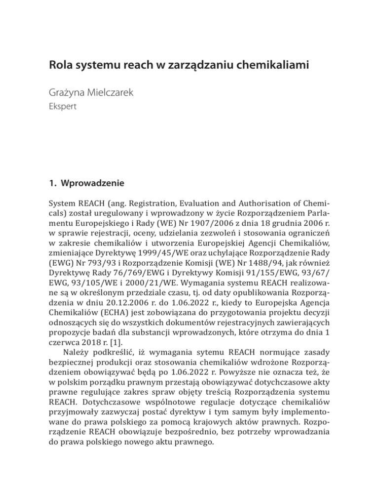 Rola systemu reach w zarządzaniu chemikaliami Grażyna Mielczarek Ekspert 1. Wprowadzenie System REACH (ang. Registration, Evaluation and Authorisation of Chemicals) został uregulowany i wprowadzony w życie Rozporządzeniem Parlamentu Europejskiego i Rady (WE) Nr 1907/2006 z dnia 18 grudnia 2006 r. w sprawie rejestracji, oceny, udzielania zezwoleń i stosowania ograniczeń w zakresie chemikaliów i utworzenia Europejskiej Agencji Chemikaliów, zmieniające Dyrektywę 1999/45/WE oraz uchylające Rozporządzenie Rady (EWG) Nr 793/93 i Rozporządzenie Komisji (WE) Nr 1488/94, jak również Dyrektywę Rady 76/769/EWG i Dyrektywy Komisji 91/155/EWG, 93/67/ EWG, 93/105/WE i 2000/21/WE. Wymagania systemu REACH realizowane są w określonym przedziale czasu, tj. od daty opublikowania Rozporządzenia w dniu 20.12.2006 r. do 1.06.2022 r., kiedy to Europejska Agencja Chemikaliów (ECHA) jest zobowiązana do przygotowania projektu decyzji odnoszących się do wszystkich dokumentów rejestracyjnych zawierających propozycje badań dla substancji wprowadzonych, które otrzyma do dnia 1 czerwca 2018 r. [1]. Należy podkreślić, iż wymagania sytemu REACH normujące zasady bezpiecznej produkcji oraz stosowania chemikaliów wdrożone Rozporządzeniem obowiązywać będą po 1.06.2022 r. Powyższe nie oznacza też, że w polskim porządku prawnym przestają obowiązywać dotychczasowe akty prawne regulujące zakres spraw objęty treścią Rozporządzenia systemu REACH. Dotychczasowe wspólnotowe regulacje dotyczące chemikaliów przyjmowały zazwyczaj postać dyrektyw i tym samym były implementowane do prawa polskiego za pomocą krajowych aktów prawnych. Rozporządzenie REACH obowiązuje bezpośrednio, bez potrzeby wprowadzania do prawa polskiego nowego aktu prawnego. 80 Grażyna Mielczarek 2. Szczegółowe założenia i cele systemu REACH Celem systemu REACH jest zapewnienie wysokiego poziomu ochrony zdrowia ludzkiego i środowiska przyrodniczego, a także swobodny przepływ substancji w jej pierwotnej postaci, jako składnika mieszaniny lub w wyrobach, przy jednoczesnym wsparciu konkurencyjności i innowacyjności europejskiego przemysłu chemicznego. Rozporządzenie to wspiera również rozwój alternatywnych metod oceny zagrożeń stwarzanych przez określone substancje. Na każdym etapie istnienia substancji w jej pierwotnej postaci lub jako składnika mieszaniny należy zapewnić bezpieczeństwo chemiczne, zaś zagrożenia zidentyfikowane i przypisane do określonych chemikaliów powinny pozostać potencjalne. Zgodnie z art. 1 rozporządzenia systemu REACH to do producentów, importerów i dalszych użytkowników należy zagwarantowanie, aby substancje, które produkują, wprowadzają do obrotu lub stosują nie wpływały w sposób szkodliwy na zdrowie człowieka ani na środowisko przyrodnicze. Przepisy wspomnianego Rozporządzenia zalecają przede wszystkim stosowanie zasady ostrożności. Ponadto podmioty, które stosują substancje lub ich mieszaniny muszą podejmować niezbędne środki kontroli zgodnie z oceną stwarzanego przez nie ryzyka i przekazywać stosowne zalecenia innym uczestnikom łańcucha dostaw. Należy wyraźnie podkreślić, że Rozporządzenie REACH dotyczy praktycznie wszystkich firm, a nie tylko przedsiębiorstw z branży chemicznej, co sądzono na początku okresu realizacji podstawowych wymagań systemu, tj. rejestracji substancji. Kwestią rozróżniającą rodzaj zastosowania jest ilość i zakres obowiązków, które należy spełnić. Najwięcej pracy przy wdrażaniu tego systemu mają producenci i importerzy, natomiast najmniej dystrybutorzy, których działania ograniczają się do przekazywania informacji w łańcuchu dostaw. Bardzo ważną rolę, która została pominięta na samym początku wdrażania systemu odgrywają dalsi użytkownicy. Podmioty, dla których znajomość i stosowanie zasad bezpieczeństwa chemicznego jest kluczowe dla zdrowia ich samych, jak i ich potomstwa. Warto podkreślić, że Rozporządzenie REACH dokonuje rozróżnienia pomiędzy rolami w łańcuchu dostaw substancji w ich postaci pierwotnej, jako składnika mieszanin lub znajdującego się w wyrobach, wynikających z działalnością danego przedsiębiorstwa. Substancje chemiczne są podstawowymi elementami budowy żywych organizmów. Powstają one zarówno w środowisku przyrodniczym, jak i w żywych organizmach. Philippus Aureolus Theophrastus Bombastus von Hoenheim (1493–1551), niemiecki lekarz i przyrodnik znany powszechnie Rola systemu REACH w zarządzaniu chemikaliami PRODUCENT SUBSTANCJI 81 IMPORTER SUBSTANCJI FORMULATOR DYSTRYBUTOR DALSZY UŻYTKOWNIK Rys. 1. Podmioty w systemie REACH jako Paracelsus, jest uważany za twórcę nowoczesnej medycyny i toksykologii. Jest on autorem stwierdzenia, że wszystko jest trucizną i nie jest trucizną, ponieważ to wielkość dawki określa, jaka rolą pełni określona substancja [2]. Spektakularnym tego przykładem jest pospolita sól kuchenna (NaCl), która przyjęta jednorazowo przez człowieka w ilości 40 g może prowadzić do zgonu. Stwierdzenie Paracelsusa pozostaje nadal aktualne i jednocześnie uświadamia nam, że nie można całkowicie wyeliminować wszystkich zagrożeń związanych ze stosowaniem substancji chemicznych. Nasuwa się tutaj ogólny wniosek, że nie ma substancji chemicznych w pełni bezpiecznych zarówno dla ludzi, jak i środowiska przyrodniczego [2]. Osiągnięcia współczesnej nauki wskazują również na inne kryteria, poza dawką, które dzielą substancje chemiczne pod względem ich szkodliwości, wyróżniając ich kategorie zagrożeń, np. toksyczne, wybuchowe, rakotwórcze itp. Realizacja wymagań systemu REACH przez wszystkie powyżej wyszczególnione podmioty na każdym etapie istnienia substancji w jej postaci własnej lub w postaci mieszaniny pozwala na zwiększenie bezpieczeństwa chemicznego. Zapewnienie bezpieczeństwa chemicznego człowieka i środowiska przyrodniczego jest, jak wcześnie