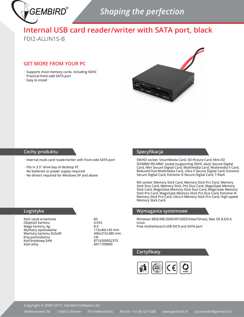 Internal USB card reader/writer with SATA port, black FDI2-ALLIN1S-B GET MORE FROM YOUR PC - Supports most memory cards, including SDHC - Practical front-side SATA port - Easy to install Cechy produktu Specyfikacja - Internal multi-card reader/writer with front-side SATA port SM/XD socket: SmartMedia Card, XD-Picture Card, Mini XD SD/MMC/RS-MMC socket (supporting SDHC also): Secure Digital Card, Mini Secure Digital Card, Multimedia Card, Multimedia II Card, Reduced-Size Multimedia Card, Ultra II Secure Digital Card, Extreme Secure Digital Card, Extreme III Secure Digital Card, T-flash - Fits in 3.5" drive bay of desktop PC - No batteries or power supply required - No drivers required for Windows XP and above MS socket: Memory Stick Card, Memory Stick Pro Card, Memory Stick Duo Card, Memory Stick, Pro Duo Card, MagicGate Memory Stick Card, MagicGate Memory Stick Duo Card, MagicGate Memory Stick Pro Card, MagicGate Memory Stick Pro Duo Card, Extreme III Memory Stick Pro Card, Ultra II Memory Stick Pro Card, High-speed Memory Stick Card Logistyka Wymagania systemowe Ilość sztuk w kartonie Objętość kartonu Waga kartonu, kg Wymiary opakowania: Wymiary kartonu DxSxW Kraj pochodzenia Kod kreskowy EAN Kod celny 60 0.053 8.4 115x40x145 mm 440x315x380 mm CN 8716309052375 8471709890 Windows 98SE/ME/2000/XP/2003/Vista/7(max), Mac OS 8.6/9.X, Linux Free motherboard USB IDC9 and SATA port Certyfikaty Copyright © 2009–2017, Gembird Software Ltd. ! " # $ ! "