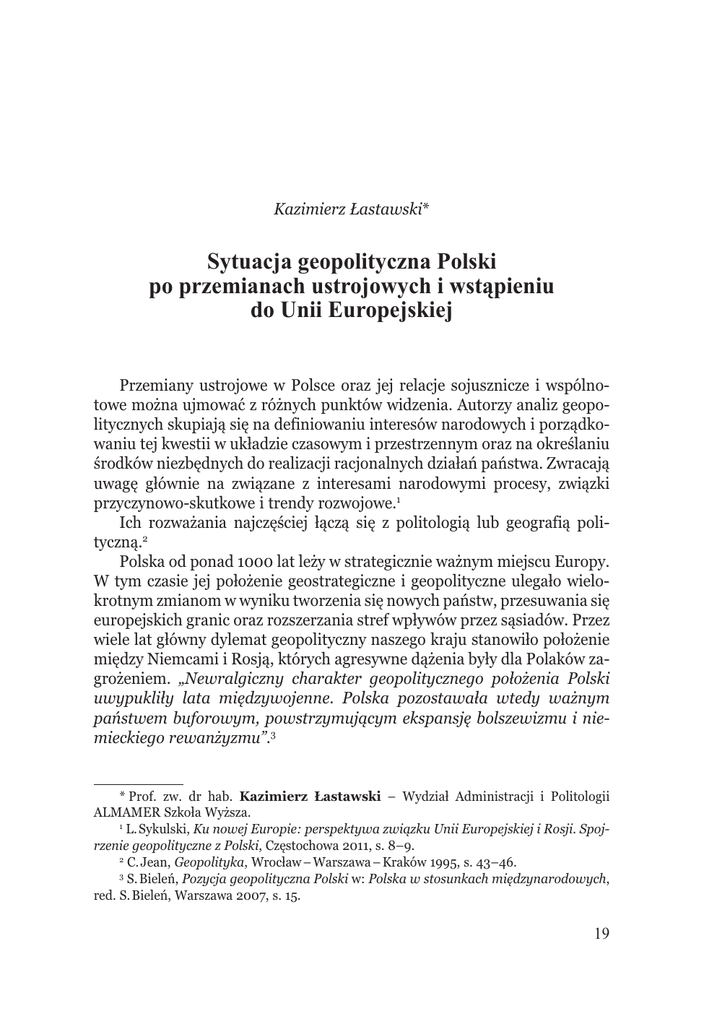 Kazimierz Łastawski* Sytuacja geopolityczna Polski po przemianach ustrojowych i wstąpieniu do Unii Europejskiej Przemiany ustrojowe w Polsce oraz jej relacje sojusznicze i wspólnotowe można ujmować z różnych punktów widzenia. Autorzy analiz geopolitycznych skupiają się na definiowaniu interesów narodowych i porządkowaniu tej kwestii w układzie czasowym i przestrzennym oraz na określaniu środków niezbędnych do realizacji racjonalnych działań państwa. Zwracają uwagę głównie na związane z interesami narodowymi procesy, związki przyczynowo-skutkowe i trendy rozwojowe.1 Ich rozważania najczęściej łączą się z politologią lub geografią polityczną.2 Polska od ponad 1000 lat leży w strategicznie ważnym miejscu Europy. W tym czasie jej położenie geostrategiczne i geopolityczne ulegało wielokrotnym zmianom w wyniku tworzenia się nowych państw, przesuwania się europejskich granic oraz rozszerzania stref wpływów przez sąsiadów. Przez wiele lat główny dylemat geopolityczny naszego kraju stanowiło położenie między Niemcami i Rosją, których agresywne dążenia były dla Polaków zagrożeniem. „Newralgiczny charakter geopolitycznego położenia Polski uwypukliły lata międzywojenne. Polska pozostawała wtedy ważnym państwem buforowym, powstrzymującym ekspansję bolszewizmu i niemieckiego rewanżyzmu”.3 * Prof. zw. dr hab. Kazimierz Łastawski – Wydział Administracji i Politologii ALMAMER Szkoła Wyższa. 1 L. Sykulski, Ku nowej Europie: perspektywa związku Unii Europejskiej i Rosji. Spojrzenie geopolityczne z Polski, Częstochowa 2011, s. 8–9. 2 C. Jean, Geopolityka, Wrocław – Warszawa – Kraków 1995, s. 43–46. 3 S. Bieleń, Pozycja geopolityczna Polski w: Polska w stosunkach międzynarodowych, red. S. Bieleń, Warszawa 2007, s. 15. 19 Studia Europejskie, 1/2011 1. Charakterystyka aktualnej sytuacji geopolitycznej i ekonomicznej Polski Od zakończenia II wojny światowej Polska znajdowała się w trzech różnych sytuacjach geopolitycznych:4 a) była członkiem Układu Warszawskiego i RWPG, uzależnionych od Związku Radzieckiego. W ramach ówczesnego bloku wschodniego wpływała na stabilizację systemu jałtańsko-poczdamskiego; b) po rozwiązaniu Układu Warszawskiego, RWPG i Związku Radzieckiego funkcjonowała wśród nowych sąsiadów, poza układami sojuszniczymi. Znalazła się – jak dowodzi Peter M.R. Stirk – w strefie „rozrzedzonego bezpieczeństwa”,5 nazywanej też strefą „zbrojnej neutralności”. Na wschodzie graniczyła ze Wspólnotą Niepodległych Państw; c) nową sytuację geopolityczną określiło przyjęcie jej do NATO i Unii Europejskiej oraz przesunięcie ich wpływów do wschodniej granicy Polski, która stała się zarazem granicą sojuszu i Wspólnoty. Do rozpoczęcia przemian ustrojowych w 1989 r. Polska miała tylko trzech sąsiadów – ZSRR, Czechosłowację i NRD. Formalnie należała do zwycięzców w II wojnie światowej, ale poniosła dotkliwe straty ludnościowe, gospodarcze i terytorialne. Obszar państwa polskiego przesunął się o kilkaset kilometrów w kierunku zachodnim i zmniejszył o jedną piątą – z 388,6 do 312,7 tys. km². Na wschodzie Polska straciła 180 tys. km², natomiast na zachodzie i północy uzyskała rekompensatę wielkości 104 tys. km². Po 1991 r. nastąpiły zasadnicze zmiany geopolityczne wokół Polski, powstały nowe państwa sąsiedzkie. W latach 1989–1993 kształtowała się również nowa polityka bezpieczeństwa kraju, zmierzająca do uniezależnienia się od Moskwy w sferze wojskowej i politycznej. Proces ten ułatwiło odchodzenie od dwubiegunowego podziału kontynentu europejskiego oraz rozszerzenie zakresu wzajemnego zaufania między mocarstwami. Duże znaczenie miały też zmiany zapoczątkowane przez Michaiła Gorbaczowa i odstąpienie głównych mocarstw od koncepcji „równowagi strachu” na rzecz koncepcji równowagi interesów.6 Głównym celem Polski, która po opuszczeniu Układu Warszawskiego znalazła się w strefie „rozrzedzonego bezpieczeństwa”, stało się przystąpie4 Wcześniejsze idee i koncepcje geopolityczne Polski rozważali głównie tacy autorzy jak: Wacław Nałkowski, Eugeniusz Romer, Włodzimierz Wakar, Roman Dmowski, Józef Piłsudski, Adolf Bocheński, Władysław Studnicki i Stanisław Leszczyki, zob.: Z. Lach, J. Skrzyp, Geopolityka i geostrategia, Warszawa 2007, s. 122–160. 5 P.M.R. Stirk, A History of European Integration since 1914, London 1996, s. 254–256. 6 S. Bieleń, Pozycja geopolityczna Polski, op.cit., s. 16. 20 K. Łastawski, Sytuacja geopolityczna Polski po przemianach ustrojowych... nie do struktur europejskich, NATO i Unii Zachodnioeuropejskiej (UZE). Po akcesji do NATO (1999 r.) i Unii Europejskiej (2004 r.) kolejny raz zmieniło się geopolityczne otoczenie kraju. Aktualną sytuację geopolityczną Polski określają głównie:7 a) sfera kontynentalna, z główną w niej rolą Unii Europejskiej i NATO, b) sfera subregionalna, obejmująca przede wszystkim relacje z sąsiadami. Pewien wpływ na sytuację geopolityczną Polski mają również zjawiska globalizacji. Część oddziałuje na nią pozytywnie (nowe technologie, szybkie możliwości przekazu informacji i łączności), ale większość (terroryzm międzynarodowy, niedobory surowcowe, przestępczość transnarodowa, proliferacja broni masowego rażenia) ją komplikuje. Polska od ponad 1000 lat jest zaliczana do państw Europy Środkowej lub Środkowo-Wschodniej.8 Położenie geograficzne włącza nasz kraj do Europy Środkowej, natomiast dzieje polityczne bardziej umiejscawiają go w Europie ŚrodkowoWschodniej. Wybitny znawca tej problematyki Piotr Wandycz wskazuje na szczególną rolę Polski, Czech, Słowacji i Węgier w tym regionie.9 Najczęściej mianem Europy Środkowej określa się obszar położony między Renem na zachodzie, Bałtykiem na północy i Dunajem oraz Alpami na południu.10 Więcej rozbieżności występuje