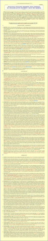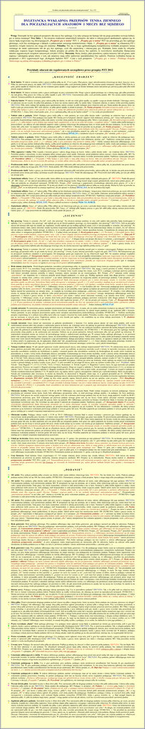 „Dyletancka wykładnia przepisów tenisa ziemnego dla początkujących amatorów i meczy bez sędziego” ostatnia zmiana: 24.02.2013 „No dobrze, ale jaką metodą wybierzemy metodę głosowania?” Rejs 1970 ────────────────────────────────────────────────── dokument ze strony: www.teniswregionie.pl premiera: www.teniswregionie.pl 02.2013 ostatnia zmiana: 24.02.2013 DYLETANCKA WYKŁADNIA PRZEPISÓW TENISA ZIEMNEGO DLA POCZĄTKUJĄCYCH AMATORÓW I MECZY BEZ SĘDZIEGO A. Kowalewski Wstęp. Dziesiątki lat bez spójnych przepisów dla meczy bez sędziego. Czy taka sytuacja nie hamuje lub nie psuje pośrednio rozwoju kultury gry w tenisa ziemnego? Trzy fakty. 1. Na otwarciu większości amatorskich turniejów, ale także w rekreacyjnych spotkaniach, ogłasza się, że mecze będą rozgrywane wg obowiązujących „Przepisów gry w tenisa” PZT. 2. „Przepisy gry w tenisa” PZT nie przewidują gry bez sędziego głównego, czyli bez orzekającego o faktach, a jednocześnie zawierają niedomówienia i błędy. 3. „Przepisy gry w tenisa” są własnością ITF i narodowe związki tenisowe nie mogą ich zmieniać. Pobudka. Nie ma w kraju ogólnodostępnej kompleksowej wykładni przepisów tenisa ziemnego do nauki sędziowania lub do gry bez sędziego, czyli dla amatorskiej i rekreacyjnej gry. Wykładni, która miała by oficjalne redakcyjne wsparcie kogoś kompetentnego. Jedyne przepisy po polsku dla meczy bez sędziów, to wyrywkowe nieoficjalne tłumaczenia tekstów zagranicznych związków tenisowych (zwykle USTA). Marzenia. Może, kiedyś, jakiś prawdziwy sędzia tenisowy lub ich grono, sami napiszą i udostępnią spójne teksty o tym, jak amatorzy mają sobie sędziować (paradoksalnie) bez sędziów. Poniższa wykładnia bazuje na przepisach z 2012 sygnowanych logo „Kolegium Sędziów PZT”. Cytat z tych przepisów: "„Przepisy gry w tenisa” Polskiego Związku Tenisowego są jedyną obowiązującą wykładnią przepisów gry w tenisa w Polsce." Przykłady zdarzeń nie regulowanych szczegółowo przez przepisy PZT 2012 (znaczenie kolorów: decyzja bezpodstawna, spekulacja; decyzja oparta na rekreacyjnej praktyce; cytaty z oficjalnych przepisów PZT 2012; cytaty z innych przepisów) ▲ ▼ „K O LE JNO ŚĆ Z DARZ EŃ” 1. Brak faktów. W trakcie wymiany jeden z graczy podbija piłkę na ok. 15 m w górę. Obaj gracze, zajęci odzyskiwaniem równowagi po akcji, tracą ją z oczu. Piłka, ku zdziwieniu graczy, nie spada. DECYZJA: Unieważnienie piłki, czyli powtórka punktu. BO: Nie można ustalić kolejności zdarzeń. Piłka była by w polu, gdyby upadła na właściwe pole, ale nie wiadomo gdzie upadła i czego najpierw po drodze dotknęła (może nad polem gry porwał ją jakiś ptak albo trafił pocisk snajpera amatora). 2. Brak faktów. W trakcie wymiany jeden z graczy poślizguje się przy wykonaniu loba. Drugi z graczy upada potykając się o własną nogę, gdy piłka przelatuje mu nad głową. Obaj gracze nie widzą czy piłka wpadła w pole. DECYZJA: Unieważnienie piłki, czyli powtórka punktu. BO: Nie można ustalić kolejności zdarzeń. Sytuacja podobna do opisanej poprzednio. 3. Fabryka faktów. W trakcie wymiany, gracz uderza piłkę tak daleko, że nikt nie widzi gdzie spadła, czy spadła i czego po drodze dotknęła. Uderzający mówi, że uderzenie mu nie wyszło, bo piłka była pęknięta, że skoro nie można znaleźć piłki, by ustalić fakty i kolejność zdarzeń, to należy zrobić powtórkę punktu. DECYZJA: Piłki, które znikają lub upadają poza ogrodzeniem, należy uważać za piłki trafiające poza właściwe pole gry. Strata punktu dla gracza, który nie trafił w pole gry przeciwnika. BO: Jeśli założyć, że piłka gdzieś spadła, to działa tu przepis „24. Punkty przegrane Zawodnik przegrywa punkt, jeżeli: […] c. odbije piłkę będącą w grze w taki sposób, że trafi ona w ziemię lub jakikolwiek przedmiot poza właściwym polem gry (przed zetknięciem się z kortem);”. DYSKUSJA: 1. Gracz, który stracił punkt, pyta: „A co z pękniętą piłką, nikt jej nie będzie szukał?”. 2. Czy woda jest przedmiotem? 4. Nabicie ciała w podaniu. Debel. Podający gracz trafia piłką w ciało partnera, po czym piłka dotyka siatki i przelatuje na właściwe karo w polu gry przeciwników. DECYZJA: Para podająca traci punkt. BO: Istotna jest tu kolejność zdarzeń: najpierw było dotknięcie, później „net”. Gracz trafił partnera, a w przypadku bezpośredniego dotknięcia piłką ciała należy wywołać stratę punktu dla dotykającego piłki. Mówi o tym przepis „24. Zawodnik przegrywa punkt, jeżeli: […] i. piłka będąca w grze dotknie jego samego bądź czegokolwiek, co ma on na sobie lub trzyma, z wyjątkiem rakiety;”. Gdyby piłka trafiła któregoś z przeciwników i po odbiciu od ciała dotknęła najpierw siatki a później właściwego dla podającego kara, to wtedy punkt dla pary podającej. Tu też nie był by ważny fakt „niby netu”, bo najpierw był fakt „dotknięcie piłki”. DYSKUSJA: 1. Można też powołać się na przepis „24. Punkty przegrane […] Przypadek 7: Podana piłka trafia w przeciwnika lub w grze podwójnej w partnera odbierającego, zanim dotknęła ziemi. Kto wygrywa punkt? Decyzja: Podający wygrywa punkt, o ile nie zachodzi konieczność unieważnienia podania.”, ale w tym przykładzie pojawił się „niby net” i nie wiadomo, co jest ważniejsze: „trafienie partnera przeciwnika” czy „unieważnienie podania”. 2. Zobacz dyskusję DETAL 24.i o zasadności użycia w przepisie „24.i” terminu „piłka w grze”. 5. Nabicie rakiety w podaniu. Debel. Podający gracz trafia piłką w rakietę partnera, po czym piłka dotyka siatki i spada na właściwe dla podającego karo. DECYZJA: Para podająca traci punkt. BO: Istotna jest tu kolejność zdarzeń: najpierw