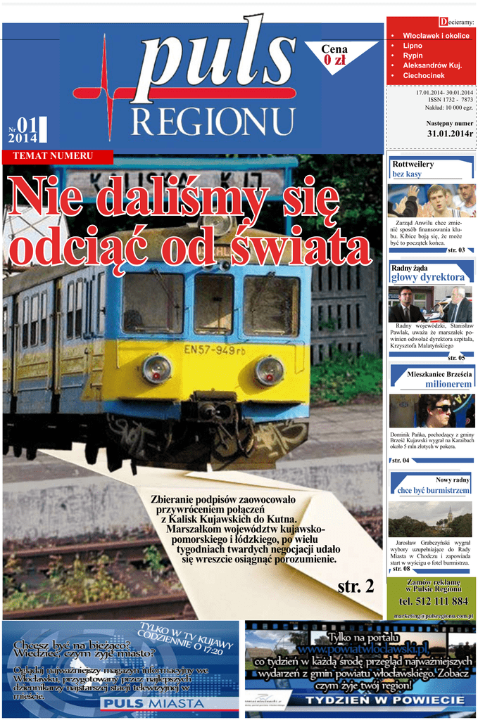 D ocieramy: Cena 0 zł • • • • • Włocławek i okolice Lipno Rypin Aleksandrów Kuj. Ciechocinek 17.01.2014- 30.01.2014 ISSN 1732 - 7873 Nakład: 10 000 egz. 01 2014 Następny numer Nr 31.01.2014r TEMAT NUMERU Nie daliśmy się odciąć od świata Rottweilery bez kasy Zarząd Anwilu chce zmienić sposób finansowania klubu. Kibice boją się, że może być to początek końca. str. 03 Radny żąda głowy dyrektora Radny wojewódzki, Stanisław Pawlak, uważa że marszałek powinien odwołać dyrektora szpitala, Krzysztofa Malatyńskiego str. 05 Mieszkaniec Brześcia milionerem Dominik Pańka, pochodzący z gminy Brześć Kujawski wygrał na Karaibach około 5 mln złotych w pokera. str. 04 Nowy radny Zbieranie podpisów zaowocowało przywróceniem połączeń z Kalisk Kujawskich do Kutna. Marszałkom województw kujawskopomorskiego i łódzkiego, po wielu tygodniach twardych negocjacji udało się wreszcie osiągnąć porozumienie. str. 2 chce być burmistrzem Jarosław Grabczyński wygrał wybory uzupełniające do Rady Miasta w Chodczu i zapowiada start w wyścigu o fotel burmistrza. str. 08 Zamów reklamę w Pulsie Regionu tel. 512 111 884 [email protected] 02 Włocławek 17 stycznia 2014- 30 stycznia 2014 Puls Regionu Grali nie dla rekordu, lecz z serca www.pulsregionu.com.pl „Światełkiem do nieba” pod Halą Mistrzów zakończył się 22. Finał Wielkiej Orkiestry Świątecznej Pomocy we Włocławku. Emocje rosły wraz z liczeniem pieniędzy przynoszonych do sztabu orkiestry przez wolontariuszy. - Kwota rośnie cały czas i mam nadzieję, że do końca tygodnia, po podliczeniu wszystkich aukcji w mieście i powiecie, będzie o wiele większa - podkreśla Beata Krajewska, szefowa włocławskiego sztabu WOŚP. - Największe podziękowania kieruję do tych, którzy po raz kolejny nas nie zawiedli. Niezależnie od wieku i motywacji mieszkańcy naszego miasta starali się orkiestrze jak najbardziej pomóc. ” kąpiel „Kujawskich Morsów”. Finał po raz kolejny pokazał, że choć czasem jesteśmy podzieleni, to gdy trzeba potrafimy się zjednoczyć. W tym roku fundacja Jurka Owsiaka zbierała pieniądze na sprzęt dla ratowania noworodków i już po raz drugi na sprzęt dla oddziałów geriatrycznych. zebrano niemal 140 tys złotych! Dane kontaktowe: [email protected] Redaktor naczelna: Redakcja: Joanna Lewandowska Barbara Szmejter Zastępca redaktora naczelnego: Monika Grzanka Renata Kończyńska Przez ostatnie kilka miesięcy temat połączeń na linii numer 18 do i z Kutna spędzał sen z powiek pasażerom pociągów. Powód? Jak zwykle chodziło o pieniądze. Stacja widmo nów przeznaczających w większości finanse na alkohol i stwierdzili, że skoro na to mają, to dlaczego nie dać kilku groszy na wsparcie orkiestry. To mimo wszystko budujące - mówi 45-letni Krzysztof. 54 231 17 77 512 111 648 Nie pozwoliliśmy odciąć się od świata! Tym razem spierali się o nie marszałkowie dwóch graniczących ze sobą województw: kujawsko-pomorskiego i łódzkiego. „Trzeba chodzić po takich dzielnicach, gdzie jest mało wolontariuszy, tam ludzie chętniej pomagają ” - twierdzi 13-letni Marcel. „Trzy lata temu sprzęt przekazany przez WOŚP uratował mojemu bratu życie - dodaje 23-letnia Aleksandra. „Popieram akcję w”całej rozciągłości, szczególnie, że jestem osobą starszą i nigdy nie wiadomo, kiedy będę potrzebowała pomocy” - podkreśla 68-letnia Bożena. „W grupie zawsze można więcej. Skoro państwo nie może, to najbiedniejsi muszą pomóc i ratować najsłabszych Taka jest ta nasza polska rzeczywistość. - twierdzi 57-letni Zdzisław. ” „Trzeba też mieć przede wszystkim zaufanie do tego przedsięwzięcia, inaczej nie byłoby tylu ludzi dających choćby skromne datki” -zauważa 36-letni Kamil. „Staliśmy pod jednym z włocławskich sklepów, podeszło do nas kilku pa- Kalendarz WOŚP-owych imprez wypełniły poza tradycyjną zbiórką pieniędzy - rajd pieszy i rowerowy, strzelnica paintballowa, drifting, nurkowanie, nauka udzielania pierwszej pomocy, TEMAT NUMERU Laura Nawrocka Marcin Kmieć Iwona Bluszcz Reklama i ogłoszenia: [email protected] Ewa Śmigielska tel:512 111 884 Magdalena Koźba tel. 54 231 17 77 Sławomir Mistera tel. 512 - 111 - 686 Każda podróż w kierunku Łodzi od 31-ego grudnia mogła skończyć się na maleńkiej stacji Kaliska Kujawskie. Dalej? Pieszo, stopem, w najlepszym razie autobusem dalekobieżnym, jeśli byłyby wolne miejsca. - Tylko pieniądz się liczy, a nie ludzie - podkreśla Zdzisława Banasik, włocławianka podróżująca co tydzień do Łodzi.- Teraz taniej i łatwiej będzie dostać się samolotem z Gdańska do Krakowa, niż dojechać do Warszawy z Włocławka. - Kolejny problem - dodaje Jacek Miłkowski, studiujący w Łowiczu.- Nie dość, że likwidują połączenia, to na dodatek proponują przejazdy drogimi, obwarowanymi obowiązkiem wykupienia miejscówek pośpiesznymi pociągami, bo te mają jeździć normalnie. - Czy naprawdę tak trudno się porozumieć? Nie rozumiem tego wytyczania granic. Prawie jak dawne zabory - stwierdza oburzona Alicja Waśkowska, księgowa z Łodzi. Co najmniej dwadzieścia tysięcy pasażerów korzystających co miesiąc z sześciu par pociągów kursujących na spornej trasie przeglądało rozkład jazdy pociągów z przerażeniem. Pomogli samorządowcy Taka wizja martwiła także zaangażowaną w obsługę wspomnianej trasy spółkę Arriva RP. Na początku stanowisko marszałka województwa łódzkiego było takie, że to my powinniśmy być podwykonawcą Przewozów Regionalnych, a nie posiadać bezpośrednią umowę - stwierdził Damian Grabowski, prezes Arrivy RP.- Takie porozumienie de facto wypracowaliśmy, ale pozostała kwestia finansowania przejazdów. Zdjęcia: W porozumienie między marszałkami od początku wierzył starosta włocławski Kazimierz Kaca. Wraz z wójtami i burmistrzami postanowił zawalczyć o to, by mieszkańcy okol