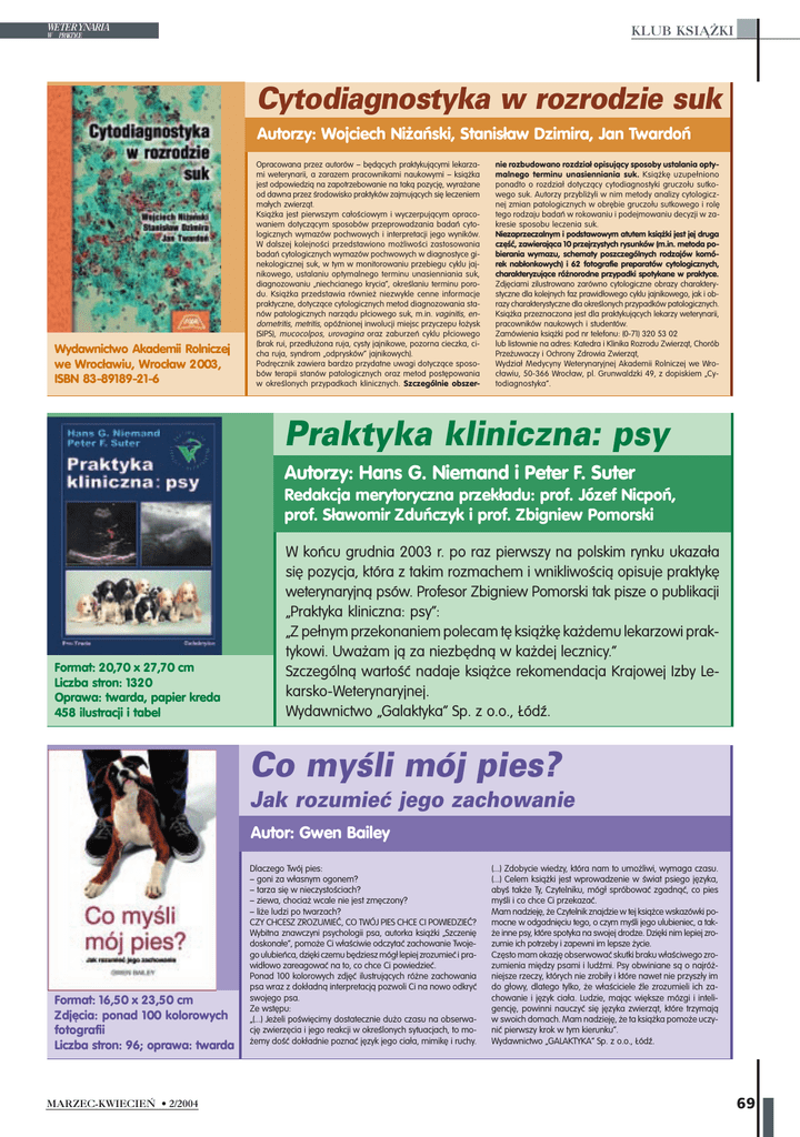 WETER YNARIA W KLUB KSI¥¯KI PRAKTYCE Cytodiagnostyka w rozrodzie suk Autorzy: Wojciech Niżański, Stanisław Dzimira, Jan Twardoń Wydawnictwo Akademii Rolniczej we Wrocławiu, Wrocław 2003, ISBN 83−89189−21−6 Opracowana przez autorów – będących praktykującymi lekarza− mi weterynarii, a zarazem pracownikami naukowymi – książka jest odpowiedzią na zapotrzebowanie na taką pozycję, wyrażane od dawna przez środowisko praktyków zajmujących się leczeniem małych zwierząt. Książka jest pierwszym całościowym i wyczerpującym opraco− waniem dotyczącym sposobów przeprowadzania badań cyto− logicznych wymazów pochwowych i interpretacji jego wyników. W dalszej kolejności przedstawiono możliwości zastosowania badań cytologicznych wymazów pochwowych w diagnostyce gi− nekologicznej suk, w tym w monitorowaniu przebiegu cyklu jaj− nikowego, ustalaniu optymalnego terminu unasienniania suk, diagnozowaniu „niechcianego krycia”, określaniu terminu poro− du. Książka przedstawia również niezwykle cenne informacje praktyczne, dotyczące cytologicznych metod diagnozowania sta− nów patologicznych narządu płciowego suk, m.in. vaginitis, en− dometritis, metritis, opóźnionej inwolucji miejsc przyczepu łożysk (SIPS), mucocolpos, urovagina oraz zaburzeń cyklu płciowego (brak rui, przedłużona ruja, cysty jajnikowe, pozorna cieczka, ci− cha ruja, syndrom „odprysków” jajnikowych). Podręcznik zawiera bardzo przydatne uwagi dotyczące sposo− bów terapii stanów patologicznych oraz metod postępowania w określonych przypadkach klinicznych. Szczególnie obszer− nie rozbudowano rozdział opisujący sposoby ustalania opty− malnego terminu unasienniania suk. Książkę uzupełniono ponadto o rozdział dotyczący cytodiagnostyki gruczołu sutko− wego suk. Autorzy przybliżyli w nim metody analizy cytologicz− nej zmian patologicznych w obrębie gruczołu sutkowego i rolę tego rodzaju badań w rokowaniu i podejmowaniu decyzji w za− kresie sposobu leczenia suk. Niezaprzeczalnym i podstawowym atutem książki jest jej druga część, zawierająca 10 przejrzystych rysunków (m.in. metoda po− bierania wymazu, schematy poszczególnych rodzajów komó− rek nabłonkowych) i 62 fotografie preparatów cytologicznych, charakteryzujące różnorodne przypadki spotykane w praktyce. Zdjęciami zilustrowano zarówno cytologiczne obrazy charaktery− styczne dla kolejnych faz prawidłowego cyklu jajnikowego, jak i ob− razy charakterystyczne dla określonych przypadków patologicznych. Książka przeznaczona jest dla praktykujących lekarzy weterynarii, pracowników naukowych i studentów. Zamówienia książki pod nr telefonu: (0−71) 320 53 02 lub listownie na adres: Katedra i Klinika Rozrodu Zwierząt, Chorób Przeżuwaczy i Ochrony Zdrowia Zwierząt, Wydział Medycyny Weterynaryjnej Akademii Rolniczej we Wro− cławiu, 50−366 Wrocław, pl. Grunwaldzki 49, z dopiskiem „Cy− todiagnostyka”. Praktyka kliniczna: psy Autorzy: Hans G. Niemand i Peter F. Suter Redakcja merytoryczna przekładu: prof. Józef Nicpoń, prof. Sławomir Zduńczyk i prof. Zbigniew Pomorski Format: 20,70 x 27,70 cm Liczba stron: 1320 Oprawa: twarda, papier kreda 458 ilustracji i tabel W końcu grudnia 2003 r. po raz pierwszy na polskim rynku ukazała się pozycja, która z takim rozmachem i wnikliwością opisuje praktykę weterynaryjną psów. Profesor Zbigniew Pomorski tak pisze o publikacji „Praktyka kliniczna: psy”: „Z pełnym przekonaniem polecam tę książkę każdemu lekarzowi prak− tykowi. Uważam ją za niezbędną w każdej lecznicy.” Szczególną wartość nadaje książce rekomendacja Krajowej Izby Le− karsko−Weterynaryjnej. Wydawnictwo „Galaktyka” Sp. z o.o., Łódź. Co myśli mój pies? Jak rozumieć jego zachowanie Autor: Gwen Bailey Format: 16,50 x 23,50 cm Zdjęcia: ponad 100 kolorowych fotografii Liczba stron: 96; oprawa: twarda MARZEC-KWIECIEÑ 2/2004 Dlaczego Twój pies: – goni za własnym ogonem? – tarza się w nieczystościach? – ziewa, chociaż wcale nie jest zmęczony? – liże ludzi po twarzach? CZY CHCESZ ZROZUMIEĆ, CO TWÓJ PIES CHCE CI POWIEDZIEĆ? Wybitna znawczyni psychologii psa, autorka książki „Szczenię doskonałe”, pomoże Ci właściwie odczytać zachowanie Twoje− go ulubieńca, dzięki czemu będziesz mógł lepiej zrozumieć i pra− widłowo zareagować na to, co chce Ci powiedzieć. Ponad 100 kolorowych zdjęć ilustrujących różne zachowania psa wraz z dokładną interpretacją pozwoli Ci na nowo odkryć swojego psa. Ze wstępu: „(...) Jeżeli poświęcimy dostatecznie dużo czasu na obserwa− cję zwierzęcia i jego reakcji w określonych sytuacjach, to mo− żemy dość dokładnie poznać język jego ciała, mimikę i ruchy. (...) Zdobycie wiedzy, która nam to umożliwi, wymaga czasu. (...) Celem książki jest wprowadzenie w świat psiego języka, abyś także Ty, Czytelniku, mógł spróbować zgadnąć, co pies myśli i co chce Ci przekazać. Mam nadzieję, że Czytelnik znajdzie w tej książce wskazówki po− mocne w odgadnięciu tego, o czym myśli jego ulubieniec, a tak− że inne psy, które spotyka na swojej drodze. Dzięki nim lepiej zro− zumie ich potrzeby i zapewni im lepsze życie. Często mam okazję obserwować skutki braku właściwego zro− zumienia między psami i ludźmi. Psy obwiniane są o najróż− niejsze rzeczy, których nie zrobiły i które nawet nie przyszły im do głowy, dlatego tylko, że właściciele źle zrozumieli ich za− chowanie i język ciała. Ludzie, mając większe mózgi i inteli− gencję, powinni nauczyć się języka zwierząt, które trzymają w swoich domach. Mam nadzieję, że ta książka pomoże uczy− nić pierwszy krok w tym kierunku”. Wydawnictwo „GALAKTYKA” Sp. z o.o., Łódź. 69
