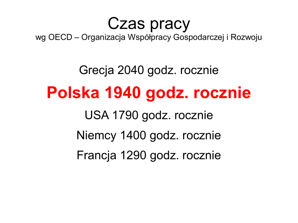 Czas pracy wg OECD – Organizacja Współpracy Gospodarczej i Rozwoju Grecja 2040 godz. rocznie Polska 1940 godz. rocznie USA 1790 godz. rocznie Niemcy 1400 godz. rocznie Francja 1290 godz. rocznie Wartość ekonomiczna godziny Luksemburg, Norwegia – 75 $ USA – 59 $ Niemcy 50 $ OECD – 44 $ Polska 25 $ PKB – Produkt Krajowy Brutto per capita w roku 2012 wg MFW w $ 1. Katar – 102.211 2. Luksemburg – 79.785 3. Norwegia – 55.000 4. USA – 49.922 5. Szwajcaria – 45.418 6. Austria – 42.409 7. Holandia – 42.194 8. Szwecja – 41.191 9. Niemcy – 39.028 10. Belgia – 37.881 11. Dania – 37.657 12. Wielka Brytania – 36.941 13. Finlandia – 36.393 14. Francja – 35.548 UNIA EUROPEJSKA - 32.021 15. Hiszpania – 30.557 16. Włochy – 30.136 17. Słowenia – 28.195 18. Czechy – 27.191 19. Grecja – 24.505 20. Słowacja – 24.244 21. Litwa – 21.615 22. Polska – 20.592 23. Węgry – 19.638 24. Rosja – 17.709 25. Białoruś – 15.634 26. Bułgaria – 14.312 27. Rumunia - 12.808 Wskaźnik Wolności Gospodarczej Wolny W zasadzie wolny Umiarkowanie wolny W zasadzie bez wolności Bez wolności Kryteria Polityka handlowa Podatki Interwencja Państwa w gospodarce Polityka monetarna Przepływ kapitału Banki i obrót finansowy Płace i ceny Prawo własności Przepisy prawa Czarny rynek Kraje wolności gospodarczej Szwajcaria Kraje w zasadzie wolne Luksemburg USA Austria Holandia Szwecja Niemcy Belgia Dania Wielka Brytania Finlandia Litwa Kraje umiarkowanie wolne Katar Norwegia Francja Hiszpania Włochy Słowenia Czechy Słowacja Węgry Grecja Polska Bułgaria Rumunia Pozostałe kraje Rosja w zasadzie bez wolności Białoruś bez wolności Pozostałe kraje Rosja w zasadzie bez wolności Białoruś bez wolności