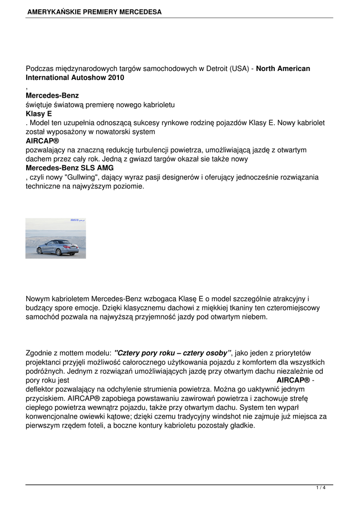 AMERYKAŃSKIE PREMIERY MERCEDESA Podczas międzynarodowych targów samochodowych w Detroit (USA) - North American International Autoshow 2010 , Mercedes-Benz świętuje światową premierę nowego kabrioletu Klasy E . Model ten uzupełnia odnoszącą sukcesy rynkowe rodzinę pojazdów Klasy E. Nowy kabriolet został wyposażony w nowatorski system AIRCAP® pozwalający na znaczną redukcję turbulencji powietrza, umożliwiającą jazdę z otwartym dachem przez cały rok. Jedną z gwiazd targów okazał sie także nowy Mercedes-Benz SLS AMG , czyli nowy "Gullwing", dający wyraz pasji designerów i oferujący jednocześnie rozwiązania techniczne na najwyższym poziomie. Nowym kabrioletem Mercedes-Benz wzbogaca Klasę E o model szczególnie atrakcyjny i budzący spore emocje. Dzięki klasycznemu dachowi z miękkiej tkaniny ten czteromiejscowy samochód pozwala na najwyższą przyjemność jazdy pod otwartym niebem. Zgodnie z mottem modelu: "Cztery pory roku – cztery osoby”, jako jeden z priorytetów projektanci przyjęli możliwość całorocznego użytkowania pojazdu z komfortem dla wszystkich podróżnych. Jednym z rozwiązań umożliwiających jazdę przy otwartym dachu niezależnie od pory roku jest AIRCAP® deflektor pozwalający na odchylenie strumienia powietrza. Można go uaktywnić jednym przyciskiem. AIRCAP® zapobiega powstawaniu zawirowań powietrza i zachowuje strefę ciepłego powietrza wewnątrz pojazdu, także przy otwartym dachu. System ten wyparł konwencjonalne owiewki kątowe; dzięki czemu tradycyjny windshot nie zajmuje już miejsca za pierwszym rzędem foteli, a boczne kontury kabrioletu pozostały gładkie. 1/4 AMERYKAŃSKIE PREMIERY MERCEDESA Wygodne podróżowanie z zamkniętą kabiną umożliwia miękkie poszycie dachu o szczególnie wysokim współczynniku tłumienia dźwięków – model ten posiada jedno z najcichszych wnętrz wśród kabrioletów tej klasy. Dach otwiera się i zamyka w ciągu 20 sekund, nawet przy jeździe z prędkością 40 km/h. Wyposażenie standardowe kabrioletu Klasy E obejmuje najnowszej generacji system grzewczy AIRSCARF®, wbudowany w oparcia foteli. Dzięki niemu nawiew ciepłego powietrza poprzez regulowane wywietrzniki w zagłówkach opływa szyje i ramiona podróżujących jak niewidzialny szal. Klasa E to jeden z najważniejszych modeli marki Mercedes-Benz. Dzięki nowemu kabrioletowi Klasa E występuje w czterech atrakcyjnych odmianach, z których wszystkie cechują się nowatorskimi rozwiązaniami. Limuzyna, kombi, Coupe i Cabrio wyposażone są zarówno w silniki dieslowskie o bezpośrednim wtrysku jak i benzynowe. Wszystkie łączy wysoka oszczędność, wydajność i najwyższe osiągi. Wśród rozwiązań zwiększających bezpieczeństwo Klasy E znajduje się system kontroli zmęczenia kierowcy "ATTENTION ASSIST", system ochrony pasażerów PRE-SAFE® , inteligentny system oświetleniowy ILS , system Active Bonnet , minimalizujący obrażenia pieszego w przypadku kolizji z samochodem oraz układ kontroli odległości od pojazdu poprzedzającego "DISTRONIC PLUS" . 2/4 AMERYKAŃSKIE PREMIERY MERCEDESA Oprócz innowacji cechujących wszystkie modele w tej rodzinie, poszczególne warianty posiadają zindywidualizowane rozwiązania podnoszące komfort jazdy, bezpieczeństwo i atrakcyjność pojazdu. Klasa E to bez wątpienia lider w swoim segmencie rynkowym: w Niemczech udział w rynku limuzyn wynosi około 60 procent, a w Europie Zachodniej (poza Niemcami) 40 procent w odpowiednim segmencie. Mercedes-Benz SLS AMG Nowy model Mercedes-Benz SLS AMG, który w Polsce zostanie pokazany pod koniec marca 2010 roku, to połączenie sportowej pasji i najwyższej klasy rozwiązań technicznych. Nowy "Gullwing" zachwyca czystą formą, inteligentną, lekką konstrukcją oraz doskonałą dynamiką jazdy. SLS AMG jest pierwszym pojazdem opracowanym całkowicie niezależnie przez Merced es-AMG i stanowi ukoronowanie ponad czterdziestoletniej historii firmy. Nowy Mercedes-Benz SLS AMG z jego propozycjami technologicznymi jest unikalną propozycją na rynku. Aluminiowa konstrukcja o drzwiach skrzydłowych, silnik AMG 6,3 litra V8 przesunięty w stronę kabiny (tzw. front-mid-engine) osiągający 420 kW (571 KM) i 650 Nm pracujący w technologii suchej miski olejowej, siedmiostopniowa skrzynia biegów, zintegrowana z mechanizmem różnicowym, umieszczona przed tylną osią (transaxle) o podwójnym wysprzęglaniu oraz sportowe zawieszenie o podwójnych aluminiowych wahaczach – to doskonała kombinacja zapewniająca najwyższą dynamikę jazdy. „Gullwing” przyspiesza od 0 do 100 km/h w ciągu 3,8 sekundy i osiąga prędkość maksymalną 317 km/h (ograniczoną 3/4 AMERYKAŃSKIE PREMIERY MERCEDESA elektronicznie). Czysta forma nowego Mercedesa SLS AMG oddaje sportowy charakter pojazdu i stanowi nową interpretację niegdyś zapierającej dech w piersiach linii modelu 300 SL. Charakterystycznym elementem pozostają drzwi w kształcie skrzydeł mewy nadające modelowi SLS AMG wyjątkową charyzmę. Materiały źródłowe: Mercedes-Benz Polska (14.01.2010) 4/4