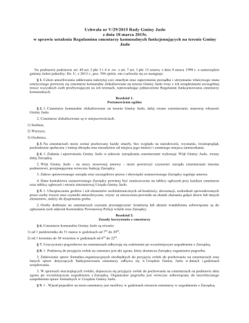 Uchwała nr V/29/2015 Rady Gminy Jasło z dnia 18 marca 2015r. w sprawie ustalenia Regulaminu cmentarzy komunalnych funkcjonujących na terenie Gminy Jasło Na podstawie podstawie art. 40 ust. 2 pkt 3 i 4 w zw. z art. 7 ust. 1 pkt 13 ustawy z dnia 8 marca 1990 r. o samorządzie gminny (tekst jednolity: Dz. U. z 2013 r., poz. 594 zpóźn. zm.) uchwala się co następuje: § 1. Celem umożliwienia oddawania należytej czci zmarłym oraz zapewnienia porządku i utrzymania właściwego stanu estetycznego powierza się cmentarze komunalne zlokalizowane na terenie Gminy Jasło wraz z ich urządzeniami szczególnej trosce wszystkich osób przebywającym na ich terenach, wprowadzając jednocześnie Regulamin funkcjonowania cmentarzy komunalnych. Rozdział 1. Postanowienia ogólne § 2. 1. Cmentarze komunalne zlokalizowane na terenie Gminy Jasło, dalej zwane cmentarzami, stanowią własność Gminy Jasło. 2. Cmentarze zlokalizowane są w miejscowościach: 1) Szebnie, 2) Warzyce, 3) Osobnica. § 3. Na cmentarzach może zostać pochowany każdy zmarły, bez względu na narodowość, wyznanie, światopogląd, pochodzenie społeczne i rodzaj obrzędu oraz niezależnie od miejsca jego śmierci i ostatniego miejsca zamieszkania. § 4. 1. Zadania i uprawnienia Gminy Jasło w zakresie zarządzania cmentarzami wykonuje Wójt Gminy Jasło, zwany dalej Zarządcą. 2. Wójt Gminy Jasło - na mocy stosownej umowy - może powierzyć czynności zarządu cmentarzami innemu podmiotowi, przejmującemu wówczas funkcję Zarządcy. 3. Zakres sprawowanego zarządu oraz szczegółowe prawa i obowiązki ustanowionego Zarządcy reguluje umowa. 4. Dane kontaktowe ustanowionego Zarządcy powinny być zamieszczone na tablicy ogłoszeń przy każdym cmentarzu oraz tablicy ogłoszeń i stronie internetowej Urzędu Gminy Jasło. § 5. 1. Ubezpieczenie grobów i ich elementów architektonicznych od kradzieży, dewastacji, uszkodzeń spowodowanych przez osoby trzecie oraz czynniki atmosferyczne, wtym: za zniszczenia powstałe na skutek złamania gałęzi drzew lub innych elementów, należy do dysponenta grobu. 2. Osoby dotknięte na cmentarzach czynami przestępczymi: kradzieżą lub aktami wandalizmu zobowiązane są do zgłaszania tych zdarzeń Komendzie Powiatowej Policji wJaśle oraz Zarządcy. Rozdział 2. Zasady korzystania z cmentarzy § 6. Cmentarze komunalne Gminy Jasło są otwarte: 1) od 1 października do 31 marca w godzinach od 700 do 2000, 2) od 1 kwietnia do 30 września w godzinach od 600 do 2200. § 7. Uroczystości pogrzebowe na cmentarzach odbywają się codziennie po wcześniejszym uzgodnieniu z Zarządcą. § 8. 1. Podstawą do przyjęcia zwłok na cmentarz jest akt zgonu, który dostarcza Zarządcy organizator pogrzebu. 2. Załatwianie spraw formalno-organizacyjnych niezbędnych do przyjęcia zwłok do pochowania na cmentarzach oraz innych spraw dotyczących funkcjonowania cmentarzy odbywa się w Urzędzie Gminy Jasło w dniach i godzinach urzędowania. 3. W sprawach niecierpiących zwłoki, dopuszcza się przyjęcie zwłok do pochowania na cmentarzach na podstawie aktu zgonu po wcześniejszym uzgodnieniu z Zarządcą. Organizator pogrzebu jest wówczas zobowiązany do niezwłocznego uzupełnienia spraw formalnych w Urzędzie Gminy Jasło. § 9. 1 . Wjazd pojazdów na teren cmentarzy jest możliwy w godzinach otwarcia cmentarzy w uzgodnieniu z Zarządcą. 2. Osoby wjeżdżające na cmentarz obowiązuje zachowanie szczególnej ostrożności oraz stosowanie się do zalecanej przez Zarządcę organizacji ruchu. § 10. 1 . Osoby przebywające na terenie cmentarzy zobowiązane są do zachowania spokoju i powagi miejsca oraz szacunku należnego zmarłym. 2. Dysponenci grobów, osoby przebywające na terenie cmentarza oraz podmioty gospodarcze świadczące usługi pogrzebowe na terenie cmentarzy zobowiązani są do stosowania się do postanowień niniejszego Regulaminu, wydanych na jego podstawie zaleceń Zarządcy oraz informacji umieszczonych na tablicach informacyjnych. § 11. 1. Cmentarze utrzymywane są jako tereny zieleni o założeniu parkowym. 2. Usytuowanie grobów na cmentarzach powinno być zgodne z planem zagospodarowania cmentarza, a wymiary grobów i odstępy pomiędzy nimi zgodne z wytycznymi zawartymi w rozporządzeniu Ministra Infrastruktury z dnia 7 marca 2008 r. w sprawie wymagań, jakie muszą spełniać cmentarze, groby i inne miejsca pochówku zwłok iszczątków (Dz. U. z 2008 r., Nr 48, poz. 284). 3. Na częściach cmentarzy dotychczas zagospodarowanych, Wójt Gminy Jasło, wyrażając zgodę na usytuowanie grobu w miejscu po zlikwidowanym grobie lub wygospodarowanym na ten cel miejscu, dąży do optymalnego usytuowania grobów nie powodującego utrudnień w komunikacji i nie powodującego naruszenia sąsiednich grobów i istniejącej zieleni. § 12. 1. Użycie miejsca w grobie do ponownego pochówku może nastąpić po upływie 20 lat od ostatniego pochówku po spełnieniu następujących warunków: 1) osoba dokonująca pochówku jest dysponentem grobu, 2) istnieje techniczna możliwość ponownego pochówku, 3) nie zostało wniesione zastrzeżenie w trybie ustawy o cmentarzach i chowaniu zmarłych, 4) została uiszczona opłata za miejsce pod grób. 2. W przypadku grobów mających charakter grobu rodzinnego, o ponownym pochówku decyduje dysponent grobu. 3. Przygotowanie - zgodnie z obowiązującymi przepisami - miejsca do pochówku w grobie zasiedlonym, odbywa się na zlecenie i koszt dysponenta grobu. 4. Nie dopuszcza się do ponownego pochówku w grobach wpisanych do rejestru zabytków, grobów wojennych, jak również mających wartość pamiątek historycznych lub wartość artystyczną. Rozdział 3. Zasady utrzymania porządku i czystości na terenie cmentarzy § 13. Na terenie cmentarzy obowiązuje zakaz: 1) zakłócania ciszy, porządku i powagi miejsca, 2) spożywania alkoholu i przebywania w stanie nietrzeźwości lub pod wpływem środków odurzających, 3) palenia wyrobó