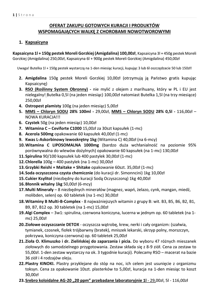 1|Strona OFERAT ZAKUPU GOTOWYCH KURACJI I PRODUKTÓW WSPOMAGAJĄCYCH WALKĘ Z CHOROBAMI NOWOTWOROWYMI 1. Kapsaicyna Kapsaicyna 1l + 150g pestek Moreli Gorzkiej (Amigdalina) 100,00zł, Kapsaicyna 3l + 450g pestek Moreli Gorzkiej (Amigdalina) 250,00zł, Kapsaicyna 6l + 900g pestek Moreli Gorzkiej (Amigdalina) 450,00zł Uwaga! Butelka 1l + 150g pestek wystarczą na 1-den miesiąc kuracji, kupując 3 lub 6l oszczędzacie 50 lub 150zł! 2. Amigdalina 150g pestek Moreli Gorzkiej 10,00zł (otrzymują ją Państwo gratis kupując Kapsaicynę) 3. RSO (Roślinny System Obronny) - nie mylić z olejem z marihuany, który w PL i EU jest nielegalny! Butelka 0,5l (na jeden miesiąc) 100,00zł natomiast Butelka 1,5l (na trzy miesiące) 250,00zł 4. Ostropest plamisty 100g (na jeden miesiąc) 5,00zł 5. MMS – Chloryn SODU 28% 100ml - 29,00zł, MMS – Chloryn SODU 28% 0,5l - 116,00zł – NOWA KURACJA!!! 6. Czystek 50g (na jeden miesiąc) 10,00zł 7. Witamina C – Ceviforte C1000 15,00zł za 30szt kapsułek (1-mc) 8. Acerola 500mg opakowanie 60 kapsułek 40,00zł (1-mc) 9. Kwas L-Askorbinowy lewoskrętny 1kg (Witamina C) 40,00zł (na 6-mcy) 10. Witamina C LIPOSOMALNA 1000mg (bardzo duża wchłanialność na poziomie 95% porównywalna do wlewów dożylnych) opakowanie 60 kapsułek (na 1-mc) 130,00zł 11. Spirulina 90/100 kapsułek lub 400 pastylek 30,00zł (1-mc) 12. Chlorella 100g – 400 pastylek (na 1-mc) 30,00zł 13. Grzybki Reishi + Maitake + Shitake opakowanie 60szt. 35,00zł (1-mc) 14. Soda oczyszczona czysta chemicznie (do kuracji dr. Simonncini) 1kg 10,00zł 15. Cukier Ksylitol (niezbędny do kuracji Sodą Oczyszczoną) 1kg 40,00zł 16. Błonnik witalny 1kg 50,00zł (6-mcy) 17. Multi Minerały – 8 niezbędnych minerałów (magnez, wapń, żelazo, cynk, mangan, miedź, molibden, selen) op. 60 tabletek (na 1-mc) 30,00zł 18. Witaminy B Multi-B-Complex - 8 najważniejszych witamin z grupy B: wit. B3, B5, B6, B2, B1, B9, B7, B12 op. 30 tabletek (na 1-mc) 15,00zł 19. Algi Complex – 3w1: spirulina, czerwona koniczyna, lucerna w jednym op. 60 tabletek (na 1mc) 25,00zł 20. Ziołowe oczyszczanie DETOX - oczyszcza wątrobę, krew, nerki i cały organizm: (szałwia, tymianek, czosnek, fiołek trójbarwny (bratek), mniszek lekarski, skrzyp polny, morszczyn, pokrzywa, koniczyna czerwona) op. 60 tabletek 25,00zł 21. Zioła O. Klimuszko i dr. Zielińskiej do zaparzania i picia. Do wyboru 47 różnych mieszanek ziołowych do samodzielnego przygotowania. Zestaw składa się z 8-9 ziół. Cena za zestaw to 55,00zł. 1-den zestaw wystarczy na ok. 3 tygodnie kuracji). Polecamy RSO – macerat na bazie 36 ziół i 4 rodzajów oleju. 22. Plastry KINOKI. Plastry przyklejane do stóp na noc, ich celem jest usunięcie z organizmu toksyn. Cena za opakowanie 10szt. plasterków to 5,00zł, kuracja na 1-den miesiąc to koszt 30,00zł 23. Srebro koloidalne AG-20 „20 ppm” przebadane laboratoryjnie 1l - 29,00zł, 5l - 116,00zł 2|Strona 24. Graviola (w proszku) 50g – 30,00zł 25. VILCACORA BIO 100g 50,00zł 26. Master Tonic 0,5l – 30,00zł Master Tonic Jest to naturalny antybiotyk wytwarzany domowym sposobem na bazie octu jabłkowego, czosnku, cebuli, papryki Chilli, imbiru, chrzanu i kurkumy. Stosowany przy wszystkich innych „normalnych” chorobach towarzyszących w czasie kuracji nowotworowej i nie tylko. MT można przygotować we własnym zakresie. Warto go mieć zawsze pod ręką. 27.Witamina C (buteleczka 50ml/7,5g) w płynie do wlewów dożylnych importowana z Niemiec 75,00zł/szt. 28. Zestaw STARTOWY do domowej produkcji Witaminy C Liposomalnej (Kwas L-Askorbionowy 1kg, Lecytyna 1kg oraz nowa wanienka ultradźwiękowa). Całość z opisem przygotowania. Cena kompletu: 250,00zł 29. Komponenty do produkcji Witaminy C Liposomalnej (Kwas L-Askorbionowy 1kg, Lecytyna 1kg) Cena: 100,00zł 30. Gotowa Witamina C Liposomalna w płynie (butelka 0,5l a w środku 360ml płynu z 10g witaminy) Cena: 10,00zł/szt. 31. Jagody ACAI 100 kapsułek 25,00zł 32. Acerola 60 kapsułek 20,00zł 33. Czarnuszka 0,5kg 20,00zł 34. Czosnek niedźwiedzi 50g 15,00zł 35. Graviola 30 kapsułek 20,00zł 36. Guarana 100g 20,00zł 37. Herbata LAPACHO 100g 15,00zł 38. Jagody GOI 250g 20,00zł 39. Młody jęczmień 120 kapsułek 45,00zł 40. Nasiona CHIA 1kg 25,00zł 41. Witamina K2 MK7 60 kapsułek 25,00zł 42. Olejek z Drzewka Herbacianego 25ml 20,00zł 43. Piperyna 60 kapsułek 25,00zł 44. Sól Himalajska różowa i drobno-mielona (elektrolity) 1kg 10,00zł 45. Żeń Szeń Syberyjski 100g 15,00zł 46. Srebro Koloidalne ARGENTUM 0,5l 25PPM 30,00zł 47. Zestaw do samodzielnej produkcji SREBRA KOLOIDALNEGO (zasilacz, 2 srebrne druty gr. 2,5mm i dł. 15cm próby „999”, kostka elektryczna, 1l wody demineralizowanej, filtry oraz instrukcja) 160,00zł 48. Zestaw 4 ziół 200g do przygotowania HERBATKI ESSIAC – 40,00zł W razie pytań proszę o kontakt! Dariusz, tel. (+48) 734 439 487 (T-Mobile) www.kapsaiyna.eu e-mail: [email protected]