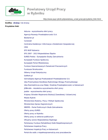 http://www.pup-rybnik.pl/powiatowy_urzad_pracy/przydatne_linki.html Grafika : drukuj / nie drukuj Przydatne linki Adzuna - wyszukiwarka ofert pracy Agencja Rozwoju Przedsiębiorczości S.A. Bezbarier.pl Careerjet Centralna Ewidencja i Informacja o Działalności Gospodarczej CRIS EFS WUP Katowice EFS 2007 - 2013 Województwo Śląskie EURES Polska - Europejskie Służby Zatrudnienia Europejski Fundusz Społeczny Europejski Portal Młodzieżowy Fundusz Gwarantowanych Świadczeń Pracowniczych Fundusze Strukturalne Główny Urząd Statystyczny GoWork.pl Górnośląska Agencja Przekształceń Przedsiębiorstw S.A. Izba Przemysłowo-Handlowa Rybnickiego Okręgu Przemysłowego Izba Rzemieślnicza oraz Małej i Średniej Przedsiębiorczości w Katowicach JOBkralle - niezależna wyszukiwarka ofert pracy Jooble - wyszukiwarka ofert pracy Krajowy Ośrodek Wspierania Edukacji Zawodowej i Ustawicznej Miasto Rybnik Ministerstwo Rodziny, Pracy i Polityki Społecznej Ministerstwo Spraw Zagranicznych MRPIPS - Portal Publicznych Służb Zatrudnienia Oferty pracy EURES Oferty pracy w Rybniku Oferty pracy w sektorze publicznym Oficjalny serwis Województwa Śląskiego Państwowy Fundusz Rehabilitacji Osób Niepełnosprawnych Państwowa Inspekcja Pracy Państwowa Inspekcja Pracy w Katowicach Portal dla osób z niepełnosprawnością oraz pracodawców Portal Praca-Rybnik Portal Unii Europejskiej praca w Gazeta.pl Pracuj.pl www.praca-rybnik.info Publiczne Służby Zatrudnienia rybnickiposrednik.pl www.sdsiz.pl Starostwo Powiatowe w Rybniku Śląski Urząd Wojewódzki w Katowicach Urząd Miasta Rybnik Wojewódzki Urząd Pracy w Katowicach Żorskie Centrum Organizacji Pozarządowych InterviewMe
