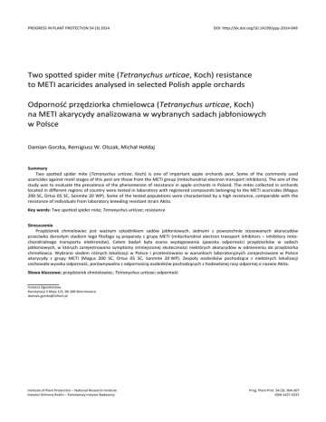PROGRESS IN PLANT PROTECTION 54 (3) 2014 DOI: http://dx.doi.org/10.14199/ppp-2014-049 Two spotted spider mite (Tetranychus urticae, Koch) resistance to METI acaricides analysed in selected Polish apple orchards Odporność przędziorka chmielowca (Tetranychus urticae, Koch) na METI akarycydy analizowana w wybranych sadach jabłoniowych w Polsce Damian Gorzka, Remigiusz W. Olszak, Michał Hołdaj Summary Two spotted spider mite (Tetranychus urticae, Koch) is one of important apple orchards pest. Some of the commonly used acaricides against motil stages of this pest are those from the METI group (mitochondrial electron transport inhibitors). The aim of the study was to evaluate the prevalence of the phenomenon of resistance in apple orchards in Poland. The mites collected in orchards located in different regions of country were tested in laboratory with registered compounds belonging to the METI acaricides (Magus 200 SC, Ortus 05 SC, Sanmite 20 WP). Some of the tested populations were characterized by a high resistance, comparable with the resistance of individuals from laboratory breeding resistant strain Akita. Key words: Two spotted spider mite; Tetranychus urticae; resistance Streszczenie Przędziorek chmielowiec jest ważnym szkodnikiem sadów jabłoniowych. Jednymi z powszechnie stosowanych akarycydów przeciwko dorosłym stadiom tego fitofaga są preparaty z grupy METI (mitochondrial electron transport inhibitors – inhibitory mitochondrialnego transportu elektronów). Celem badań była ocena występowania zjawiska odporności przędziorków w sadach jabłoniowych, w których zarejestrowano symptomy zmniejszonej skuteczności niektórych akarycydów w odniesieniu do przędziorka chmielowca. Wybrano siedem różnych lokalizacji w Polsce i przetestowano w warunkach laboratoryjnych zarejestrowane w Polsce akarycydy z grupy METI (Magus 200 SC, Ortus 05 SC, Sanmite 20 WP). Zespoły osobników pochodzące z niektórych lokalizacji cechowała wysoka odporność, porównywalna z odpornością osobników pochodzących z hodowlanej rasy odpornej o nazwie Akita. Słowa kluczowe: przędziorek chmielowiec; Tetranychus urticae; odporność Instytut Ogrodnictwa Konstytucji 3 Maja 1/3, 96-100 Skierniewice [email protected] Institute of Plant Protection – National Research Institute Instytut Ochrony Roślin – Państwowy Instytut Badawczy Prog. Plant Prot. 54 (3): 304-307 ISSN 1427-4337 Progress in Plant Protection 54 (3) 2014 Wstęp / Introduction Roślinożerne roztocze w sadach jabłoniowych stanowią jedną z największych i najbardziej powszechnych grup szkodników (Putman 1955; Van de Vrie i wsp. 1975). Szybki rozwój, duża płodność oraz szerokie spektrum roślin żywicielskich, w tym także uprawnych, sprawiają, że szkodniki te powodują często znaczące straty w produkcji roślinnej. Do jednego z najbardziej znanych roztoczy należących do rodziny przędziorkowatych (Tetranychidae) należy przędziorek chmielowiec (Tetranychus urticae, Koch) – ważny szkodnik w uprawach jabłoni (Van de Vrie 1985). Dynamiczny wzrost jego liczebności zachodzi szczególnie szybko w okresach długiej, suchej i upalnej pogody. W tej sytuacji konieczne jest często stosowanie kilku zabiegów redukujących wielkość jego populacji. Jednymi z powszechnie stosowanych akarycydów przeciwko dorosłym stadiom tego fitofaga są środki z grupy METI (mitochondrial electron transport inhibitors – inhibitory mitochondrialnego transportu elektronów). Wieloletnie i wielokrotne opryskiwanie preparatami o takim samym mechanizmie działania, może powodować selekcje ras odpornych szkodnika na stosowane przeciwko niemu środki ochrony roślin (Cranham i Halle 1985; Scott 1990; Motoba i wsp. 2000; Davine i wsp. 2001; Nauen i wsp. 2001; Stumpf i Nauen 2001; Leeuwen i wsp. 2005). Od kilku lat także w niektórych rejonach Polski, obserwowano obniżenie skuteczności akarycydów z grupy METI (Maciesiak i Olszak 2010). Podjęto badania, których celem była ocena powszechności występowania zjawiska odporności przędziorka chmielowca zasiedlającego sady jabłoniowe, usytuowane w różnych regionach Polski. Materiały i metody / Materials and methods Badania prowadzono w latach 2011–2012. W wytypowanych sadach jabłoniowych, w 2011 roku zebrano osobniki dorosłe, nimfy oraz jaja T. urticae w ilości pozwalającej na prowadzenie hodowli tego fitofaga w warunkach laboratoryjnych. Były to lokalizacje: Skierniewice (29-letni sad, odmiana Champion), Głuchowo (13-letni sad, odmiana Gala), Miłobądz (4-letni sad, odmiana Champion), Trzylatków, Józefów (6-letni sad, odmiana Champion), Dąbrowice (6-letni sad, odmiana Golden Delicious), Bartodzieje (18-letni sad, odmiana Ligol) (rys. 1). Przędziorki do badań pobierano z liści jabłoni przywiezionych z wybranych sadów na przełomie sierpnia i września. Analizę skuteczności działania wybranych akarycydów wykonywano w warunkach laboratoryjnych. Do testów nad przeżywalnością przędziorka chmielowca wybrano trzy zarejestrowane akarycydy z grupy METI: Magus 200 SC (fenazachina), Ortus 05 SC (fenpiroksymat), Sanmite 20 WP (pirydaben). Testy wykonano na liściach jabłoni umieszczonych w specjalnie przygotowanych szalkach Petriego wyścielonych bibułą nasączoną wodą. Na tak przygotowane liście nanoszono po 10 osobników dorosłych przędziorka chmielowca. Każdą kombinację (preparat) testowano w 4 powtórzeniach (40 osobni- 305 ków). Nanoszenie preparatów na liście i znajdujące się na nich przędziorki przeprowadzono w wieży Pottera firmy Burkard Scientific. Dawka na hektar przeliczana była do 1 l wody, z którego pobierano 2 ml roztworu. Po aplikacji preparatów obserwacje nad przeżywalnością przędziorków prowadzono w komorze klimatycznej (25°C, 16L:8D oraz 65% wilgotność względnej). Śmiertelność oceniano po 72 godzinach. Śmiertelność (przeżywalność) osobników zebranych w sadach porównywano z hodowanymi w laboratorium ras