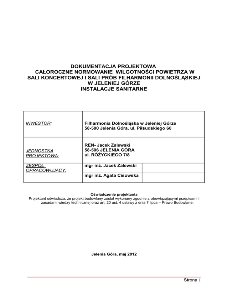 DOKUMENTACJA PROJEKTOWA CAŁOROCZNE NORMOWANIE WILGOTNOŚCI POWIETRZA W SALI KONCERTOWEJ I SALI PRÓB FILHARMONII DOLNOŚLĄSKIEJ W JELENIEJ GÓRZE INSTALACJE SANITARNE INWESTOR: JEDNOSTKA PROJEKTOWA: ZESPÓŁ OPRACOWUJACY: Filharmonia Dolnośląska w Jeleniej Górze 58-500 Jelenia Góra, ul. Piłsudskiego 60 REN- Jacek Zalewski 58-506 JELENIA GÓRA ul. RÓŻYCKIEGO 7/8 mgr inż. Jacek Zalewski mgr inż. Agata Cisowska Oświadczenie projektanta Projektant oświadcza, że projekt budowlany został wykonany zgodnie z obowiązującymi przepisami i zasadami wiedzy technicznej oraz art. 20 ust. 4 ustawy z dnia 7 lipca – Prawo Budowlane. Jelenia Góra, maj 2012 Strona 1 SPIS TREŚCI I. OPIS TECHNICZNY II. INFORMACJA DOTYCZĄCA PLANU BIOZ III. SPIS RYSUNKÓW DO PROJEKTU I. OPIS TECHNICZNY 1. WSTĘP 2. OPIS STANU ISTNIEJĄCEGO 3. WYMAGANE PARAMETRY POWIETRZA W SALACH KONCERTOWEJ ORAZ PRÓB 4. OBLICZENIA WYDAJNOŚCI NAWILŻACZY 5. WYTYCZNE AUTOMATYCZNE REGULACJI 6. WYTYCZNE DLA INSTALACJI SANITARNYCH 7. ROBOTY BRANŻOWE 8. UWAGI KOŃCOWE Strona 2 1. WSTĘP 1.1. Podstawa opracowania Podstawą formalną opracowania jest zlecenie Filharmonii Dolnośląskiej w Jeleniej Górze dla firmy REN - Jacek Zalewski na wykonanie projektu budowlanego pt. Zastosowanie całorocznego normowania wilgotności powietrza w Sali Koncertowej i Sali Prób Filharmonii Dolnośląskiej w Jeleniej Górze. 1.2. Przedmiot, cel i zakres opracowania Przedmiotem opracowania są instalacje klimatyzacyjne KN1 – KW1 oraz KN7-KW7 obsługujące sale koncertową i prób w budynku Filharmonii Dolnośląskiej mieszczącego się w Jeleniej Górze przy ulicy Piłsudskiego 60. Celem opracowania jest wykonanie projektu dla całorocznego normowania wilgotności w wybranych pomieszczeniach w/w obiektu wraz z uwzględnieniem koniecznych prac modernizacyjnych. Opracowanie zawiera: − opis stanu istniejącego, − określenie wymaganych parametrów powietrza w salach koncertowej i prób, − określenie wydajności urządzeń do nawilżania powietrza − określenie rozwiązań w zakresie zabudowy urządzeń do nawilżania wraz z niezbędnymi pracami modernizacyjnymi, − dokumentacja rysunkowa rozwiązania, 1.3. Materiały i dokumenty Niniejsze opracowanie wykonano w oparciu o następujące materiały i dokumenty: 1.3.1. Opracowania koncepcyjne i projektowe 1. Projekt techniczny jednostadiowy zamienny „Filharmonia w Jeleniej Górze – Rozbudowa Państwowej Filharmonii i Wojewódzkiej Biblioteki Publicznej. Instalacja klimatyzacji i wentylacji” – wykonany przez Przedsiębiorstwo Urządzeń Klimatyzacyjnych „AW-KLIMA” Sp. z o.o. ul. Wiwulskiego 12 Wrocław, marzec 1998 r. Strona 3 2. Projekt techniczny jednostadiowy „Filharmonia w Jeleniej Górze – Rozbudowa Państwowej Filharmonii i Wojewódzkiej Biblioteki Publicznej. Instalacja siły i sterownicza dla klimatyzacji i wentylacji” – wykonany przez Przedsiębiorstwo Urządzeń Klimatyzacyjnych „AW-KLIMA” Sp. z o.o. ul. Wiwulskiego 12 Wrocław, listopad 1996 r. 3. Analiza techniczna firmy MARBASS Słotwińska Sompoliński Spółka Jawna ul. Waryńskiego 31C/6 58-105 Świdnica na wykonanie opracowania pt. Analiza techniczna możliwości zastosowania całorocznego normowania wilgotności powietrza w Sali Koncertowej i Sali Prób Filharmonii Dolnośląskiej w Jeleniej Górze. 4. Uzgodnienia z Inwestorem. 1.3.2. Polskie Normy • PN-76/B-03420 „Wentylacja i klimatyzacja. Parametry obliczeniowe powietrza zewnętrznego.” • PN-78/B-03421 „Wentylacja i klimatyzacja. Parametry obliczeniowe powietrza w pomieszczeniach przeznaczonych do stałego przebywania ludzi.” 2. OPIS STANU ISTNIEJĄCEGO Do kształtowania parametrów powietrza w Sali Koncertowej przewidziano układ KN1, KW1; zaś w Sali Prób układ KN7, KW7. Ponadto wszystkie układy klimatyzacyjne obsługiwane są przez agregat ziębniczy typu NRA 350 L FO R407 C firmy Aermec, przeznaczony tylko do pracy w okresie letnim. 2.1. Sala koncertowa System KN1, KW1 obsługuje dużą salę koncertową na 300 osób oraz foyer tej sali. Centrala klimatyzacyjna nawiewno - wywiewna z recyrkulacją i wymiennikiem obrotowym do odzysku ciepła, produkcji PROMONT – Świebodzice typu S16 (50) N-P o wydajności projektowanej Vn = 22 150 m3/h przy sprężu P = 700 Pa i V w = 18 500 m3/h przy sprężu P = 800 Pa, zlokalizowana jest w maszynowni klimatyzacyjnej w piwnicy budynku. Uzdatnione powietrze w ilości 22 150 m3/h przetłaczane jest przez system kanałów murowanych i blaszanych z tłumikami hałasu do kanałów rozdzielczych, usytuowanych pod sufitem sali koncertowej. Nawiewanie powietrza w ilości około 20 150 m3/h odbywa się przez 24 nawiewniki wirowe typu DD-VK-DN 400 firmy Krantz o wydajności V n1 = 830 m3/h. Powietrze zużyte usuwane jest z sali przez system kratek wywiewnych zlokalizowanych w stopniach amfiteatralnie skonstruowanej widowni i przez stopnie estrady. Powietrze wywiewane wraca do centrali klimatyzacyjnej w maszynowni, gdzie zależnie od potrzeb i parametrów powietrza Strona 4 zewnętrznego oraz wywiewanego prowadzony jest odzysk ciepła i/lub powietrze wywiewane jest częściowo zawracane do instalacji nawiewnej. 2.2. Sala prób Układ KN7, KW7obsługuje małą salę kameralną (prób), przewidzianą dla 70 słuchaczy (widzów). Powietrze zewnętrzne, czerpane ze wspólnej komory kurzowej, uzdatniane jest w centrali klimatyzacyjnej nawiewno-wywiewnej z recyrkulacją produkcji Promont – Świebodzice typu S6 (50) P. Przewidywany strumień powietrza nawiewanego Vn = 4650...2325 m3/h i wywiewanego Vw = 3900...1950 m3/h zależnie od prędkości obrotowej wirników wentylatorów. Prędkość obrotowa ustawiana jest automatycznie w zależności od frekwencji (mierzonej czujnikiem jakości powietrza). Nawiew powietrza odbywa się przez 10 nawiewników typu VDW-Q-Z-V-M/600×24/S1 o wydajności projektowanej V 1n = 465 m3/h produkcji firmy Trox technik. Wywiew powietrza z sali przez 6 kratek wywiewnych, zainsta