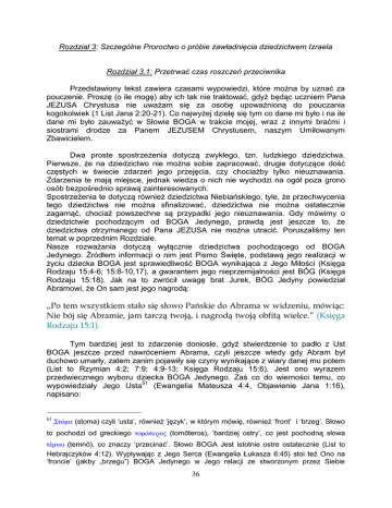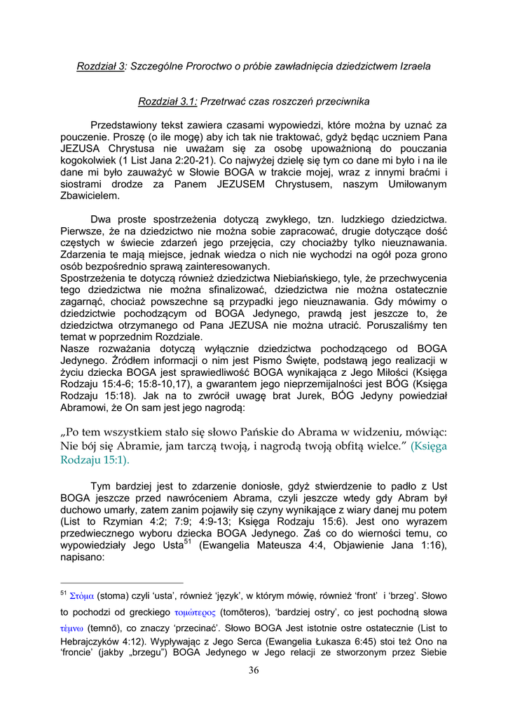 Rozdział 3: Szczególne Proroctwo o próbie zawładnięcia dziedzictwem Izraela Rozdział 3.1: Przetrwać czas roszczeń przeciwnika Przedstawiony tekst zawiera czasami wypowiedzi, które można by uznać za pouczenie. Proszę (o ile mogę) aby ich tak nie traktować, gdyż będąc uczniem Pana JEZUSA Chrystusa nie uważam się za osobę upoważnioną do pouczania kogokolwiek (1 List Jana 2:20-21). Co najwyżej dzielę się tym co dane mi było i na ile dane mi było zauważyć w Słowie BOGA w trakcie mojej, wraz z innymi braćmi i siostrami drodze za Panem JEZUSEM Chrystusem, naszym Umiłowanym Zbawicielem. Dwa proste spostrzeżenia dotyczą zwykłego, tzn. ludzkiego dziedzictwa. Pierwsze, że na dziedzictwo nie można sobie zapracować, drugie dotyczące dość częstych w świecie zdarzeń jego przejęcia, czy chociażby tylko nieuznawania. Zdarzenia te mają miejsce, jednak wiedza o nich nie wychodzi na ogół poza grono osób bezpośrednio sprawą zainteresowanych. Spostrzeżenia te dotyczą również dziedzictwa Niebiańskiego, tyle, że przechwycenia tego dziedzictwa nie można sfinalizować, dziedzictwa nie można ostatecznie zagarnąć, chociaż powszechne są przypadki jego nieuznawania. Gdy mówimy o dziedzictwie pochodzącym od BOGA Jedynego, prawdą jest jeszcze to, że dziedzictwa otrzymanego od Pana JEZUSA nie można utracić. Poruszaliśmy ten temat w poprzednim Rozdziale. Nasze rozważania dotyczą wyłącznie dziedzictwa pochodzącego od BOGA Jedynego. Źródłem informacji o nim jest Pismo Święte, podstawą jego realizacji w życiu dziecka BOGA jest sprawiedliwość BOGA wynikająca z Jego Miłości (Księga Rodzaju 15:4-6; 15:8-10,17), a gwarantem jego nieprzemijalności jest BÓG (Księga Rodzaju 15:18). Jak na to zwrócił uwagę brat Jurek, BÓG Jedyny powiedział Abramowi, że On sam jest jego nagrodą: „Po tem wszystkiem stało się słowo Pańskie do Abrama w widzeniu, mówiąc: Nie bój się Abramie, jam tarczą twoją, i nagrodą twoją obfitą wielce.” (Księga Rodzaju 15:1). Tym bardziej jest to zdarzenie doniosłe, gdyż stwierdzenie to padło z Ust BOGA jeszcze przed nawróceniem Abrama, czyli jeszcze wtedy gdy Abram był duchowo umarły, zatem zanim pojawiły się czyny wynikające z wiary danej mu potem (List to Rzymian 4:2; 7:9; 4:9-13; Księga Rodzaju 15:6). Jest ono wyrazem przedwiecznego wyboru dziecka BOGA Jedynego. Zaś co do wierności temu, co wypowiedziały Jego Usta51 (Ewangelia Mateusza 4:4, Objawienie Jana 1:16), napisano: 51 (stoma) czyli ‘usta’, również ‘język’, w którym mówię, również ‘front’ i ‘brzeg’. Słowo to pochodzi od greckiego (tom teros), ‘bardziej ostry’, co jest pochodną słowa (temn ), co znaczy ‘przecinać’. Słowo BOGA Jest istotnie ostre ostatecznie (List to Hebrajczyków 4:12). Wypływając z Jego Serca (Ewangelia Łukasza 6:45) stoi też Ono na ‘froncie’ (jakby „brzegu”) BOGA Jedynego w Jego relacji ze stworzonym przez Siebie 36 „… ani znaleziona jest zdrada w ustach jego.” (1 List Piotra 2:22). Zatem, przed nawróceniem Abrama Melchizedek52 zwiastował mu Ewangelię (Księga Rodzaju 14:18-19; List do Hebrajczyków 7:1-2). Kolejne Słowa, mówiące o dziedzictwie Abrahama i zapisane w wersecie 15:1 padają nieco później, również przed nawróceniem Abrama, opisanym dopiero w wersecie 15:6. Duch Święty wskazuje na werset 15:6, jako na chwilę nawrócenia Abrama, powracając do niej w Liście do Rzymian 4:3 oraz Liście do Galacjan 3:6, gdyż to właśnie werset 15:6 Księgi Rodzaju lokalizuje czas otrzymania przez Abrama wiary w Słowo BOGA Jedynego. Natomiast w ofierze, którą spalił BÓG Jedyny ogniem (Księga Rodzaju 15:4-6; 15:8-10,17) zapowiadającym sąd, który został wykonany około dwa tysiące lat później (Ewangelia Jana 19:30), zobaczył Abram odpowiedź na pytanie o to, jak to możliwe, aby ktoś tak nędzny, otrzymał dziedzictwo (Księga Rodzaju 15:8). Przez tą wiarę, składając w ofierze (z pełnym jej wykonaniem w swoim sercu) syna swojego, Itzaaka, dał Abraham świadectwo, że tylko BÓG Jedyny wie co jest dobre i szlachetne (Księga Rodzaju 22:1-2,8; List Jakuba 2:21); i został nazwany przyjacielem BOGA (List Jakuba 2:23). Został bowiem przez Niego zbawiony na to, aby być Jego przyjacielem (Ewangelia Jana 15:13-15). Są przyjaciele BOGA Jedynego, są też i Jego przeciwnicy53. Przyjrzyjmy się nieudanej próbie naruszenia dziedzictwa przez przeciwnika BOGA Jedynego. Próba ta następuje równocześnie z atakiem słownym 54, wyrażonym w ostateczności światem. W tym kontekście znaczenie ‘front’ jest jednak lepsze niż ‘brzeg’, gdyż BÓG Jedyny nie jest ograniczony i w związku z tym nie ma brzegu. 52 Hebrajskie słowo ( מלּכי־צדקMAL´KIJ_CEDEQ), Melchizedek, znaczy ‘Król sprawiedliwości’. Melchizedek jest również jedynym Królem 'pokoju’ (Księga Rodzaju 14:18; Księga Kaznodziei Salomona 1:1; Ewangelia Mateusza 5:35; List do Hebrajczyków 7:1-2). Słowo ‘pokój’, ‘pełen pokoju’, to hebrajskie słowo ( ׁשלםSZALEM), oznaczające również ‘zupełny’, ‘kompletny’, ‘przyjacielski’, ‘doskonały’, ‘spokojny’ i pochodzi od słowa ( ׁשלםSZALAM), ‘być bezpiecznym’, ‘uczynić kompletnym’, ‘być przyjacielskim’. Jest ono również nazwą miasta królewskiego Melchizedeka (Księga Rodzaju 14:18), miejsca gdzie na Syjonie znajduje się Świątynia (Psalm 76:2): „ … Znajomy jest Bóg w Judzkiej ziemi, w Izraelu wielkie imię jego. W Salemie jest przybytek jego, a mieszkanie jego na Syonie.” (Psalm 76:1-2). Jest więc ( ׁשלםSZALEM), Salem, nazwą stolicy Izraela, ( ירּוׁשלםJ´RUSZ´LEM), Jerozolimy tej w górze i na dole, wchodząc jako część w jej pełną nazwę. Z sedna swojej nazwy, w której tkwi bycie ‘kompletnym’, wypływa niemożliwość podziału Jerozolimy, która jest wyłączną stolicą Izraela. 53 Ważną sprawą jest podkreślenie, 