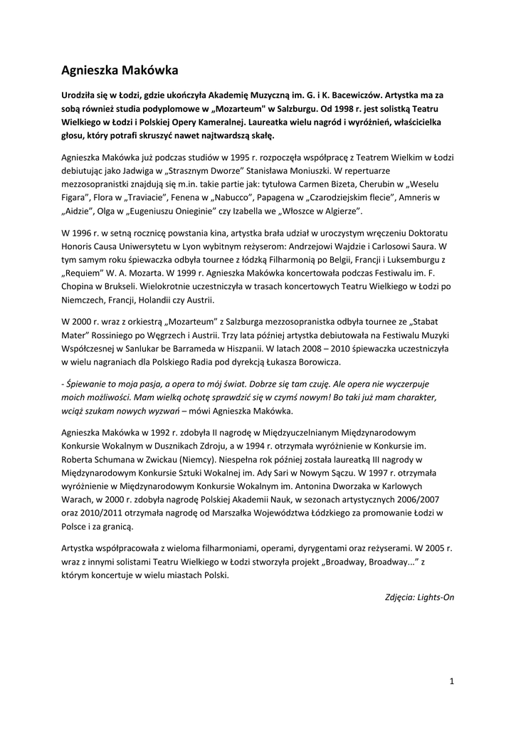 Agnieszka Makówka Urodziła się w Łodzi, gdzie ukończyła Akademię Muzyczną im. G. i K. Bacewiczów. Artystka ma za sobą również studia podyplomowe w „Mozarteum" w Salzburgu. Od 1998 r. jest solistką Teatru Wielkiego w Łodzi i Polskiej Opery Kameralnej. Laureatka wielu nagród i wyróżnień, właścicielka głosu, który potrafi skruszyć nawet najtwardszą skałę. Agnieszka Makówka już podczas studiów w 1995 r. rozpoczęła współpracę z Teatrem Wielkim w Łodzi debiutując jako Jadwiga w „Strasznym Dworze” Stanisława Moniuszki. W repertuarze mezzosopranistki znajdują się m.in. takie partie jak: tytułowa Carmen Bizeta, Cherubin w „Weselu Figara”, Flora w „Traviacie”, Fenena w „Nabucco”, Papagena w „Czarodziejskim flecie”, Amneris w „Aidzie”, Olga w „Eugeniuszu Onieginie” czy Izabella we „Włoszce w Algierze”. W 1996 r. w setną rocznicę powstania kina, artystka brała udział w uroczystym wręczeniu Doktoratu Honoris Causa Uniwersytetu w Lyon wybitnym reżyserom: Andrzejowi Wajdzie i Carlosowi Saura. W tym samym roku śpiewaczka odbyła tournee z łódzką Filharmonią po Belgii, Francji i Luksemburgu z „Requiem” W. A. Mozarta. W 1999 r. Agnieszka Makówka koncertowała podczas Festiwalu im. F. Chopina w Brukseli. Wielokrotnie uczestniczyła w trasach koncertowych Teatru Wielkiego w Łodzi po Niemczech, Francji, Holandii czy Austrii. W 2000 r. wraz z orkiestrą „Mozarteum” z Salzburga mezzosopranistka odbyła tournee ze „Stabat Mater” Rossiniego po Węgrzech i Austrii. Trzy lata później artystka debiutowała na Festiwalu Muzyki Współczesnej w Sanlukar be Barrameda w Hiszpanii. W latach 2008 – 2010 śpiewaczka uczestniczyła w wielu nagraniach dla Polskiego Radia pod dyrekcją Łukasza Borowicza. - Śpiewanie to moja pasja, a opera to mój świat. Dobrze się tam czuję. Ale opera nie wyczerpuje moich możliwości. Mam wielką ochotę sprawdzić się w czymś nowym! Bo taki już mam charakter, wciąż szukam nowych wyzwań – mówi Agnieszka Makówka. Agnieszka Makówka w 1992 r. zdobyła II nagrodę w Międzyuczelnianym Międzynarodowym Konkursie Wokalnym w Dusznikach Zdroju, a w 1994 r. otrzymała wyróżnienie w Konkursie im. Roberta Schumana w Zwickau (Niemcy). Niespełna rok później została laureatką III nagrody w Międzynarodowym Konkursie Sztuki Wokalnej im. Ady Sari w Nowym Sączu. W 1997 r. otrzymała wyróżnienie w Międzynarodowym Konkursie Wokalnym im. Antonina Dworzaka w Karlowych Warach, w 2000 r. zdobyła nagrodę Polskiej Akademii Nauk, w sezonach artystycznych 2006/2007 oraz 2010/2011 otrzymała nagrodę od Marszałka Województwa Łódzkiego za promowanie Łodzi w Polsce i za granicą. Artystka współpracowała z wieloma filharmoniami, operami, dyrygentami oraz reżyserami. W 2005 r. wraz z innymi solistami Teatru Wielkiego w Łodzi stworzyła projekt „Broadway, Broadway...” z którym koncertuje w wielu miastach Polski. Zdjęcia: Lights-On 1