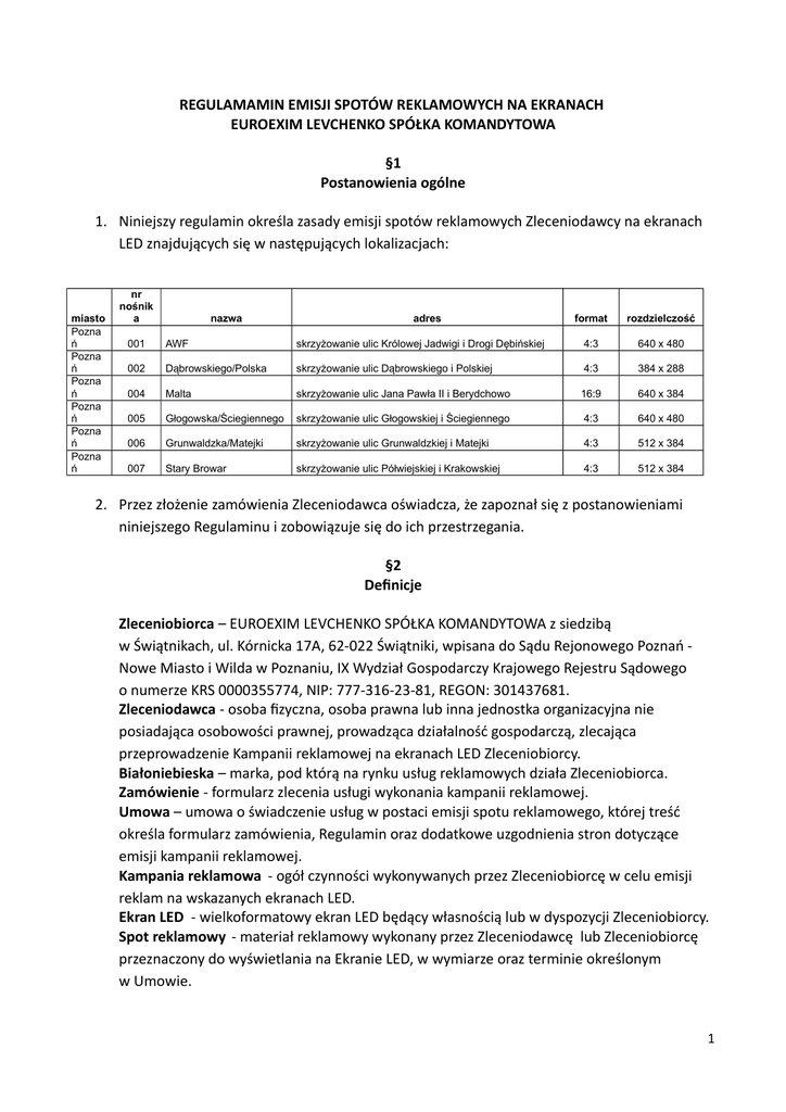 REGULAMAMIN EMISJI SPOTÓW REKLAMOWYCH NA EKRANACH EUROEXIM LEVCHENKO SPÓŁKA KOMANDYTOWA §1 Postanowienia ogólne 1. Niniejszy regulamin określa zasady emisji spotów reklamowych Zleceniodawcy na ekranach LED znajdujących się w następujących lokalizacjach: miasto Pozna ń Pozna ń Pozna ń Pozna ń Pozna ń Pozna ń nr nośnik a nazwa adres format rozdzielczość 001 AWF skrzyżowanie ulic Królowej Jadwigi i Drogi Dębińskiej 4:3 640 x 480 002 Dąbrowskiego/Polska skrzyżowanie ulic Dąbrowskiego i Polskiej 4:3 384 x 288 004 Malta skrzyżowanie ulic Jana Pawła II i Berydchowo 16:9 640 x 384 005 Głogowska/Ściegiennego skrzyżowanie ulic Głogowskiej i Ściegiennego 4:3 640 x 480 006 Grunwaldzka/Matejki skrzyżowanie ulic Grunwaldzkiej i Matejki 4:3 512 x 384 007 Stary Browar skrzyżowanie ulic Półwiejskiej i Krakowskiej 4:3 512 x 384 2. Przez złożenie zamówienia Zleceniodawca oświadcza, że zapoznał się z postanowieniami niniejszego Regulaminu i zobowiązuje się do ich przestrzegania. §2 Definicje Zleceniobiorca – EUROEXIM LEVCHENKO SPÓŁKA KOMANDYTOWA z siedzibą w Świątnikach, ul. Kórnicka 17A, 62-022 Świątniki, wpisana do Sądu Rejonowego Poznań Nowe Miasto i Wilda w Poznaniu, IX Wydział Gospodarczy Krajowego Rejestru Sądowego o numerze KRS 0000355774, NIP: 777-316-23-81, REGON: 301437681. Zleceniodawca - osoba fizyczna, osoba prawna lub inna jednostka organizacyjna nie posiadająca osobowości prawnej, prowadząca działalność gospodarczą, zlecająca przeprowadzenie Kampanii reklamowej na ekranach LED Zleceniobiorcy. Białoniebieska – marka, pod którą na rynku usług reklamowych działa Zleceniobiorca. Zamówienie - formularz zlecenia usługi wykonania kampanii reklamowej. Umowa – umowa o świadczenie usług w postaci emisji spotu reklamowego, której treść określa formularz zamówienia, Regulamin oraz dodatkowe uzgodnienia stron dotyczące emisji kampanii reklamowej. Kampania reklamowa - ogół czynności wykonywanych przez Zleceniobiorcę w celu emisji reklam na wskazanych ekranach LED. Ekran LED - wielkoformatowy ekran LED będący własnością lub w dyspozycji Zleceniobiorcy. Spot reklamowy - materiał reklamowy wykonany przez Zleceniodawcę lub Zleceniobiorcę przeznaczony do wyświetlania na Ekranie LED, w wymiarze oraz terminie określonym w Umowie. 1 §3 Zlecenie oraz warunki emisji kampanii reklamowej 1. Zamówienie kampanii reklamowej następuje z chwilą przesłania przez Zleceniodawcę 2. 3. 4. 5. 6. 7. 8. zlecenia, przygotowanego uprzednio przez Zleceniobiorcę w oparciu o ustalenia stron co do jego warunków. Podpisany formularz zlecenia (skan dokumentu) należy przesłać w formie elektronicznej na adres [email protected] lub kontakt@białoniebieska.pl bądź pocztą na adres: ul. Nizinna 11e/1, 61-424 Poznań. Przesłanie przez Zleceniodawcę formularza zlecenia jest równoznaczne z zawarciem umowy. Formularz zlecenia określa okres - datę rozpoczęcia i zakończenia kampanii reklamowej, opis jej przedmiotu (produkt lub usługa), częstotliwość wyświetlania spotów reklamowych, długość spotu reklamowego oraz lokalizację ekranu LED na którym będzie wyświetlany, kwotę wynagrodzenia za zlecona kampanię reklamową oraz termin płatności. W formularzu zlecenia Zleceniodawca wskazuje czy dostarczy gotowy spot reklamowy czy zleca jego produkcję Zleceniobiorcy. Produkcja spotu jest usługą dodatkowo płatną, na podstawie wyceny przygotowanej przez Zleceniobiorcę. W przypadku zlecenia produkcji spotu reklamowego Zleceniodawcy przysługuje prawo do naniesienia trzech bezpłatnych poprawek w materiale nagraniowym. Zleceniodawca jest zobowiązany dostarczyć swój spot najpóźniej na 2 dni robocze przed rozpoczęciem kampanii reklamowej. Niedostarczenie w terminie spotu nie zwalnia Zleceniodawcy z obowiązku zapłaty wynagrodzenia za wykupiony i niewykorzystany z jego winy czas reklamowy. W przypadku, gdy jakość techniczna przekazanego przez Zleceniodawcę spotu reklamowego uniemożliwia jego emisję, Zleceniobiorca poinformuje o tym fakcie Zleceniodawcę w terminie 2 dni roboczych. W trakcie realizacji zlecenia dopuszcza się, za zgodą Zleceniobiorcy zmianę reklamowanego produktu/usługi na inny produkt/usługę tego samego Zleceniodawcy, bez obowiązku uiszczenia dodatkowych opłat. Zamiana jest możliwa pod warunkiem wykorzystania tej samej ilości czasu reklamowego i tej samej wartości zamówienia oraz zgłoszenia jej nie później niż na 2 dni roboczych przed emisją. §4 Materiały reklamowe 1. Zleceniodawca oświadcza, że przysługują mu prawa autorskie do spotów reklamowych przekazanych Zleceniobiorcy oraz że nie naruszają one praw osób trzecich i są zgodne z obowiązującym na terytorium Rzeczypospolitej Polskiej prawem. 2. Zleceniobiorca nie ponosi odpowiedzialności za naruszenie przez Zleceniodawcę praw osób trzecich, w tym praw autorskich. 3. W przypadku wystąpienia przez osoby trzecie przeciwko Zleceniobiorcy z roszczeniami związanymi z emisją spotów reklamowych, Zleceniodawca jest zobowiązany do zwrotu wszelkich kosztów związanych z koniecznością podjęcia przez Zleceniobiorcę obrony przed tymi roszczeniami. Dotyczy to w szczególności kosztów zastępstwa procesowego, kosztów 2 sądowych, odszkodowań, grzywien, kar oraz innych świadczeń, do zapłaty których zobowiązany będzie Zleceniobiorca. 4. Spoty reklamowe należy przesłać na adres e-mail: [email protected] lub kontakt@białoniebieska.pl w formacie avi, wmv, swf, o wadze nie większej niż 10 MB, nie później niż na 2 dni robocze przed terminem pierwszej zaplanowanej emisji. 5. Materiały reklamowe dostarczane przez Zleceniodawcę podlegają zatwierdzeniu przez Zleceniobiorcę pod względem technicznym i merytorycznym. 6. Zleceniobiorca ma prawo odmówić emisji spotów reklamowych sprzecznych z prawem oraz spotów, których treść godzi w wartości religijne, społeczne lub inne powszechnie chronione i uznaw