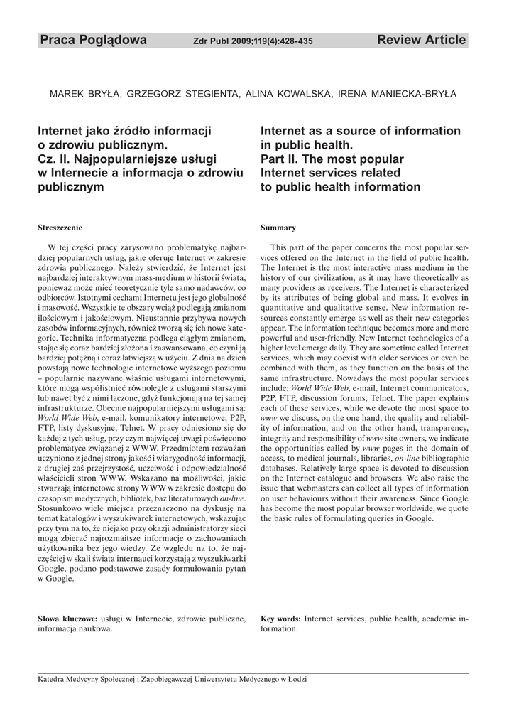 Praca Pogl dowa Zdr Publ 2009;119(4):428-435 Review Article MAREK BRY A, GRZEGORZ STEGIENTA, ALINA KOWALSKA, IRENA MANIECKA-BRY A Internet jako !ród"o informacji o zdrowiu publicznym. Cz. II. Najpopularniejsze us"ugi w Internecie a informacja o zdrowiu publicznym Internet as a source of information in public health. Part II. The most popular Internet services related to public health information Streszczenie Summary W tej części pracy zarysowano problematykę najbardziej popularnych usług, jakie oferuje Internet w zakresie zdrowia publicznego. Należy stwierdzić, że Internet jest najbardziej interaktywnym mass-medium w historii świata, ponieważ może mieć teoretycznie tyle samo nadawców, co odbiorców. Istotnymi cechami Internetu jest jego globalność i masowość. Wszystkie te obszary wciąż podlegają zmianom ilościowym i jakościowym. Nieustannie przybywa nowych zasobów informacyjnych, również tworzą się ich nowe kategorie. Technika informatyczna podlega ciągłym zmianom, stając się coraz bardziej złożona i zaawansowana, co czyni ją bardziej potężną i coraz łatwiejszą w użyciu. Z dnia na dzień powstają nowe technologie internetowe wyższego poziomu – popularnie nazywane właśnie usługami internetowymi, które mogą współistnieć równolegle z usługami starszymi lub nawet być z nimi łączone, gdyż funkcjonują na tej samej infrastrukturze. Obecnie najpopularniejszymi usługami są: World Wide Web, e-mail, komunikatory internetowe, P2P, FTP, listy dyskusyjne, Telnet. W pracy odniesiono się do każdej z tych usług, przy czym najwięcej uwagi poświęcono problematyce związanej z WWW. Przedmiotem rozważań uczyniono z jednej strony jakość i wiarygodność informacji, z drugiej zaś przejrzystość, uczciwość i odpowiedzialność właścicieli stron WWW. Wskazano na możliwości, jakie stwarzają internetowe strony WWW w zakresie dostępu do czasopism medycznych, bibliotek, baz literaturowych on-line. Stosunkowo wiele miejsca przeznaczono na dyskusję na temat katalogów i wyszukiwarek internetowych, wskazując przy tym na to, że niejako przy okazji administratorzy sieci mogą zbierać najrozmaitsze informacje o zachowaniach użytkownika bez jego wiedzy. Ze względu na to, że najczęściej w skali świata internauci korzystają z wyszukiwarki Google, podano podstawowe zasady formułowania pytań w Google. This part of the paper concerns the most popular services offered on the Internet in the field of public health. The Internet is the most interactive mass medium in the history of our civilization, as it may have theoretically as many providers as receivers. The Internet is characterized by its attributes of being global and mass. It evolves in quantitative and qualitative sense. New information resources constantly emerge as well as their new categories appear. The information technique becomes more and more powerful and user-friendly. New Internet technologies of a higher level emerge daily. They are sometime called Internet services, which may coexist with older services or even be combined with them, as they function on the basis of the same infrastructure. Nowadays the most popular services include: World Wide Web, e-mail, Internet communicators, P2P, FTP, discussion forums, Telnet. The paper explains each of these services, while we devote the most space to www we discuss, on the one hand, the quality and reliability of information, and on the other hand, transparency, integrity and responsibility of www site owners, we indicate the opportunities called by www pages in the domain of access, to medical journals, libraries, on-line bibliographic databases. Relatively large space is devoted to discussion on the Internet catalogue and browsers. We also raise the issue that webmasters can collect all types of information on user behaviours without their awareness. Since Google has become the most popular browser worldwide, we quote the basic rules of formulating queries in Google. Słowa kluczowe: usługi w Internecie, zdrowie publiczne, informacja naukowa. Key words: Internet services, public health, academic information. Katedra Medycyny Społecznej i Zapobiegawczej Uniwersytetu Medycznego w Łodzi 429 Zdr Publ 2009;119(4) WORLD WIDE WEB World Wide Web (skrót: WWW lub Web od ang. website – strona WWW) to sieciowy (w sieciach opartych na stosie protokołów TCP/IP), hipertekstowy i multimedialny system umożliwiający publikowanie informacji, oparty o publicznie dostępne standardy IETF i W3C. Jest to najpopularniejsza usługa w Internecie realizowana w oparciu o model określany jako „klient-serwer”, pozwalająca na udostępnianie (po stronie serwera) oraz przeglądanie (po stronie klienta) dokumentów zawierających tekst, grafi kę, wideo, dźwięk. Serwerem WWW może być każdy komputer podłączony do Internetu, który posiada publiczny adres IP. Każdy, zarówno osoba prywatna, firma czy jakakolwiek inna organizacja może uzyskać publiczny adres IP od swojego ISP (ang. Internet Service Provider – Dostawca Usług Internetowych). Zależnie od dostawcy Internetu, za przydzielenie takiego publicznego, stałego adresu IP należy zazwyczaj wnieść dodatkową opłatę – jednorazową lub comiesięczną. W obecnej wersji (ipv4) adres ten jest 32-bitowym ciągiem liczb, podzielonym na cztery części zwanymi oktetami rozdzielonymi kropkami – każdy oktet zapisany jest w formie dziesiętnej z zakresu od 0 do 255. Dla przykładu, obecny adres IP serwera, na którym umieszczono stronę główną Uniwersytetu Medycznego w Łodzi w zapisie dziesiętnym to: 212.51.199.181. Klientem systemu World Wide Web może być każdy komputer podłączony do Internetu (również taki, któremu nie przydzielono publicznego adresu IP), który posiada specjalne oprogramowanie do przeglądania stron WWW, czyli przeglądarkę internetową (ang. web browser) – obecnie najpopularniejsze to: Mozilla Firefox (Mozilla Firefox jest darmową przegląd
