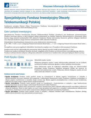 Kluczowe Informacje dla Inwestorów Niniejszy dokument zawiera kluczowe informacje dla inwestorów dotyczące tego Funduszu. Nie są to materiały marketingowe. Dostarczenie tych informacji jest wymogiem prawnym mającym na celu ułatwienie zrozumienia charakteru i ryzyka związanego z inwestowaniem w ten Fundusz. Przeczytanie niniejszego dokumentu jest zalecane inwestorowi, aby mógł on podjąć świadomą decyzję inwestycyjną. Specjalistyczny Fundusz Inwestycyjny Otwarty Telekomunikacji Polskiej Funduszem zarządza Pioneer Pekao Towarzystwo Funduszy Inwestycyjnych S.A., członek grupy bankowej UniCredit Banking Group. Kategoria Jednostki Uczestnictwa: brak PLN RFI 95, ISIN PLPPTFI00154 Cele i polityka inwestycyjna Specjalistyczny Fundusz Inwestycyjny Otwarty Telekomunikacji Polskiej („Fundusz”) jest funduszem zrównoważonym. Fundusz inwestuje aktywa w akcje polskich spółek notowanych na Giełdzie Papierów Wartościowych w Warszawie, które łącznie mogą stanowić maksymalnie 40% aktywów Funduszu. Dłużne instrumenty finansowe, głównie obligacje skarbowe oraz depozyty bankowe, mogą stanowić maksymalnie 100% aktywów Funduszu. Wskaźnikiem (benchmarkiem) służącym do oceny efektywności inwestycji jest: 0,35 x WIG + 0,65 x (1/2 x Citigroup Poland Government Bond Index 1-3 + 1/2 x Citigroup Poland Government Bond Index 35). Szczegółowy opis poszczególnych składników benchmarku znajduje się w Prospekcie informacyjnym Funduszu. Fundusz może nie być odpowiedni dla inwestorów, którzy planują wycofać środki przed upływem 2 - 3 lat. Fundusz nie wypłaca dywidend. Wszelkie dochody osiągnięte przez Fundusz są reinwestowane i powiększają jego aktywa. Fundusz realizuje zlecenia nabycia i odkupienia jednostek uczestnictwa w każdym dniu roboczym będącym dniem wyceny. Profil Ryzyka i Zysku Niższe ryzyko Wyższe ryzyko Wskaźnik ryzyka i zysku: Wskazana kategoria ryzyka i zysku odzwierciedla zmienność cen na rynkach, na których Fundusz inwestuje zgodnie z celem i polityką inwestycyjną. Potencjalnie niższy zysk Potencjalnie wyższy zysk Dane historyczne użyte do kalkulacji wskaźnika mogą nie odzwierciedlać przyszłego ryzyka Funduszu. Najniższa kategoria ryzyka nie oznacza, że Fundusz jest pozbawiony ryzyka. Wskazana obecnie kategoria ryzyka nie jest stała, może ulec zmianie w czasie. Dodatkowe czynniki ryzyka Funduszu: Funduszu: • Ryzyko kredytowe: Fundusz może ponieść stratę na transakcjach w dłużne papiery wartościowe w związku z niewywiązaniem się przez emitenta tych papierów z zobowiązań finansowych wobec Funduszu. Fundusze inwestujące w dłużne papiery wartościowe o wysokiej stopie zwrotu (np. dłużne papiery przedsiębiorstw o niskiej ocenie kredytowej, bądź bez tej oceny) mają z reguły wyższe ryzyko kredytowe. • Ryzyko kontrahenta: Fundusz może ponieść stratę na transakcjach z kontrahentem w związku z jego bankructwem i niewywiązaniem się przez niego z zobowiązań finansowych wobec Funduszu. • Ryzyko płynności: Fundusz może inwestować w papiery wartościowe, które wskutek niekorzystnych warunków rynkowych staną się niepłynne. Może to mieć wpływ na czas i cenę sprzedaży tych papierów w związku z potencjalnymi odkupieniami w Funduszu, skutkować to może także zawieszeniem odkupień jednostek uczestnictwa Funduszu. • Ryzyko operacyjne: Fundusz może ponieść stratę w związku z błędami ludzkimi bądź zaniedbaniem, błędami obsługi, zakłóceniami systemów oraz zdarzeniami zewnętrznymi. PLPPTFI0015412052014, Strona 1 Specjalistyczny Fundusz Inwestycyjny Otwarty Telekomunikacji Polskiej: Kluczowe Informacje dla Inwestorów Opłaty Poniższe opłaty służą pokryciu kosztów działania Funduszu, w tym kosztów dystrybucji i kosztów wprowadzania Funduszu do obrotu. Opłaty te zmniejszają potencjalny wzrost inwestycji. Opłaty jednorazowe pobierane przed lub po dokonaniu inwestycji Opłata za nabycie brak Opłata za odkupienie brak Jest to maksymalna stawka, jaka może zostać pobrana z Państwa środków przed ich zainwestowaniem lub wypłaceniem środków z inwestycji. Opłaty pobierane z Funduszu w ciągu roku Opłaty i koszty bieżące 0,43% Opłaty pobierane z Funduszu w określonych warunkach szczególnych Opłata za wyniki brak Opłaty i koszty bieżące to łączna wartość kosztów operacyjnych Funduszu do średniej rocznej wartości aktywów netto. Wartość liczbowa określająca wysokość tych opłat opiera się na wydatkach z roku 2013. Wysokość opłat bieżących może co roku ulegać zmianie. Szczegółowe informacje na temat opłat stosowanych w Funduszu wskazane są w Rozdziale III pkt 26. Prospektu informacyjnego Funduszu. Wyniki osiągnięte w przeszłości 4,2% 3,4% 16,5% 14,8% 10,0% 10,4% 15,5% 16,5% 6,1% 4,8% 15,5% 15,4% 15,5% 14,8% 11,9% 30% 12,5% Poniższy wykres prezentuje wyniki osiągnięte w przeszłości (w PLN), po uwzględnieniu wszystkich opłat Funduszu z wyłączeniem opłaty za nabycie. Wyniki osiągane w przeszłości mają ograniczoną przydatność do oceny przyszłych wyników. -30% 2004 2005 2006 2007 2008 2009 Fundusz Benchmark 2010 -2,5% -5,3% -11,3% -13,8% 0% 2011 2012 2013 Rok utworzenia Funduszu: 2001 Informacje praktyczne • Depozytariusz: Bank Handlowy w Warszawie S.A. • Fundusz został utworzony na podstawie zezwolenia udzielonego przez Komisję Nadzoru Finansowego (KNF) na prowadzenie działalności w Polsce i podlega jej nadzorowi. • Spółka Pioneer Pekao Towarzystwo Funduszy Inwestycyjnych S.A. otrzymała zezwolenie na prowadzenie działalności w Polsce i podlega nadzorowi KNF. • Pełne informacje na temat Funduszu znajdują się w Prospekcie informacyjnym i Statucie Funduszu. • Prospekty informacyjne oraz roczne i półroczne sprawozdania finansowe sporządzane są w języku polskim i bezpłatnie udostępniane na stronie internetowej www.pioneer.com.pl oraz w placówkach Prowadzących Dystrybucję. • Dodatkowe i