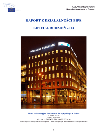 PARLAMENT EUROPEJSKI BIURO INFORMACYJNE W POLSCE RAPORT Z DZIAŁALNOŚCI BIPE LIPIEC-GRUDZIEŃ 2013 Biuro Informacyjne Parlamentu Europejskiego w Polsce ul. Jasna 14/16a 00-041 Warszawa tel.: +48 22 595 24 70; faks: +48 22 595 24 80 e-mail: [email protected] ; www.europarl.pl; www.facebook.com/epwarszawa 1 PARLAMENT EUROPEJSKI BIURO INFORMACYJNE W POLSCE SPIS TREŚCI MISJA BIURA INFORMACYJNEGO PARLAMENTU EUROPEJSKIEGO W POLSCE ..........3 DZIAŁANIA BIPE W OKRESIE LIPIEC-GRUDZIEŃ 2013............................................................5 LIPIEC ...................................................................................................................................................5 SIERPIEŃ ...............................................................................................................................................5 WRZESIEŃ .............................................................................................................................................6 PAŹDZIERNIK ........................................................................................................................................9 LISTOPAD ............................................................................................................................................10 GRUDZIEŃ ...........................................................................................................................................13 DZIAŁANIA BIPE O CHARAKTERZE CIĄGŁYM .......................................................................15 2 PARLAMENT EUROPEJSKI BIURO INFORMACYJNE W POLSCE MISJA BIURA INFORMACYJNEGO PARLAMENTU EUROPEJSKIEGO W POLSCE Biuro Informacyjne Parlamentu Europejskiego (BIPE) realizuje w Polsce strategię komunikacyjną i plan działania Dyrekcji Generalnej Parlamentu Europejskiego ds. Komunikacji zgodnie z decyzjami Prezydium PE. Jego głównymi celami są: informowanie obywateli bezpośrednio i poprzez media (ogólnokrajowe, regionalne i specjalistyczne) o decyzjach podejmowanych przez Parlament Europejski (PE); możliwie jak najszersze promowanie Parlamentu i jego działalności. Biuro zaprasza do uczestnictwa w swoich działaniach możliwie jak największą liczbę posłów do PE. Główne zadania BIPE w 2013 roku: pogłębienie wiedzy o PE wśród obywateli i organizacji społeczeństwa obywatelskiego, w celu umożliwienia większego zaangażowania w sprawy Unii Europejskiej oraz zachęcenia do udziału w wyborach europejskich; zwiększenie zasięgu komunikacji dotyczącej PE poprzez wykorzystanie oddziaływania mediów i liderów opinii publicznej; celem działań Biura jest dotarcie z informacją o PE do obywateli ze wszystkich istotnych grup społecznych w Polsce, a w szczególności do młodzieży oraz organizacji społeczeństwa obywatelskiego; realizacja w Polsce kampanii informacyjnych organizowanych przez PE i dotyczących wyborów europejskich, kluczowych prac legislacyjnych PE, Nagrody im. Sacharowa, Nagrody LUX, Europejskiej Nagrody Obywatelskiej, Nagrody im. Karola Wielkiego dla Młodzieży oraz Międzynarodowego Dnia Kobiet; rozwój działań na poziomie lokalnym, między innymi dzięki Regionalnym Forom Dyskusyjnym z udziałem posłów do PE, których tematem są prace legislacyjne PE mające szczególne znaczenie dla danego regionu; budowanie trwałych relacji z liderami opinii publicznej, mediami i organizacjami społeczeństwa obywatelskiego, szczególnie w kontekście przygotowań do najbliższych wyborów do PE w maju 2014 roku; kontynuacja bliskiej współpracy z mediami poprzez kontakty z dziennikarzami zainteresowanymi sesjami plenarnymi, pracą konkretnych komisji PE, lub poszczególnymi decyzjami PE; zwiększenie widoczności PE przy pomocy programu Euroscola, który stanowi atrakcyjne wprowadzenia w tematykę europejską dla przyszłych młodych wyborców, którzy będą uczestniczyć w wyborach do Parlamentu Europejskiego w 2014 r.; 3 PARLAMENT EUROPEJSKI BIURO INFORMACYJNE W POLSCE dalszy rozwój działań informacyjnych Biura poprzez uruchomienie nowej strony internetowej oraz intensywną komunikację za pomocą portali społecznościowych Facebook i Twitter; koordynacja i wsparcie Biura Informacyjnego PE we Wrocławiu; pogłębienie współpracy z Przedstawicielstwem Komisji Europejskiej w Polsce i rządem RP w ramach programu „Partnerstwo w Zarządzaniu” w celu zapewnienia dobrej widoczności PE w okresie przedwyborczym. KRÓTKI PRZEGLĄD DZIAŁALNOŚCI BIPE W LICZBACH W całym roku 2013 BIPE w Polsce: zapewniło dystrybucję ponad 100 tysięcy ulotek, broszur informacyjnych i materiałów promocyjnych o PE; udzieliło ponad 750 odpowiedzi na listy obywateli i ponad 1200 informacji telefonicznych; zorganizowało 9 konferencji prasowych z udziałem posłów do PE; wydało ponad 280 komunikatów prasowych i wysłało 2372 informacji SMSowych dla dziennikarzy; zaprosiło 90 dziennikarzy na seminaria i sesje Parlamentu w Strasburgu i Brukseli; zarządzało stroną internetową www.europarl.pl, którą w 2013 roku odwiedziło 52 959 osób, profilem na portalu Facebook, który „polubiło” do tej pory ponad 5 250 osób oraz kontem na portalu Twitter, które obserwuje ponad 500 osób; zapewniło wyjazdy 459 uczniów do Strasburga w ramach programu Euroscola; opracowało 285 przeglądów prasy. 4 PARLAMENT EUROPEJSKI BIURO INFORMACYJNE W POLSCE DZIAŁANIA BIPE W OKRESIE LIPIEC-GRUDZIEŃ 2013 Lipiec Wykład w ramach Szkoły Liderów Polonijnych Europy Zachodniej 5 lipca BIPE gościło uczestników Szkoły Liderów Polonijnych Europy Zachodniej, którzy wysłuchali wykładu na temat: „Korzystanie z praw obywatelskich w Unii Europejskiej – udział w wyborach do Parlamentu Europejskiego”, wygłoszonego przez attaché prasowego BIPE Piotra Wolskiego. W wykładzie wzięło udział 30 osób - działaczy polonijnych oraz aktywnych w życiu publicznym swoich krajów osób polskiego pochodzenia, w wieku 20-40 lat, m