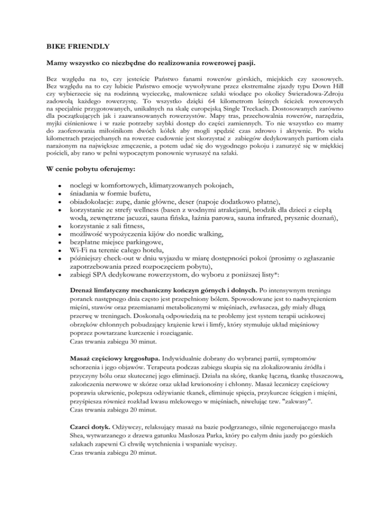 BIKE FRIENDLY Mamy wszystko co niezbędne do realizowania rowerowej pasji. Bez względu na to, czy jesteście Państwo fanami rowerów górskich, miejskich czy szosowych. Bez względu na to czy lubicie Państwo emocje wywoływane przez ekstremalne zjazdy typu Down Hill czy wybierzecie się na rodzinną wycieczkę, malownicze szlaki wiodące po okolicy Świeradowa-Zdroju zadowolą każdego rowerzystę. To wszystko dzięki 64 kilometrom leśnych ścieżek rowerowych na specjalnie przygotowanych, unikalnych na skalę europejską Single Treckach. Dostosowanych zarówno dla początkujących jak i zaawansowanych rowerzystów. Mapy tras, przechowalnia rowerów, narzędzia, myjki ciśnieniowe i w razie potrzeby szybki dostęp do części zamiennych. To nie wszystko co mamy do zaoferowania miłośnikom dwóch kółek aby mogli spędzić czas zdrowo i aktywnie. Po wielu kilometrach przejechanych na rowerze cudownie jest skorzystać z zabiegów dedykowanych partiom ciała narażonym na największe zmęczenie, a potem udać się do wygodnego pokoju i zanurzyć się w miękkiej pościeli, aby rano w pełni wypoczętym ponownie wyruszyć na szlaki. W cenie pobytu oferujemy: noclegi w komfortowych, klimatyzowanych pokojach, śniadania w formie bufetu, obiadokolacje: zupę, danie główne, deser (napoje dodatkowo płatne), korzystanie ze strefy wellness (basen z wodnymi atrakcjami, brodzik dla dzieci z ciepłą wodą, zewnętrzne jacuzzi, sauna fińska, łaźnia parowa, sauna infrared, prysznic doznań), korzystanie z sali fitness, możliwość wypożyczenia kijów do nordic walking, bezpłatne miejsce parkingowe, Wi-Fi na terenie całego hotelu, późniejszy check-out w dniu wyjazdu w miarę dostępności pokoi (prosimy o zgłaszanie zapotrzebowania przed rozpoczęciem pobytu), zabiegi SPA dedykowane rowerzystom, do wyboru z poniższej listy*: Drenaż limfatyczny mechaniczny kończyn górnych i dolnych. Po intensywnym treningu poranek następnego dnia często jest przepełniony bólem. Spowodowane jest to nadwyrężeniem mięśni, stawów oraz przemianami metabolicznymi w mięśniach, zwłaszcza, gdy miały długą przerwę w treningach. Doskonałą odpowiedzią na te problemy jest system terapii uciskowej obrzęków chłonnych pobudzający krążenie krwi i limfy, który stymuluje układ mięśniowy poprzez powtarzane kurczenie i rozciąganie. Czas trwania zabiegu 30 minut. Masaż częściowy kręgosłupa. Indywidualnie dobrany do wybranej partii, symptomów schorzenia i jego objawów. Terapeuta podczas zabiegu skupia się na zlokalizowaniu źródła i przyczyny bólu oraz skutecznej jego eliminacji. Działa na skórę, tkankę łączną, tkankę tłuszczową, zakończenia nerwowe w skórze oraz układ krwionośny i chłonny. Masaż leczniczy częściowy poprawia ukrwienie, polepsza odżywianie tkanek, eliminuje spięcia, przykurcze ścięgien i mięśni, przyśpiesza również rozkład kwasu mlekowego w mięśniach, niwelując tzw. "zakwasy". Czas trwania zabiegu 20 minut. Czarci dotyk. Odżywczy, relaksujący masaż na bazie podgrzanego, silnie regenerującego masła Shea, wytwarzanego z drzewa gatunku Masłosza Parka, który po całym dniu jazdy po górskich szlakach zapewni Ci chwilę wytchnienia i wspaniale wyciszy. Czas trwania zabiegu 20 minut. *przy pobycie - 2-dniowym - 1 zabieg, - 3-dniowym - 2 zabiegi, - 4-dniowym - 3 zabiegi Ponadto specjalnie dla rowerzystów: możliwość wypożyczenia i testowania rowerów marki PEUGEOT, korzystanie z przechowalni rowerów, torby na brudną odzież i buty dla powracających z tras rowerowych, możliwość zakupu bezpośrednio w recepcji hotelu biletów na Kolej Gondolową SKI & SUN, która działa również w okresie letnim i daje rowerzystom możliwość rozpoczęcia jazdy ze szczytu Stogu Izerskiego (przewóz roweru bez dodatkowych dopłat), Bike Wash, dostęp do miejsca, w którym można umyć rower, możliwość wypożyczenia suszarek do butów, kompleksowa informacja o Single Treck – kompleksie leśnych ścieżek rowerowych, ze zróżnicowanym stopniem poziomów trudności (4 poziomy). Dodatkowe atrakcje czekające na Państwa w trakcie pobytu: Specjalnie dla naszych Gości ROWEROWA AKADEMIA COTTONINY połączona z możliwością testowania najnowszych rowerów marki PEUGEOT. Prowadzona przez Adam Łukaszewskiego, profesjonalistę od 12 lat startującego w ekstremalnych zawodach rowerowych, który zabierze chętnych na szlaki rowerowe i podpowie jakie techniki jazdy stosować by jazda na rowerze w każdych warunkach i niezależnie od umiejętności była zawsze świetną zabawą. Najbliższa edycja Rowerowe Otwarcie Wakacji w terminie 28-30.06. 2013. Bezpłatna konsultacja kosmetyczna dla każdej dorosłej osoby w trakcie której eksperci SPA wskażą najlepsze metody pielęgnacji cery i polecą najskuteczniejsze zabiegi dostępne w naszym unikalnym SPA menu. Wyprawa na piknik, którą polecamy wszystkim spragnionym kontaktu z naturą. Miejsce, w którym spędzą Państwo ten dzień będzie piękne i pełne zieleni. Wskażemy drogę na najbardziej urokliwą polanę oraz umożliwimy zakup kosza piknikowego wypełnionego zdrowymi owocami i warzywami. Zadbamy również o to, żeby w koszu znalazły się autorskie przysmaki Szefa Kuchni. Słoneczna łąka, wypoczynek w promieniach słońca. Wierzymy, że pogoda będzie prawdziwie letnia i promienie słoneczne pozwolą na błogi relaks. Wygodne leżaki rozstawione na otaczających Cottoninę trawnikach, zachęcać będą do leniwego spędzenia czasu. Pełne tajemnic zabytkowe zamki i młyn owiany legendą. Między innymi Zamek Czocha, Zamek Frydlant i Czarci Młyn sąsiadujący z Cottoniną. Góry Izerskie pełne oznakowanych szlaków turystycznych jak i całej sieci śródleśnych dróg i ścieżek, które pozwolą dotrzeć do tajemniczych i pięknych zakątków na górskich polanach, przełęczach i szczytach. Spacery nordic walking po okolicznych szlakach. Marsz z kijami to nie tylko przyjemność,