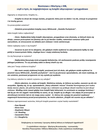 Rozmowa z Martyną z IIIB, czyli o tym, że najpiękniejsze są książki obyczajowe i przygodowe Zagrajmy w skojarzenia. Książka to… - Książka to drzwi do innego świata, przyjaciel, który jest na dobre i na złe, emocje te przyjemne i te trochę gorsze. Co przeczytałaś ostatnio? - Ostatnio przeczytałam książkę Laury Whitcomb „Światła Pochylenie”. Jakie książki lubisz najbardziej? - Hmm. Najbardziej lubię książki obyczajowe, przygodowe oraz dramaty, w których dużo się dzieje, czasem przeczytam też fantasy ale to już bardzo rzadko, natomiast romanse tylko pod warunkiem, że streszczenie na okładce jest ciekawe i mnie zainteresuje. Gdzie najlepiej czyta ci się książki? - Szczerze to jest mi to obojętne, ale gdybym miała wybierać to zdecydowanie byłby to mój pokój w towarzystwie łóżka, ciepłego koca i mojej ulubionej herbaty. Co cię fascynuje w czytaniu? - Najbardziej fascynują mnie przygody bohaterów, ich zachowanie podczas próby rozwiązania jakiegoś problemu. To czy poradzą sobie w danej chwili czy nie. Jaka jest Twoja ulubiona książka? - Nie mam swojej ulubionej książki, ponieważ jest ich dużo, ale gdybym miała wybierać to powieść Laury Whitcomb „Światła pochylenie”. Jest to jej pierwsze opowiadanie, ale mam nadzieję, że nie ostatnie, ponieważ przyjemnie mi się czytało jej wydanie. Czy lektury szkolne to radość czytania czy udręka? - Moim zdaniem, to zależy od książki. Niektórzy mówią, że lektury są nudne, owszem są ale nie wszystkie. Zgodzę się, że np. opowiadanie „Stary człowiek i morze” Ernesta Hemingwaya jest nudne kiedy starzec płynie, ale później kiedy zmaga się z rekinami czy próbuje złowić marlina to jest dosyć ciekawe. Według mnie nawet gdyby inne książki były lekturami, to uczniowie ze swojego lenistwa i tak by po nie nie sięgali i twierdziliby to samo, że np. książki są za długie i nie zdążą ich przeczytać w określonym terminie lub że nie mają czasu czytać. Ci, którzy nie czytają nie powinni wydawać nagannych komentarzy przed przeczytaniem, bo moim zdaniem „Książki nie ocenia się po okładce”. Możesz zaproponować autorów, których książki powinien czytać każdy nastolatek? - Ewa Nowak - Kiera Cass - Stephanie Meyer - J.K. Rowling - Cassandra Clare - C.J. Daugherty Dziękujemy za rozmowę i życzymy dobrej lektury w kolejnych tygodniach! Z czytelnikiem miesiąca - Martyną Brzostowską - rozmawiały: Karolina Piaszczyńska i Milena Żbikowska z Koła czytelniczo-medialnego.
