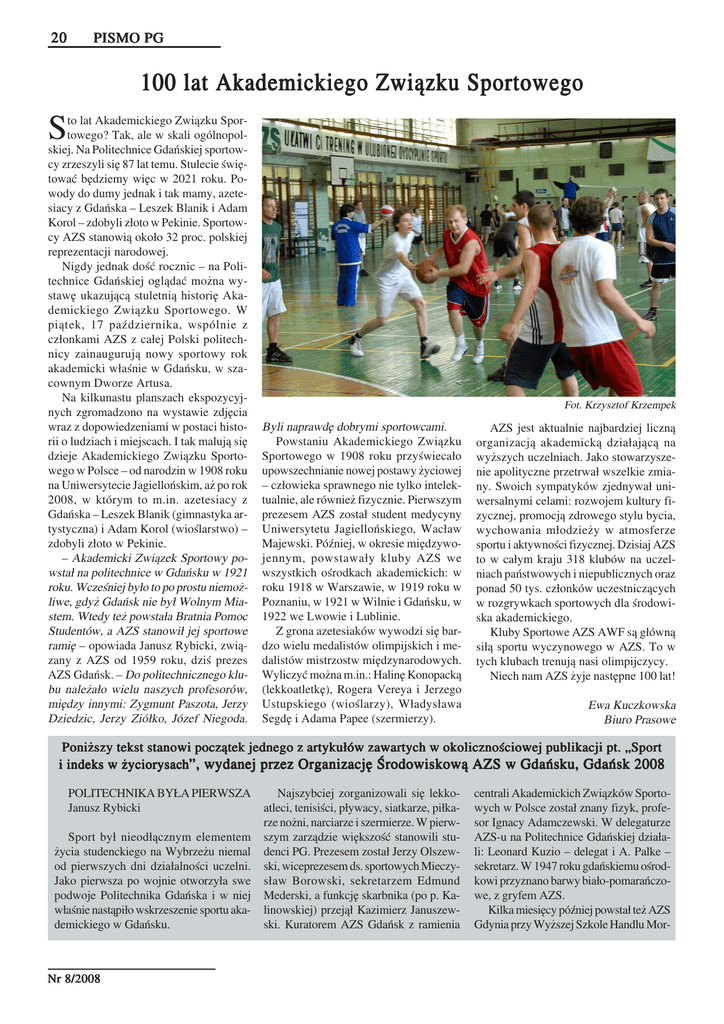 20 PISMO PG 100 lat Akademickiego Związku Sportowego S to lat Akademickiego Związku Spor− towego? Tak, ale w skali ogólnopol− skiej. Na Politechnice Gdańskiej sportow− cy zrzeszyli się 87 lat temu. Stulecie świę− tować będziemy więc w 2021 roku. Po− wody do dumy jednak i tak mamy, azete− siacy z Gdańska – Leszek Blanik i Adam Korol – zdobyli złoto w Pekinie. Sportow− cy AZS stanowią około 32 proc. polskiej reprezentacji narodowej. Nigdy jednak dość rocznic – na Poli− technice Gdańskiej oglądać można wy− stawę ukazującą stuletnią historię Aka− demickiego Związku Sportowego. W piątek, 17 października, wspólnie z członkami AZS z całej Polski politech− nicy zainaugurują nowy sportowy rok akademicki właśnie w Gdańsku, w sza− cownym Dworze Artusa. Na kilkunastu planszach ekspozycyj− nych zgromadzono na wystawie zdjęcia wraz z dopowiedzeniami w postaci histo− rii o ludziach i miejscach. I tak malują się dzieje Akademickiego Związku Sporto− wego w Polsce – od narodzin w 1908 roku na Uniwersytecie Jagiellońskim, aż po rok 2008, w którym to m.in. azetesiacy z Gdańska – Leszek Blanik (gimnastyka ar− tystyczna) i Adam Korol (wioślarstwo) – zdobyli złoto w Pekinie. – Akademicki Związek Sportowy po− wstał na politechnice w Gdańsku w 1921 roku. Wcześniej było to po prostu niemoż− liwe, gdyż Gdańsk nie był Wolnym Mia− stem. Wtedy też powstała Bratnia Pomoc Studentów, a AZS stanowił jej sportowe ramię – opowiada Janusz Rybicki, zwią− zany z AZS od 1959 roku, dziś prezes AZS Gdańsk. – Do politechnicznego klu− bu należało wielu naszych profesorów, między innymi: Zygmunt Paszota, Jerzy Dziedzic, Jerzy Ziółko, Józef Niegoda. Fot. Krzysztof Krzempek Byli naprawdę dobrymi sportowcami. Powstaniu Akademickiego Związku Sportowego w 1908 roku przyświecało upowszechnianie nowej postawy życiowej – człowieka sprawnego nie tylko intelek− tualnie, ale również fizycznie. Pierwszym prezesem AZS został student medycyny Uniwersytetu Jagiellońskiego, Wacław Majewski. Później, w okresie międzywo− jennym, powstawały kluby AZS we wszystkich ośrodkach akademickich: w roku 1918 w Warszawie, w 1919 roku w Poznaniu, w 1921 w Wilnie i Gdańsku, w 1922 we Lwowie i Lublinie. Z grona azetesiaków wywodzi się bar− dzo wielu medalistów olimpijskich i me− dalistów mistrzostw międzynarodowych. Wyliczyć można m.in.: Halinę Konopacką (lekkoatletkę), Rogera Vereya i Jerzego Ustupskiego (wioślarzy), Władysława Segdę i Adama Papee (szermierzy). AZS jest aktualnie najbardziej liczną organizacją akademicką działającą na wyższych uczelniach. Jako stowarzysze− nie apolityczne przetrwał wszelkie zmia− ny. Swoich sympatyków zjednywał uni− wersalnymi celami: rozwojem kultury fi− zycznej, promocją zdrowego stylu bycia, wychowania młodzieży w atmosferze sportu i aktywności fizycznej. Dzisiaj AZS to w całym kraju 318 klubów na uczel− niach państwowych i niepublicznych oraz ponad 50 tys. członków uczestniczących w rozgrywkach sportowych dla środowi− ska akademickiego. Kluby Sportowe AZS AWF są główną siłą sportu wyczynowego w AZS. To w tych klubach trenują nasi olimpijczycy. Niech nam AZS żyje następne 100 lat! Ewa Kuczkowska Biuro Prasowe Poniższy tekst stanowi początek jednego z artykułów zawartych w okolicznościowej publikacji pt. „Sport i indeks w życiorysac h”, wydanej przez Organizację Środowiskową AZS w Gdańsku, Gdańsk 2008 życiorysach POLITECHNIKA BYŁA PIERWSZA Janusz Rybicki Sport był nieodłącznym elementem życia studenckiego na Wybrzeżu niemal od pierwszych dni działalności uczelni. Jako pierwsza po wojnie otworzyła swe podwoje Politechnika Gdańska i w niej właśnie nastąpiło wskrzeszenie sportu aka− demickiego w Gdańsku. Nr 8/2008 Najszybciej zorganizowali się lekko− atleci, tenisiści, pływacy, siatkarze, piłka− rze nożni, narciarze i szermierze. W pierw− szym zarządzie większość stanowili stu− denci PG. Prezesem został Jerzy Olszew− ski, wiceprezesem ds. sportowych Mieczy− sław Borowski, sekretarzem Edmund Mederski, a funkcję skarbnika (po p. Ka− linowskiej) przejął Kazimierz Januszew− ski. Kuratorem AZS Gdańsk z ramienia centrali Akademickich Związków Sporto− wych w Polsce został znany fizyk, profe− sor Ignacy Adamczewski. W delegaturze AZS−u na Politechnice Gdańskiej działa− li: Leonard Kuzio – delegat i A. Palke – sekretarz. W 1947 roku gdańskiemu ośrod− kowi przyznano barwy biało−pomarańczo− we, z gryfem AZS. Kilka miesięcy później powstał też AZS Gdynia przy Wyższej Szkole Handlu Mor− PISMO PG skiego, przemianowany na AZS Sopot po przeniesieniu tam WSHM. Z inicjatywy centrali AZS, w 1947 roku nastąpiło zjed− noczenie tych klubów pod nazwą AZS Wybrzeże. Pierwszym prezesem został student WSHM, Marek Lenarcik, a na delegata AZS przy PG wybrano Pawła Zimnego. W jakże odmiennych niż przedwojen− ne warunkach przyszło działać sportow− com akademickim po wyzwoleniu. Pań− stwo otoczyło opieką rozwój życia spor− towego w kraju, w tym i w AZS−ie, jedno− cześnie narzucając struktury organizacyj− ne i „programując” działalność sportową. Organizowano fachowe kursy dla kadry instruktorskiej, udostępniano odbudowa− ne ze zniszczeń wojennych obiekty spor− towe. W 1949 roku przeprowadzono reformę sportu polskiego, powołując do życia zrze− szenia sportowe, a likwidując związki sportowe. Do zadań Akademickiego Zrzeszenia Sportowego (na szczęście dalej AZS−u, choć groziła zmiana nazwy na odpowied− nik radzieckiego „Buriewiestnika” – do tradycyjnej nazwy Akademicki Związek Sportowy powrócił po przemianach po− litycznych roku 1956), oprócz organiza− cji sportu wyczynowego, należało rozwi− janie sportu masowego. W tym celu utwo− rzono koła sportowe na uczelni i wydzia− 