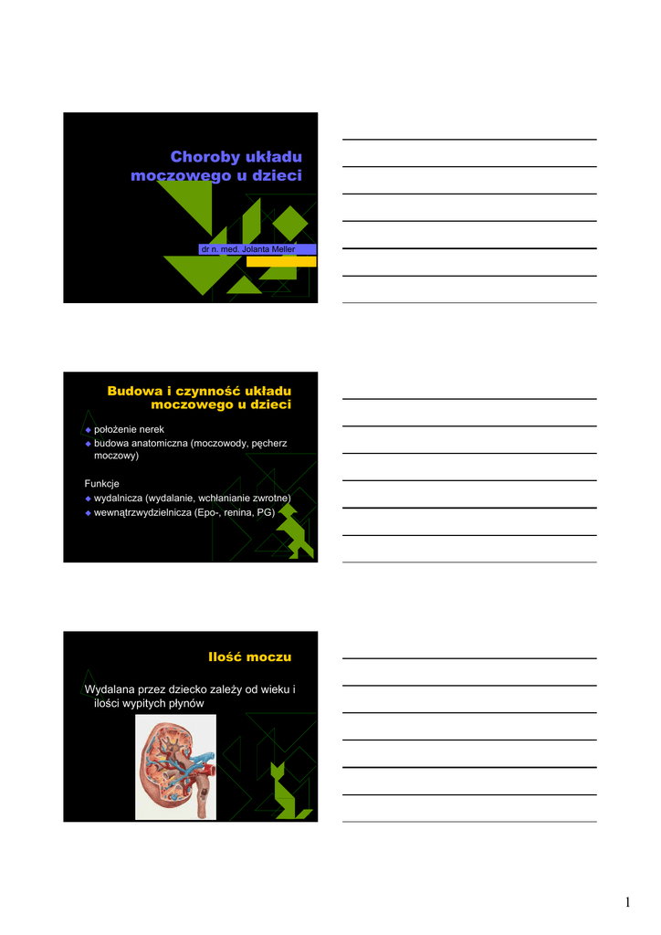 Choroby układu moczowego u dzieci dr n. med. Jolanta Meller Budowa i czynność układu moczowego u dzieci położenie nerek budowa anatomiczna (moczowody, pęcherz moczowy) Funkcje wydalnicza (wydalanie, wchłanianie zwrotne) wewnątrzwydzielnicza (Epo-, renina, PG) Ilość moczu Wydalana przez dziecko zależy od wieku i ilości wypitych płynów 1 Laboratoryjna diagnostyka chorób nerek Badanie ogólne moczu pobieranie czas badania ocena diurezy Zbiórka moczu (dokładniejsze dane co do liczby wydalanych z moczem leukocytów, E, wałeczków, białka) Badanie bakteriologiczne sposób pobrania moczu (bezpośrednio, cewnikowanie, nakłucie nadłonowe) posiew ilościowy flora bakteryjna antybiogram (lekowrażliwość) Badanie czynności nerek Badanie krwi mocznik kreatynina kwas moczowy Badanie moczu klirens kreatyniny (współczynnik oczyszczania) – odpowiada objętości osocza, które przepływając przez nerkę, zostaje całkowicie oczyszczone z danej substancji w ciągu 1 minuty test zagęszczania i rozcieńczania zakwaszanie moczu Badania radiologiczne układu moczowego zdjęcie przeglądowe jamy brzusznej urografia uretrocystografia mikcyjna tomografia komputerowa arteriografia nerkowa scyntygrafia nerek USG biopsja nerki 2 Biopsja nerki Metoda otwarta przezskórna (oligobiopsja) wskazania niektóre przypadki niewydolności nerek nawracający krwinkomocz sterydooporny zespół nerczycowy bezwzględne przeciwwskazania brak jednej nerki skaza krwotoczna niektóre wady rozwojowe Wady rozwojowe nerek i dróg moczowych wrodzony brak nerek (agenesia renum) nerka nadliczbowa niedorozwój nerki (hypoplasia) dystopia nerki wodonercze moczowód podwójny uchyłek pęcherza (ureterocele) moczowód olbrzymi (megaureter) zastawki cewki tylnej odpływ pęcherzowo – moczowodowy torbielowatość nerek Wady rozwojowe nerek – torbielowatość nerek 3 Wady rozwojowe nerek – odpływ pęcherzowo-moczowodowy Zakażenia układu moczowego E. Coli inne bakterie G (-) i G (+) Candida drogi zakażenia Diagnostyka zakażeń układu moczowego „złoty standard” – posiew moczu badanie mikroskopowe próbki moczu na obecność leukocytów badania biochemiczne w oparciu o testy paskowe badania krwi 4 Ustalenie lokalizacji zakażenia Zapalenie pęcherza moczowego (cystitis) ropomocz, krwiomocz, bakteriomocz bolesne parcie na mocz, pieczenie na początku mikcji u dzieci starszych Odmiedniczkowe zapalenie nerek (pyelonephritis) obejmuje miedniczkę i miąższ nerki gorączka, biegunka, wymioty, żółtaczka, brak łaknienia do 5. roku życia Diagnostyka - renoscyntygrafia z użyciem 99Tc – DMSA – uwidacznia zmniejszenie wychwytu znacznika w obrębie ognisk zapalnych w miąższu nerki - USG z badaniem dopplerowskim Leczenie ZUM i postępowanie zapobiegawcze antybiotykoterapia (rodzaj antybiotyku, czas stosowania) leczenie zapobiegawcze stosuje się u dzieci zagrożonych nawrotami ZUM i powstawaniem zmian bliznowatych w nerkach Kłębkowe zapalenie nerek Choroba o podłożu immunologicznym, powodująca szereg zmian czynnościowych i morfologicznych w nerkach (kompleksy immunologiczne antygen/przeciwciało, interakcja pomiędzy przeciwciałami a antygenami powierzchniowymi komórek kłębuszków nerkowych, bezpośrednie działanie przeciwciał przeciwko błonie podstawnej i mezangium) Czynniki etiologiczne wirusy HBV, HCV, CMV bakterie: paciorkowce ß -hemolizujące, gronkowce leki: penicylina, aminoglikozydy, sole metali ciężkich szczepionki i surowice odpornościowe 5 Kłębkowe zapalenie nerek Podział: pierwotne wtórne ( w przebiegu chorób układowych, nowotworów, przewlekłych zakażeń) Objawy: bezobjawowy białkomocz bezobjawowy krwinkomocz zespół nerczycowy ostra / przewlekła niewydolność nerek nadciśnienie tętnicze Postacie kłębkowego zapalenia nerek ostre kłębkowe zapalenie nerek przewlekłe kłębkowe zapalenie nerek zespół nerczycowy skąpoobjawowa glomerulopatia Zespół nerczycowy uszkodzenie błony filtracyjnej kłębków nerkowych, które stają się przepuszczalne dla białka częściej chorują chłopcy, wiek przedszkolny przebieg: początkowo skryty obrzęki (powieki, twarz, kk. dolne, powłoki brzuszne) zmniejszenie diurezy często powikłania zakrzepowe w żyłach płucnych, nerkowych i kończynach dolnych charakter nawrotowy 6 Zespół nerczycowy Kryteria rozpoznania dobowa utrata białka > 50 mg/kg lub > 40 mg/24 h hiperlipidemia hipoalbuminemia Leczenie: sterydy doustnie wyrównywanie hipoproteinemii kontrola diurezy i płynów Brak poprawy jest wskazaniem do biopsji nerki Ostre kłębkowe zapalenie nerek nefrytogenne typy paciorkowca hemolizującego gr. A poprzedzone jest często paciorkowcowym zapaleniem gardła, ucha, anginą, ropnym zapaleniem skóry najczęściej u chłopców 6 – 11 lat objawy kliniczne: obrzęki, nadciśnienie skąpomocz, krwiomocz, wałeczkomocz ostra niewydolność nerek Leczenie: objawowe kontrola ciśnienia i diurezy Przewlekłe postępujące kłębkowe zapalenie nerek nie stanowi jednorodnego zespołu klinicznego wielopostaciowe: rozplemowe zewnątrzwłośniczkowe, mezangialne, błoniaste, mezangialnokapilarne, szkliwiejące ogniskowe obraz kliniczny: od bezobjawowego krwinkomoczu lub białkomoczu, przez zespół nerczycowy, do przewlekłej niewydolności nerek czas trwania choroby: od kilku miesięcy do kilku lat 7 Ostra niewydolność nerek zespół objawów klinicznych będących następstwem nagłego, odwracalnego lub nie, spadku czynności nerek, prowadzącego do zaburzeń homeostazy rodzaje: przednerkowa nerkowa zanerkowa przebieg kliniczny: przewodnienie, zaburzenia elektrolitowe, kwasica metaboliczna, zaburzenia neurologiczne Przewlekła niewydolność nerek Przyczyny u dzieci zejście ostrej niewydolności nerek (zespół hemolitycznomocznicowy, kłębkowe zapalenie nerek) nefropatie wrodzone Przebieg kliniczny powolny początkowo utrata zdolności zagęszczania moczu upośledzenie wydalania nadciśnienie niedokrwistość, o