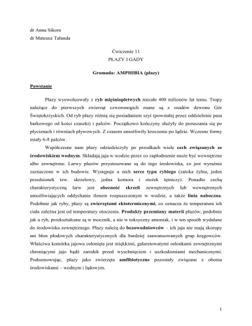 dr Anna Sikora dr Mateusz Tałanda Ćwiczenie 11 PŁAZY I GADY Gromada: AMPHIBIA (płazy) Powstanie Płazy wyewoluowały z ryb mięśniopłetwych niecałe 400 milionów lat temu. Tropy naleŜące do pierwszych zwierząt czworonogich znane są z osadów dewonu Gór Świętokrzyskich. Od ryb płazy róŜnią się posiadaniem szyi (powstałej przez oddzielenie pasa barkowego od kości czaszki) i palców. Początkowo kończyny słuŜyły do poruszania się po płyciznach i równiach pływowych. Z czasem umoŜliwiły kroczenie po lądzie. Wczesne formy miały 6-8 palców. Współczesne nam płazy odziedziczyły po przodkach wiele cech związanych ze środowiskiem wodnym. Składają jaja w wodzie przez co zapłodnienie moŜe być wewnętrzne albo zewnętrzne. Larwy płazów przystosowane są do tego środowiska, co jest wyraźnie zaznaczone w ich budowie. Występuje u nich serce typu rybiego (zatoka Ŝylna, jeden przedsionek tzw. charakterystyczną skrzelowy, jedna larw obecność jest komora i skrzeli stoŜek tętniczy). zewnętrznych lub Ponadto cechą wewnętrznych umoŜliwiających oddychanie tlenem rozpuszczonym w wodzie, a takŜe linia naboczna. Podobnie jak ryby, płazy są zwierzętami ektotermicznymi, co oznacza Ŝe temperatura ich ciała zaleŜna jest od temperatury otoczenia. Produkty przemiany materii płazów, podobnie jak u ryb, przekształcane są w mocznik, a nie w toksyczny amoniak, i w ten sposób wydalane do środowiska zewnętrznego. Płazy naleŜą do bezowodniowców – ich jaja nie mają skorupy ani błon płodowych charakterystycznych dla bardziej zaawansowanych grup kręgowców. Właściwa komórka jajowa osłonięta jest miękkimi, galaretowatymi osłonkami zewnętrznymi chroniącymi jajo bądź zarodek przed wyschnięciem i uszkodzeniami mechanicznymi. Podsumowując, płazy jako zwierzęta amfibiotyczne pozostały związane z oboma środowiskami – wodnym i lądowym. 1 Ewolucja Wyzwania związane z Ŝyciem na lądzie Wyjście kręgowców na ląd wiązało się z koniecznością wielu zmian. Parzyste umięśnione płetwy ryb trzonopłetwych musiały zostać zmodyfikowane w narząd nadający się do wykorzystania w środowisku lądowym. Z tego względu płetwy przodków płazów przekształciły się w cztery kończyny. Zmianie uległ równieŜ kształt ciała na spłaszczony grzbieto-brzusznie. Poruszanie się za pomocą kończyn spowodowało równieŜ zmiany w szkielecie osiowym. Potrzebny stał się solidnie zbudowany szkielet przystosowany do wspierania cięŜaru ciała, a takŜe kończyn z obręczami barkową i biodrową. Kończyny pasa miedniczny stały się bardziej dostosowane do przenoszenia duŜych sił czy gwałtownych napręŜeń niŜ kończyny pasa barkowego, w związku z czym nastąpiła przebudowa napędu i przeniesienie go z przednich kończyn na tylne. Silnie spłaszczona czaszka płazów łączy się z kręgosłupem dwoma kłykciami potylicznymi bez moŜliwości rotacji, tak więc głowa porusza się jedynie w płaszczyźnie pionowej. Ze względu na spędzanie duŜej części Ŝycia w wodzie, ruchy głowy na boki wydawały się być płazom niepotrzebne – powodowałyby utratę stabilności przy pływaniu. Powolne i niezgrabne poruszanie się płazów na lądzie spowodowało zapotrzebowanie na duŜą ilość energii z poŜywienia, a takŜe duŜe ilości tlenu. Ze względu na fakt, iŜ tlen w powietrzu jest łatwiej dostępny od tego rozpuszczonego w wodzie przodkowie płazów, ryby, musiały się odpowiednio do tego przystosować wykształcając płuca. Poza prymitywnymi i workowatymi płucami, dorosłe płazy do oddychania wykorzystują silnie unaczynioną skórę oraz błonę śluzową jamy gębowej i gardzielowej. Płazy nie mają klatki piersiowej i przepony. W procesie wymiany powietrza rolę pompy ssącej i tłoczącej spełnia dno jamy gardzielowo-gębowej, wspomagane przez czynność zastawek i mięśni w nozdrzach oraz gardzieli. Płazy odziedziczyły po rybach oddychających płucami dwa krwioobiegi. Ich obecność umoŜliwiła rozdzielenie krwi natlenionej i odtlenionej. DuŜy obieg rozprowadza z komory przez pień tętniczy natlenioną krew po całym ciele, a następnie odprowadza do serca przez zatokę Ŝylną i prawy przedsionek, skąd kierowana jest małym (płucnym) obiegiem do płuc i skóry, gdzie jest ponownie natleniana. Po natlenieniu krew wraca do serca Ŝyłą jelitową przez lewy przedsionek i wchodzi do krwioobiegu duŜego. Serce płazów ma jedną komorę (która moŜe być częściowo podzielona) i dwa przedsionki. Mieszanie się w sercu krwi natlenowanej z odtlenowaną (Ŝylną) jedynie częściowo ogranicza gąbczasta struktura komory oraz zastawka 2 spiralna w pniu tętniczym. Po wkroczeniu kręgowców na ląd zanikły rybie łuski i wykształciła się skóra z wielokomórkowymi gruczołami. Skóra płazów jest bardzo cienka, przepuszczalna dla wody i powietrza, a takŜe zaopatrzona w znaczną ilość gruczołów śluzowych i jadowych. Jest ona drugim waŜnym narządem wymiany gazowej dorosłych płazów. Pozbawiona jest rogowych wytworów naskórka (łusek, piór czy włosów), charakterystycznych dla innych gromad lądowych kręgowców. Niektóre z dzisiejszych płazów beznogich mają łuski głęboko osadzone w skórze. U niektórych zaś obserwowane są struktury keratynowe np. rogowe pazury u płazów z rodzaju Xenopus. Aby moŜliwa była wymiana gazowa skóra płazów musi pozostać wilgotna, z tego względu są one ograniczone do Ŝycia w środowiskach wilgotnych, w pobliŜu wody. W wyniku zmiany środowiska Ŝycia przekształceniu ulec musiały równieŜ narządy zmysłów, na takie, które mogą funkcjonować w obydwu środowiskach. Ze względu na to, iŜ powietrze jest gorszym przewodnikiem dla fal dźwiękowych niŜ woda, narząd słuchu płazów jest odpowiednio przystosowany. Dźwięk trafia na błonę bębenkową rozpiętą na skórnych kościach dachu czaszki, a następnie za pośrednictwem strzemiącz