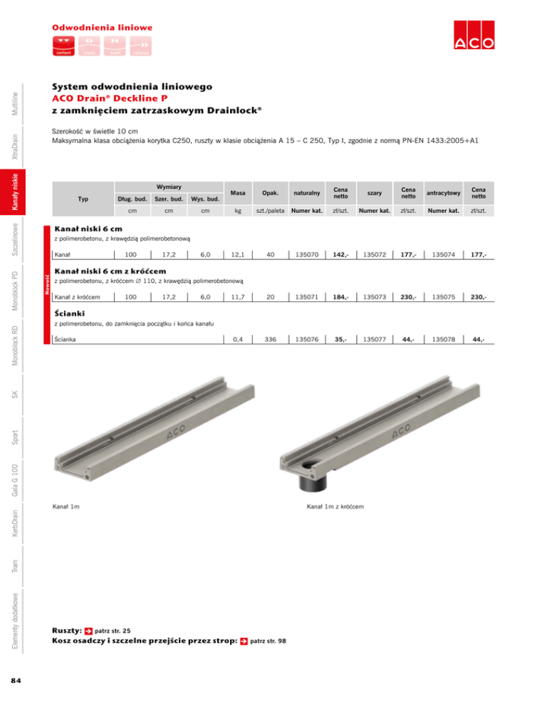 Odwodnienia liniowe Multiline System odwodnienia liniowego ACO Drain® Deckline P z zamknięciem zatrzaskowym Drainlock® Kanały niskie XtraDrain Szerokość w świetle 10 cm Maksymalna klasa obciążenia korytka C250, ruszty w klasie obciążenia A 15 – C 250, Typ I, zgodnie z normą PN-EN 1433:2005+A1 Wymiary Masa Opak. naturalny Cena netto szary Cena netto antracytowy Cena netto cm kg szt./paleta Numer kat. zł/szt. Numer kat. zł/szt. Numer kat. zł/szt. 6,0 12,1 40 135070 142,- 135072 177,- 135074 177,- 11,7 20 135071 184,- 135073 230,- 135075 230,- 0,4 336 135076 35,- 135077 44,- 135078 44,- Dług. bud. Szer. bud. Wys. bud. cm cm Kanał niski 6 cm z polimerobetonu, z krawędzią polimerobetonową Nowość Kanał 100 17,2 Kanał niski 6 cm z króćcem z polimerobetonu, z króćcem ∅ 110, z krawędzią polimerobetonową Kanał z króćcem 100 17,2 6,0 Ścianki z polimerobetonu, do zamknięcia początku i końca kanału Ścianka Kanał 1m Elementy dodatkowe Tram KerbDrain Gala G 100 Sport SK Monoblock RD Monoblock PD Szczelinowe Typ 84 Ruszty: patrz str. 25 Kosz osadczy i szczelne przejście przez strop: patrz str. 98 Kanał 1m z króćcem Odwodnienia liniowe 167 1000 60 Szczelinowe 45 167 1000 60 45 124 100 Monoblock PD 172 172 167 1000 Wymiary kanału ACO Drain® Deckline P 1m 500 60 50 60 50 SK 60 45 124 100 Monoblock RD 124 100 Kanały niskie Szerokość w świetle 10 cm Maksymalna klasa obciążenia korytka C250, ruszty w klasie obciążenia A 15 – C 250, Typ I, zgodnie z normą PN-EN 1433:2005+A1 XtraDrain Multiline System odwodnienia liniowego ACO Drain® Deckline P z zamknięciem zatrzaskowym Drainlock® ∅ 110 1000 60 Sport 500 Gala G 100 85 ∅ 110 KerbDrain 172 85 Tram Wymiary kanału z króćcem ACO Drain® Deckline P 1m Elementy dodatkowe 45 167 172 124 100 85 Odwodnienia liniowe Multiline System odwodnienia liniowego ACO Drain® Deckline S z zamknięciem zatrzaskowym Drainlock® XtraDrain Szerokość w świetle 10 cm Maksymalna klasa obciążenia korytka C250, ruszty w klasie obciążenia A 15 – C 250, zgodnie z normą PN-EN 1433:2005+A1 Kanały niskie Wymiary Typ Dług. bud. Szer. bud. Wys. bud. Masa Opak. cm cm cm kg szt./paleta Numer kat. Cena netto zł/szt. Kanał Szczelinowe ze stali nierdzewnej Kanał 1 m Kanał 0,5 m Nowość Monoblock PD Kanał 1 m z odpływem ∅ 110 na środku kanału 100 13,6 5,4 5,2 48 445544 490,- 50 13,6 5,4 2,5 96 445545 345,- 100 13,6 5,4 5,4 24 445593 865,- Kanał 0,5 m końcowy ze ścianką czołową 50 13,6 5,4 2,6 96 445546 478,- Kanał 0,5 m końcowy ze ścianką czołową i odpływem ∅ 110 na końcu kanału 50 13,6 5,4 3,0 32 445547 697,- 0,5 336 445552 157,- 0,2 336 445553 75,- Stopa łącząca środkowa do łączenia kanałów, ze stali nierdzewnej, z taśmą uszczelniającą Stopa końcowa do mocowania na końcu kanału, ze stali nierdzewnej Stopa końcowa do Deckline S 100 Kanał końcowy 0,5 m, Kanał końcowy 0,5 m Kanał 0,5 m z odpływem ∅ 110 Elementy dodatkowe Tram KerbDrain Gala G 100 Sport SK Monoblock RD Stopa łącząca środkowa do Deckline S 100 86 Kanał 1 m Kanał 1 m, z odpływem ∅ 110 Ruszty: patrz str. 25 Kosz osadczy i szczelne przejście przez strop: patrz str. 98 Stopa łącząca środkowa Stopa końcowa Odwodnienia liniowe Kanały niskie 1000 125,5 97,4 51,5 Szczelinowe 136,5 Monoblock RD 1000 125,5 97,4 136,5 SK 108,5 51,5 21,5 Wymiary kanału ACO Drain® Deckline S 1m Monoblock PD 21,5 Szerokość w świetle 10 cm Maksymalna klasa obciążenia korytka C250, ruszty w klasie obciążenia A 15 – C 250, zgodnie z normą PN-EN 1433:2005+A1 XtraDrain Multiline System odwodnienia liniowego ACO Drain® Deckline S z zamknięciem zatrzaskowym Drainlock® ∅ 110 500 KerbDrain 500 Tram 108,5 136,5 ∅ 110 80 Wymiary kanału ACO Drain® Deckline S 0,5 m z odpływem Elementy dodatkowe 125,5 97,4 51,5 21,5 Wymiary kanału ACO Drain® Deckline S 1 m z odpływem Gala G 100 Sport 500 87 Odwodnienia liniowe Multiline System odwodnienia liniowego ACO Drain® Deckline S z kołnierzem z zamknięciem zatrzaskowym Drainlock® XtraDrain Szerokość w świetle 10 cm Maksymalna klasa obciążenia korytka C250, ruszty w klasie obciążenia A 15 – C 250, zgodnie z normą PN-EN 1433:2005+A1 Kanały niskie Wymiary Typ Szer. bud. Wys. bud. Masa Opak. cm cm cm kg szt./paleta Kanał 1 m Nowość Kanał 0,5 m Cena netto zł/szt. 100 23,0 5,4 7,8 36 445548 711,- 50 23,0 5,4 3,9 72 445549 471,1002,- Kanał 1 m z odpływem ∅ 110 na środku kanału 100 23,0 5,4 8,1 18 445595 Kanał 0,5 m końcowy ze ścianką czołową 50 23,0 5,4 4,1 72 445550 706,- Kanał 0,5 m końcowy ze ścianką czołową i odpływem ∅ 110 na końcu kanału 50 23,0 5,4 4,5 24 445551 924,- 0,5 336 445604 163,- 0,2 336 445553 75,- Stopa łącząca środkowa do łączenia kanałów, ze stali nierdzewnej, z taśmą uszczelniającą Stopa łącząca środkowa do Deckline S 100 z kołnierzem Stopa końcowa do mocowania na końcu kanału, ze stali nierdzewnej Stopa końcowa do Deckline S 100 z kołnierzem Kanał z kołnierzem końcowy 0,5 m, Kanał z kołnierzem z odpływem ∅ 110 końcowy 0,5 m Kanał z kołnierzem 0,5 m Elementy dodatkowe Tram KerbDrain Gala G 100 Sport SK Monoblock RD Numer kat. Kanał z kołnierzem ze stali nierdzewnej Szczelinowe Monoblock PD Dług. bud. 88 Kanał z kołnierzem 1 m Kanał z kołnierzem 1 m, z odpływem ∅ 110 Ruszty: patrz str. 25 Kosz osadczy i szczelne przejście przez strop: patrz str. 98 Stopa łącząca środkowa Stopa końcowa Odwodnienia liniowe 1000 Kanały niskie 125,5 53 21 5 Szerokość w świetle 10 cm Maksymalna klasa obciążenia korytka C250, ruszty w klasie obciążenia A 15 – C 250, zgodnie z normą PN-EN 1433:2005+A1 XtraDrain Multiline System odwodnienia liniowego ACO Drain® Deckline S z kołnierzem z zamknięciem zatrzaskowym Drainlock® 1000 Monoblock RD 108,5 125,5 53 21 4,8 Wymiary kanału z kołnierzem ACO Drain® Deckline S 1m Monoblock PD Szczelinowe 132,5 229,5 132,5 229,5 ∅ 110 500