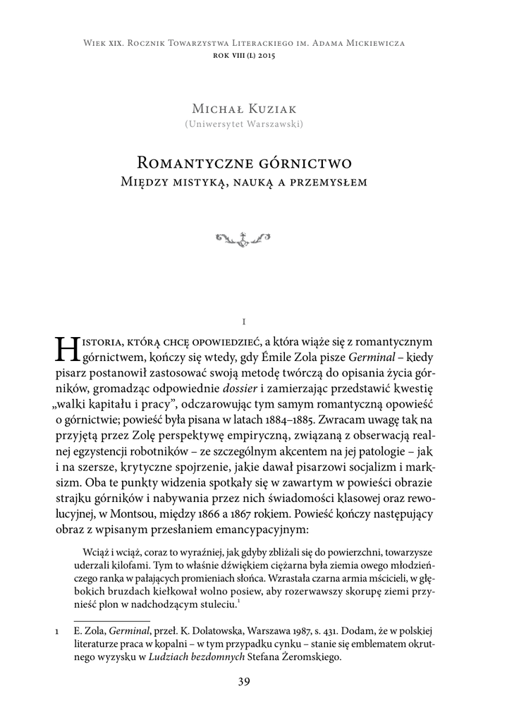 Wiek XIX . Rocznik Towarzystwa Literackiego im. Adama Mickiewicza rok VIii (L) 2015 Michał Kuziak (Uniwersy tet Warszawski) Romantyczne górnictwo Między mistyką, nauką a przemysłem H i istoria, którą chcę opowiedzieć, a która wiąże się z romantycznym górnictwem, kończy się wtedy, gdy Émile Zola pisze Germinal – kiedy pisarz postanowił zastosować swoją metodę twórczą do opisania życia górników, gromadząc odpowiednie dossier i zamierzając przedstawić kwestię „walki kapitału i pracy”, odczarowując tym samym romantyczną opowieść o górnictwie; powieść była pisana w latach 1884–1885. Zwracam uwagę tak na przyjętą przez Zolę perspektywę empiryczną, związaną z obserwacją realnej egzystencji robotników – ze szczególnym akcentem na jej patologie – jak i na szersze, krytyczne spojrzenie, jakie dawał pisarzowi socjalizm i marksizm. Oba te punkty widzenia spotkały się w zawartym w powieści obrazie strajku górników i nabywania przez nich świadomości klasowej oraz rewolucyjnej, w Montsou, między 1866 a 1867 rokiem. Powieść kończy następujący obraz z wpisanym przesłaniem emancypacyjnym: Wciąż i wciąż, coraz to wyraźniej, jak gdyby zbliżali się do powierzchni, towarzysze uderzali kilofami. Tym to właśnie dźwiękiem ciężarna była ziemia owego młodzieńczego ranka w pałających promieniach słońca. Wzrastała czarna armia mścicieli, w głębokich bruzdach kiełkował wolno posiew, aby rozerwawszy skorupę ziemi przynieść plon w nadchodzącym stuleciu.1 1 E. Zola, Germinal, przeł. K. Dolatowska, Warszawa 1987, s. 431. Dodam, że w polskiej literaturze praca w kopalni – w tym przypadku cynku – stanie się emblematem okrutnego wyzysku w Ludziach bezdomnych Stefana Żeromskiego. 39 • Michał Kuziak • Można tu także, w związku ze wspomnianym końcem, przywołać Assuntę Cypriana Norwida, choć to inny typ zakończenia niż to pojawiające się u Zoli, ujawniający nie tylko dokonującą się zmianę w postrzeganiu górnictwa, ale i nostalgię za jego dawnym rozumieniem. Jak odnotowuje Juliusz Wiktor Gomulicki, poeta na kartach autografu umieścił trzy daty, sugerujące czas powstania utworu: 1870 (przekreśloną) oraz 1877 i 1879. Dla podjętego przeze mnie zagadnienia znaczące jest to, że w poemacie pojawia się postać górnika, która zostaje powiązana ze światopoglądem nowoczesnego przyrodoznawstwa i pozbawiona ważnego dla romantyków fragmentu własnej genealogii, jakim był nurt hermetyczny. W usta tej postaci poeta wkłada następujący monolog, z którego przesłaniem często polemizuje w swojej twórczości: Człowieka stworzył „ł a ń c u c h” przyrodzenia – […] – kość jest minerałem, Dośrodkującym wilgoć w swoje rdzenia, Zaś równowaga onych zwie się c i a ł e m. Płynów tam więcej niżeli krzemienia, Skąd trupów lekkość (dodał to z zapałem) Mierzy się według stopni osuszenia, Tak że wielbłąda szkielet gdy skwar pali, Wiatr nim porusza, jakby chciał biec dalej…2 Norwidowy narrator opatruje tę wizję komentarzem/dopowiedzeniem, wskazującym na to, co wykracza poza perspektywę doczesności i perspektywę ewolucjonizmu, niegodzącym się na wizję świata „odczarowanego”. Znamienne ponadto, że scena ta jest poprzedzona obrazem zdewastowanej natury – chodzi o kopalnię jakiegoś kruszcu i nowoczesne przekonanie człowieka o własnej wyższości pozwalającej mu eksploatować bez umiaru bogactwa podziemi. Zaczyna się już opowieść, którą będzie tworzyć następna formacja, choć przecież i wówczas pojawią się teksty w pewien sposób „zaczarowujące” profesję górnika (czy w tym przypadku raczej mineraloga, uczonego, pasjonata, wracającego do przekazu dawnego alchemika piszącego o tytułowej podróży oddającej maksymalizm pragnień poznawczych, będącej empirycznym testowaniem hipotez naukowych i doświadczaniem historii naturalnej), jak to ma miejsce u Jules’a Verne’a w Podróży do wnętrza ziemi3. Eksploracja podziemi łączyła się w XIX wieku z poczuciem przeżywania czegoś niezwykłego, szczególnym natężeniem wyobraźni (np. Juliusz Słowacki pisał o swoim zejściu do kopalni soli: „[…] szliśmy podziemnymi dro2 3 C. Norwid, Assunta, w: tegoż, Pisma wszystkie, pod red. J.W. Gomulickiego, t. 3: Poematy, Warszawa 1971, s. 270. Zob. J. Verne, Podróż do wnętrza Ziemi, przeł. A. Zydorczak, Kraków 2009. 40 • Romantyczne górnictwo • gami niosąc w rękach lampy żelazne. Było w tej podziemnej podróży prawdziwie coś uderzającego imaginacją…”4), uruchomieniem różnych fantazmatów – demonicznych czy seksualnych; myślą o wtajemniczeniu i związanymi z nim rytuałami. Widziano w podziemiach ogrody bądź niebo, doświadczając w ten sposób jedności i harmonii uniwersum5. Łączono w końcu pracę podziemną z etosem wolnościowym – choć, zauważę na marginesie, nazwa karbonariuszy wiąże się z węglem drzewnym6. Ważny, choć przeze mnie tu w zasadzie pominięty, jest wątek historii naturalnej (pojawiający się na przykład w Genezis z Ducha Juliusza Słowackiego), związanej z odkryciami szkieletów zwierząt, myślą ewolucjonistyczną, koncepcjami kosmologicznymi czy teoriami katastrof7. Trudniej wskazać na daty początkowe romantycznej opowieści o górnictwie. Najchętniej przywołałbym tu Henryka von Ofterdingen Novalisa (pisanego przez poetę od 1799 roku do śmierci, a więc w czasie, w którym twórca zajmował się także geologią i górnictwem), choć powieść ta odsyła przecież ku jeszcze dawniejszym tendencjom, związanym z myślą hermetyczną; trzeba tu także choćby wspomnieć o Gotthilfie Heinrichu Schubercie, Wilhelmie Humboldcie czy Johannie Wolfgangu Goethem, również o E.T.A. Hoffmannie, Ludwigu Tiecku, twórcach, podobnie jak Novalis, łączących naukową pasję geologiczną z poetycką wizją natury8. Zatrzymam się na chwilę przy wspomnianej powieś