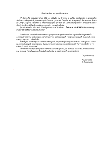Spotkania z geografią świata W dniu 23 października 2014r. odbyło się trzecie z cyklu spotkanie z geografią świata, którego inicjatorem było Stowarzyszenie Przyjaciół Integracji „Równamy Szanse” przy Zespole Szkół nr 5. Prowadzącym był pan dr Dariusz Brykała – pracownik Polskiej Akademii Nauk, rodzic uczennicy naszej szkoły. Spotkanie dla klas 4-6 SP odbyło się pod hasłem: „Świat w skali MEGA - rekordy budowli człowieka na Ziemi”. Uczniowie z zaciekawieniem i czynnym zaangażowaniem wysłuchali opowieści i obejrzeli zdjęcia dotyczące największych, najwyższych i najciekawszych budowli stworzonych przez człowieka. Miło było pomarzyć o dalekich krajach, wspaniałych wyprawach i choć przez chwilę poczuć się jak podróżnicy. Życzymy wszystkim uczestnikom siły i wytrwałości w realizacji swoich marzeń. Serdecznie dziękujemy panu Dariuszowi Brykale, za bardzo ciekawe przedstawienie tematu i zachęcenie dzieci do udziału w następnych spotkaniach. Organizatorzy M. Kijewska A. Drozdecka .