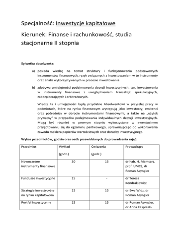 Specjalność: Inwestycje kapitałowe Kierunek: Finanse i rachunkowość, studia stacjonarne II stopnia Sylwetka absolwenta: a) posiada wiedzę na temat struktury i funkcjonowania podstawowych instrumentów finansowych, ryzyk związanych z inwestowaniem w te instrumenty oraz analiz wykorzystywanych w procesie inwestowania b) zdobywa umiejętności podejmowania decyzji inwestycyjnych, tzn. inwestowania w instrumenty finansowe z uwzględnieniem transakcji: spekulacyjnych, zabezpieczających i arbitrażowych. Wiedza ta i umiejętności będą przydatne Absolwentowi w przyszłej pracy w podmiotach, które na rynku finansowym występują jako inwestorzy, emitenci oraz pośrednicy w obrocie instrumentami finansowymi, a także na „użytek prywatny” w przypadku podejmowania indywidualnych decyzji inwestycyjnych. Mogą być również w pewnym stopniu wykorzystane w ewentualnym przygotowaniu się do egzaminu pańtwowego, uprawniającego do wykonywania zawodu maklera papierów wartościowych oraz doradcy inwestycyjnego. Wykaz przedmiotów, godzin oraz osób przewidzianych do prowadzenia zajęć: Przedmiot Wykład Ćwiczenia (godz.) (godz.) Prowadzący Nowoczesne instrumenty finansowe 30 15 dr hab. H. Mamcarz, prof. UMCS, dr Roman Asyngier Fundusze inwestycyjne 15 - Strategie inwestycyjne na rynku kapitałowym 15 15 dr Ewa Widz, dr Roman Asyngier Portfel inwestycyjny 15 15 dr Roman Asyngier, dr Anna Kasprzak- dr Teresa Kondrakiewicz Czelej Analiza techniczna 15 15 dr Roman Asyngier Behawioralna inżynieria finansowa 15 15 dr Mariusz Kicia Treści programowe: Nowoczesne instrumenty finansowe: Oszczędności i ich struktura. Determinanty inwestycji: stopa zwrotu, ryzyko, płynność, koszty transakcji. Instrumenty finansowe jako przedmiot inwestycji. Tradycyjne i nowoczesne instrumenty finansowe. Produkty strukturyzowane: klasyczne i nowoczesne. Opcje i ich rodzaje. Obligacje z komponentami opcji. Obligacje zamienne. Odwrotne obligacje zamienne. Obligacje z opcją wypowiedzenia. Obligacje z opcją Cap i Floor. Obligacje katastrofalne. Obligacje śmierci. Warranty. Warranty opcyjnie. Warranty subskrypcyjne (nagie, pokryte). Obligacje z warrantem. Swapy finansowe: swapy bazujące na aktywach, swapy bazujące na pasywach, swapy procentowe, swapy walutowe, swapy krzyżowe. Innowacje finansowe na rynku swapów. Swapy terminowe. Swapy opcyjne. Swapy kredytowe. Lokaty Strukturyzowane. Strukturyzowane certyfikaty depozytowe. Spreadtraiding. ETF-y (Exchange Traded Funds). Fundusze luxemburskie. Fundusze sekurytyzacyjne. Zarządzanie majątkiem (Wealth management). Fundusze inwestycyjne: Fundusze inwestycyjne jako inwestorzy instytucjonalni na rynku kapitałowym – istota i zasady działania. Organy funduszy i podmioty obsługujące fundusze inwestycyjne – towarzystwa funduszy inwestycyjnych, depozytariusze, agenci transferowi, dystrybutorzy jednostek uczestnictwa, rola KNF na rynku funduszy inwestycyjnych. Klasyfikacje funduszy inwestycyjnych. Rodzaje funduszy ze względu na strategie inwestycyjne. Fundusze otwarte i zamknięte. Fundusze funduszy i fundusze parasolowe. Fundusze uniwersalne i specjalistyczne. Strategie inwestycyjne funduszy. Czynniki wyboru funduszu i ryzyko inwestowania w fundusze. Zasady nabywania i umarzania jednostek uczestnictwa funduszy, koszty i wartość inwestycji. Zalety i wady inwestowania za pośrednictwem funduszy. Rozwój polskiego i światowego rynku funduszy inwestycyjnych – aktualny stan i struktura rynku, kierunki i perspektywy rozwoju. Strategie inwestycyjne na rynku kapitałowym: Inwestowanie krótkoterminowe: Scalping, Day-trading, Techniki wykorzystywane przez inwestorów jednosesyjnych – oscylatory, kanały trendowe, linie trendu, Swing- trading, Inwestowanie pozycyjne, Techniki otwarcia i zamknięcia pozycji, ucinanie strat; Strategie długookresowe: Strategie pasywne na akcjach i obligacjach (buy & hold, replikacja, indeksowanie), Strategie aktywne i pasywne, Strategie obligacyjne (strategie krzywej dochodowości, strategie „rajdowania po krzywej”, strategie rozpiętości stóp zwrotu, strategia immunizacji portfela obligacji), Strategie akcyjne, metody i techniki inwestycyjne, strategie cenowe, Strategia contrarian a strategia momentum, Wykorzystanie analizy fundamentalnej do tworzenia strategii (strategie oparte na wskaźnikach rynkowych akcji, system Warrena Buffeta, CANSLIM, strategia Grahama, strategia Piotroskiego), Strategie dywidendowe (strategia „psów”, „small dogs, „czwórka dyletanta”), Metody i techniki oparte na analizie technicznej (analiza trendu, formacje cenowe, teorie analizy technicznej, wykorzystanie oscylatorów, liczby Fibbonacciego), Strategie techniczne (strategia 1-2-3, reguła Donchiana, trend following, strategie V. Sperandeo, system żółwi), Budowa systemów transakcyjnych, Strategie otwarcia i zamknięcia pozycji w inwestowaniu, Tworzenie portfela inwestycyjnego, Dywersyfikacja ryzyka, Optymalizacja portfela, Wykorzystanie instrumentów pochodnych w tworzeniu strategii (hedging, arbitraz spekulacja). Portfel inwestycyjny: Wprowadzenie do teorii portfela, analiza dochodowości i ryzyka instrumentów finansowych, szacowanie stopy wolnej od ryzyka, terminowa struktura stóp procentowych, wycena akcji metodą DCF i porównań rynkowych, mapa dochodowości i ryzyka, konstrukcja i zarządzanie portfelem akcji i obligacji, portfele mieszane, wykorzystanie SML i CAPM do zarządzania portfelem, przesłanki i zasady dywersyfikacji portfela, analiza i mierniki efektywności portfela (miara Jensena, miara Sharpe'a, miara Treynora, Tracking Error, Appraisal Ratio) Analiza techniczna: rodzaje analizy papierów wartościowych, analiza fundamentalna i analiza techniczna papierów wartościowych, założenia analizy technicznej, analiza wykresów (trendy, formacje zwrotne i kontynuacji trendu), wskaźniki techniczne, teoria Dowa, teoria Elliotta, teoria Fishera, Kalendarz spiralny Carolana, ocena przydatności analizy technicznej 
