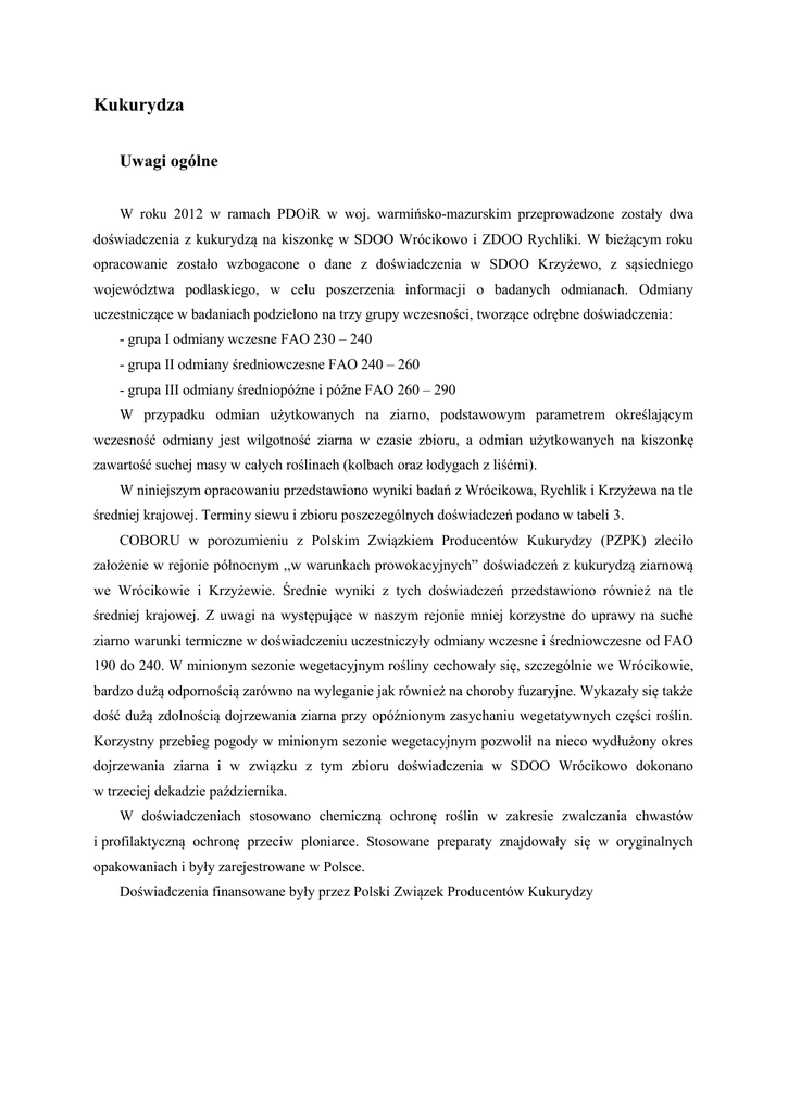 Kukurydza Uwagi ogólne W roku 2012 w ramach PDOiR w woj. warmińsko-mazurskim przeprowadzone zostały dwa doświadczenia z kukurydzą na kiszonkę w SDOO Wrócikowo i ZDOO Rychliki. W bieżącym roku opracowanie zostało wzbogacone o dane z doświadczenia w SDOO Krzyżewo, z sąsiedniego województwa podlaskiego, w celu poszerzenia informacji o badanych odmianach. Odmiany uczestniczące w badaniach podzielono na trzy grupy wczesności, tworzące odrębne doświadczenia: - grupa I odmiany wczesne FAO 230 – 240 - grupa II odmiany średniowczesne FAO 240 – 260 - grupa III odmiany średniopóźne i późne FAO 260 – 290 W przypadku odmian użytkowanych na ziarno, podstawowym parametrem określającym wczesność odmiany jest wilgotność ziarna w czasie zbioru, a odmian użytkowanych na kiszonkę zawartość suchej masy w całych roślinach (kolbach oraz łodygach z liśćmi). W niniejszym opracowaniu przedstawiono wyniki badań z Wrócikowa, Rychlik i Krzyżewa na tle średniej krajowej. Terminy siewu i zbioru poszczególnych doświadczeń podano w tabeli 3. COBORU w porozumieniu z Polskim Związkiem Producentów Kukurydzy (PZPK) zleciło założenie w rejonie północnym ,,w warunkach prowokacyjnych” doświadczeń z kukurydzą ziarnową we Wrócikowie i Krzyżewie. Średnie wyniki z tych doświadczeń przedstawiono również na tle średniej krajowej. Z uwagi na występujące w naszym rejonie mniej korzystne do uprawy na suche ziarno warunki termiczne w doświadczeniu uczestniczyły odmiany wczesne i średniowczesne od FAO 190 do 240. W minionym sezonie wegetacyjnym rośliny cechowały się, szczególnie we Wrócikowie, bardzo dużą odpornością zarówno na wyleganie jak również na choroby fuzaryjne. Wykazały się także dość dużą zdolnością dojrzewania ziarna przy opóźnionym zasychaniu wegetatywnych części roślin. Korzystny przebieg pogody w minionym sezonie wegetacyjnym pozwolił na nieco wydłużony okres dojrzewania ziarna i w związku z tym zbioru doświadczenia w SDOO Wrócikowo dokonano w trzeciej dekadzie października. W doświadczeniach stosowano chemiczną ochronę roślin w zakresie zwalczania chwastów i profilaktyczną ochronę przeciw ploniarce. Stosowane preparaty znajdowały się w oryginalnych opakowaniach i były zarejestrowane w Polsce. Doświadczenia finansowane były przez Polski Związek Producentów Kukurydzy Tabela 1. Lp. Odmiana Rok wpisania do Krajowego Rejestru Odmian w Polsce Kod kraju pochodzenia Kukurydza na kiszonkę. Odmiany badane. Rok zbioru: 2012 Hodowca (jednostka prowadząca hodowlę zachowawczą lub dla odmian zagranicznych krajowy przedstawiciel) 1. 2. 3. 4. 5. 6. 7. Amadeo ES Palazzo Ricardinio Ambrosini ES Zizou Konsulixx LG30240 2007 2009 2010 2011 2011 2012 2012 DE FR DE DE FR FR FR KWS Polska sp. z o.o. ul. Chlebowa 4/8 PL - 61-003 Poznań Euralis Saaten sp. z o.o. ul. Wiece 12 PL – 60-638 Poznań KWS Polska sp. z o.o. ul. Chlebowa 4/8 PL - 61-003 Poznań KWS Polska sp. z o.o. ul. Chlebowa 4/8 PL - 61-003 Poznań Euralis Saaten sp. z o.o. ul. Wiece 12 PL – 60-638 Poznań RAGT Semences Polska sp. z o.o. ul. Sadowa 10A PL – 87-148 Łysomice 8. 9. 10. 11. 12. 13. 14. 15. 16. 17. Touran Cassilas Geoxx Sumas ES Albatros Grosso MAS 27L P8488 Santurio 2008 2011 2011 2011 2012 2009 2012 2011 2012 DE DE FR DE FR FR FR DE DE KWS Polska sp. z o.o. ul. Chlebowa 4/8 PL - 61-003 Poznań KWS Polska sp. z o.o. ul. Chlebowa 4/8 PL - 61-003 Poznań RAGT Semences Polska sp. z o.o. ul. Sadowa 10A PL – 87-148 Łysomice Saaten-Union Polska sp. z o.o. ul. Straszewska 70 PL – 62-100 Wągrowiec Euralis Saaten sp. z o.o. ul. Wiece 12 PL – 60-638 Poznań KWS Polska sp. z o.o. ul. Chlebowa 4/8 PL - 61-003 Poznań Maisadour Polska sp. z o.o. ul. Pokrzywno 3a PL - 61-315 Poznań Pioneer Hi-Bred Northern Europe Sales Division GmbH Oddział w Polsce Aleje Solidarności 46 PL-61-696 Poznań KWS Polska sp. z o.o. ul. Chlebowa 4/8 PL - 61-003 Poznań - 2008 2008 2012 2012 - FR DE FR PL Maisadour Polska sp. z o.o. ul. Pokrzywno 3a PL - 61-315 Poznań Saaten-Union Polska sp. z o.o. ul. Straszewska 70 PL – 62-100 Wągrowiec Euralis Saaten sp. z o.o. ul. Wiece 12 PL – 60-638 Poznań ”Hodowla Roślin Smolice sp. z o.o. Grupa IHAR” Smolice 146 PL – 63-740 Kobylin - ES Archimedes CCA Limagrain Central Europe Societe Europeenne Spółka Europejska Oddział w Polsce ul. Ks. Piotra Wawrzyniaka 2 PL 62-052 Komorniki 18. 19. 20. 21. 22. 23. 24. MAS 24A Subito ES Fireball Kadryl PR39T83 CCA Sumaris CCA Susann CCA Tabela 2. Kod kraju pochodzenia Kukurydza na ziarno. Odmiany badane. Rok zbioru:2012 Rok wpisania do Krajowego Lp. Odmiana Rejestru Odmian w Polsce Hodowca (jednostka prowadząca hodowlę zachowawczą lub dla odmian zagranicznych krajowy przedstawiciel) 1. NK Ravello 2008 FR Syngenta Seeds sp. z o.o. ul. Powązkowska 44C PL-01-797 Warszawa 2. ES Palazzo 2009 FR Euralis Saaten sp. z o.o. Oddział w Polsce ul. Wiece 12 PL-60-638 Poznań 3. Inoxx 2009 FR RAGT Semences Polska sp. z o.o. ul. Sadowa 10A PL-87-148 Łysomice 4. Ricardinio 2010 DE KWS Polska sp. z o.o. ul. Chlebowa 4/8 PL-61-003 Poznań 5. Ambrosini 2011 DE KWS Polska sp. z o.o. ul. Chlebowa 4/8 PL-61-003 Poznań 6. ES Zizou 2011 FR Euralis Saaten sp. z o.o. Oddział w Polsce ul. Wiece 12 PL-60-638 Poznań 7. SY Cooky 2011 FR Syngenta Seeds sp. z o.o. ul. Powązkowska 44C PL-01-797 Warszawa 8. ES Cirrius 2012 FR Euralis Saaten sp. z o.o. Oddział w Polsce ul. Wiece 12 PL-60-638 Poznań 9. Konsulixx 2012 FR RAGT Semences Polska sp. z o.o. ul. Sadowa 10A PL-87-148 Łysomice 10. Laurinio 2012 DE KWS Polska sp. z o.o. ul. Chlebowa 4/8 PL-61-003 Poznań 11. Silvinio 2012 DE KWS Polska sp. z o.o. ul. Chlebowa 4/8 PL-61-003 Poznań 12. NK Falkone CCA 13. P8100 CCA 14. Saludo CCA Tabela 3. Kukurydza. Warunki polowe doświadczeń. Rok zbioru: 2012 SDOO Wrócikowo ZDOO Rychliki SDOO Krzyżewo woj. warmińsko-mazurskie woj. warmińsko-mazurskie woj. podlaskie żytni dobry żytni słaby zbo