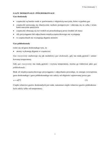 F-Gaz doskonaly/ 1 GAZY DOSKONAŁE i PÓŁDOSKONAŁE Gaz doskonały cząsteczki są bardzo małe w porównaniu z objętością naczynia, które wypełnia gaz cząsteczki poruszają się chaotycznie ruchem postępowym i zderzają się ze sobą i ściankami naczynia sprężyście cząsteczki obracają się też wokół osi przechodzącej przez środek ich masy siły przyciągania lub odpychania międzycząsteczkowego nie występują w cząsteczkach nie występują drgania atomów Gaz półdoskonały rożni się od gazu doskonałego tym, że atomy wykonują drgania w cząsteczce Gaz rzeczywisty zachowuje się jak modelowy gaz doskonały, gdy ma małą gęstość i umiarkowaną temperaturę. Gdy gaz rzeczywisty ma małą gęstość i wyższą temperaturę, można go traktować jako gaz półdoskonały. Brak sił międzycząsteczkowego przyciągania i odpychania powoduje, że energia wewnętrzna gazu doskonałego i gazu półdoskonałego nie zależy od objętości zajmowanej przez gaz. u uT (1) Ciepło właściwe gazów doskonałych jest stałe, natomiast ciepło właściwe gazów połdoskonałych zależy tylko od temperatury. 1 F-Gaz doskonaly/ 2 Doświadczenie Gay-Lussaca i Jule’a Analizę przeprowadzamy dla dwóch stanów gazu. W stanie pierwszym gaz wypełnia tylko zbiornik nr I, w stanie drugim gaz jest w zbiornikach nr I i nr II. Po połączeniu zbiorników stwierdzono, że temperatura wody, w której zanurzone są zbiorniki, nie uległa zmianie. Oznacza to, że woda ani nie pochłonęła, ani nie oddała ciepła. Jej energia się nie zmieniła. Także energia gazu nie uległa zmianie, gdyż gaz nie wymienił energii z wodą. Wniosek: energia wewnętrzna gazu nie zależy od jego objętości, jej jedyną miarą jest temperatura. V1 VI V2 VI VII t2 t1 Ed E w 0 U 2 U1 U 0 V T Zasada ekwipartycji (równego podziału) energii Molowe ciepło właściwe gazów doskonałych zależy tylko od liczby atomów w cząsteczce gazu Mcv 1 f MR 2 J kmol K (2a) gdzie: 2 F-Gaz doskonaly/ 3 (MR) = 8314 [J/(kmol·K)] jest uniwersalną stałą gazową jednakową dla wszystkich gazów, f jest liczbą stopni swobody cząsteczek gazu związanych z gromadzeniem energii. f 3 gazy jednoatomowe f 5 gazy dwuatomowe f 6 gazy trójatomowe i o większej liczbie atomów w cząsteczce Kilogramowe ciepło właściwe zależy też od rodzaju gazu. Po podzieleniu równania (2a) przez masę molową M [kg/kmol] otrzymujemy cv J 1 f R 2 kg K (2b) gdzie R jest indywidualną stałą gazową, różną dla rożnych gazów. Ciepło właściwe gazów półdoskonałych zależy także od temperatury Mcv 1 f MR Mcosc T 2 Mc M c c Mc M J kmol K (3) J kg K (4) Temperatura jest miarą średniej energii kinetycznej ruchu postępowego cząsteczek. Podczas ogrzewania gazu jednoatomowego, całe ciepło powiększa energię ruchu postępowego cząste3 F-Gaz doskonaly/ 4 czek, powodując wzrost temperatury. W przypadku gazu o cząsteczkach wieloatomowych, tylko część doprowadzanego ciepła powiększa energię kinetyczną ruchu postępowego. Reszta doprowadzanego ciepła zwiększa energię ruchu obrotowego wokół środków mas cząsteczek, co nie jest odzwierciedlane przyrostem temperatury. Termiczne równanie stanu gazów doskonałych i półdoskonałych Prawo Gay-Lussaca Dla przemiany zamkniętej m idem przy p idem zachodzi związek v1 v2 T1 T2 (1) Prawo Boyle’a i Mariotte’a Dla przemiany zamkniętej m idem przy T idem prawdziwa jest zależność p1v1 p2v2 (2) 4 F-Gaz doskonaly/ 5 1 – 3 izobara; p = idem 3 – 2 izoterma; T = idem Niech w gazie zajdzie jakaś przemiana termodynamiczna 1-2. Na wykresie p-v ilustrującym tę przemianę z punktu 1 prowadzimy linię przemiany izobarycznej, a z punktu 2 linię przemiany izotermicznej. Linie te przecinają się w jakimś punkcie 3. Stan 2 można więc też osiągnąć realizując kolejno przemianę izobaryczną 1-3 oraz izotermiczną 3-2. Dla przemiany izobarycznej 1-3 zgodnie z równaniem (1) jest v1 v3 T1 T3 (3) Natomiast dla przemiany izotermicznej 3-2 zachodzi p3v3 p2v2 (4) Z równania (3) wyznaczamy v3 v3 v1 T3 T1 (5) a otrzymaną zależność (5) podstawiamy do równania (4) p3v1 T3 p2v2 T1 (6) Dla przemiany izobarycznej 1-3 jest p3 p1 (7) 5 F-Gaz doskonaly/ 6 a dla przemiany izotermicznej 3-2 mamy T3 T 2 (8) Po wprowadzeniu zależności (7) i (8) do równania (6) i podzieleniu otrzymanego wyniku stronami przez T2 dostajemy p1v1 p2v2 T1 T2 (9) Dla określonego gazu doskonałego lub półdoskonałego wyrażenie pv ma więc wartość stałą, T niezależnie od jego stanu. Wniosek ten można zapisać następująco pv R T (10) J gdzie R jest indywidualną stałą gazową. Jej wartość zależy od rodzaju gazu. Najczę kg K ściej równanie (10) podaje się w formie pv RT (11) i nazywa się je termicznym równaniem stanu. Pomnożymy równanie (11) stronami przez ilość substancji m pvm RTm (12) ale vm V (13) stąd po uporządkowaniu pV mRT (14) Pomnożymy teraz prawą stronę równania przez M otrzymując M m MRT M (15) pV n(MR)T (16) pV i dalej 6 F-Gaz doskonaly/ 7 W równaniu (16) (MR) jest uniwersalną stałą gazową. Jej wartość wynosi MR 8314,29 J kmol K (17) i jest jednakowa dla wszystkich gazów doskonałych i półdoskonałych. Dowód Niech dla dwóch dowolnych gazów będzie p1 p2 V1 V2 (18) T1 T2 wówczas z prawa Avogadra wynika, że n1 n2 (19) Napiszmy termiczne równania stanu dla rozważanego przypadku. Dla gazu pierwszego p1V1 n1 (M1R1 )T1 (20) i dla gazu drugiego p2V2 n2 (M 2 R2 )T2 (21) Dzielimy teraz równanie (20) przez (21) dostając 1 ( M 1R1 ) ( M 2 R2 ) (22) i dalej (M1R1 ) (M 2 R2 ) (MR) const (23) Robert Boyle 1627-1691 chemik angielsko-irlandzki Edme Mariotte 1620-1684 fizyk francuski Joseph Louis Gay-Lussac 1778-1850 chemik i fizyk francuski 7