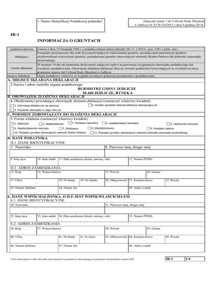 1. Numer Identyfikacji Podatkowej podatnika1 Załącznik numer 1 do Uchwały Rady Miejskiej w Jedliczu Nr XVII/124/2015 z dnia 9 grudnia 2015r. IR-1 INFORMACJA O GRUNTACH podstawa prawna składajacy: termin składania miejsce składania Ustawa z dnia 15 listopada 1984 r. o podatku rolnym (tekst jednolity Dz. U. z 2013r., poz. 1381 z późn. zm.) Formularz przeznaczony dla osób fizycznych będących właścicielami gruntów, posiadaczami samoistnymi gruntów, użytkownikami wieczystymi gruntów, posiadaczami gruntów stanowiących własność Skarbu Państwa lub jednostki samorządu terytorialnego W terminie 14 dni od zaistnienia okoliczności mających wpływ na powstanie (wygaśnięcie) obowiązku podatkowego lub wysokość opodatkowania. Obowiązek składania deklaracji dotyczy również podmiotów korzystających ze zwolnień na mocy przepisów ustawy lub Uchwał Rady Miejskiej w Jedliczu Organ podatkowy właściwy ze względu na miejsce położenia przedmiotów opodatkowania A. MIEJSCE SKŁADANA DEKLARACJI 3.Nazwa i adres siedziby organu podatkowego BURMISTRZ GMINY JEDLICZE 38-460 JEDLICZE, RYNEK 6 B. OBOWIĄZEK ZŁOŻENIA DEKLARACJI 4. Okoliczności powodujące obowiązek złożenia deklaracji (zaznaczyć właściwy kwadrat) 2. Korekta uprzednio złożonej deklaracji obowiązująca od 1. Informacja składana po raz pierwszy 3. Powstanie obowiązku w ciągu roku od C. PODMIOT ZOBOWIĄZANY DO ZŁOŻENIA DEKLARACJI 5. Forma władania (zaznaczyć właściwy kwadrat) 1. Właściciel 2. Współwłaściciel 6. Współużytkownik wieczysty 3. Posiadacz samoistny 5. Użytkownik wieczysty 8. Współdzierżawca 7. Dzierżawca 10. Posiadacz gruntów stanowiących własność Skarbu Państwa 9. Posiadacz zależny 11. Posiadacz gruntów stanowiących własność jednostki samorządu terytorialnego D. DANE PODATNIKA D.1. DANE IDENTYFIKACYJNE 7. Nazwisko 9. Imię ojca 4. współposiadacz samoistny 8. Pierwsze imię, drugie imię 10. Imie matki 11. Data urodzenia (dzień, miesiąc, rok) 12. Numer PESEL D.2. ADRES ZAMIESZKANIA 13. Kraj 14. Województwo 17. Ulica 18. Nr domu 23. Numer telefonu 24. Numer fax 15. Powiat 19. Nr lokalu 16. Gmina 20. Miejscowość 21. Kod pocztowy 22. Poczta 29. Adres e-mail E. DANE WSPÓŁMAŁŻONKA, O ILE JEST WSPÓŁWŁAŚCICIELEM E.1. DANE IDENTYFIKACYJNE 31. Pierwsze imię, drugie imię 30. Nazwisko 32. Imię ojca 33. Imie matki 34. Data urodzenia (dzień, miesiąc, rok) 35. Numer PESEL E.2. ADRES ZAMIESZKANIA 36. Kraj 37. Województwo 40. Ulica 41. Nr domu 46. Numer telefonu 47. Numer fax 38. Powiat 42. Nr lokalu 39. Gmina 43. Miejscowość 44. Kod pocztowy 45. Poczta 48. Adres e-mail 1 Pole obowiązkowe tylko dla osób zobowiązanych na podstawie obowiązujących przepisów do posiadania numeru NIP IR-1 1/4 F. INFORMACJA O WSPÓŁWŁAŚCICIELACH/ WSPÓŁPOSIADACZACH (należy podać dane każdego ze współwłaścicieli/ współposiadaczy, takie jak wskazane w pozycji D punkty od 7 do 33 oraz przysługujacy im udział) G. DANE DOTYCZĄCE PRZEDMIOTÓW OPODATKOWANIA GRUNTY NIESTANOWIĄCE GOSPODARSTWA ROLNEGO GRUNTY STANOWIĄCE GOSPODARSTWO ROLNE G.1. GRUNTY ORNE Klasa użytków rolnych I II IIIa IIIb IVa IVb V VI IIIb IVa IVb V VI IVa IVb V VI IVa IVb V VI Powierzchnia w hektarach fizycznych G.2. GRUNTY ROLNE ZABUDOWANE- GRUNTY ORNE Klasa użytków rolnych I II IIIa Powierzchnia w hektarach fizycznych G.3. GRUNTY ZADRZEWIONE I ZAKRZEWIONE NA GRUNTACH ORNYCH Klasa użytków rolnych I II IIIa IIIb Powierzchnia w hektarach fizycznych G.4. GRUNTY POD STAWAMI NIEZARYBIONYMI- GRUNTY ORNE Klasa użytków rolnych I II IIIa IIIb Powierzchnia w hektarach fizycznych G.5. ROWY NA GRUNTACH ORNYCH Klasa użytków rolnych I II IIIa IIIb IVa IVb V VI I II III/ IIIa IIIb IV/ IVa IVb V VI I II III IV V III IV V G.9. GRUNTY ZADRZEWIONE I ZAKRZEWIONE NA ŁĄKACH I PASTWISKACH Klasa użytków rolnych IV I II III V Powierzchnia w hektarach fizycznych G.6. SADY Klasa użytków rolnych Powierzchnia w hektarach fizycznych G.7. ŁĄKI I PASTWISKA Klasa użytków rolnych Powierzchnia w hektarach fizycznych G.8. GRUNTY ROLNE ZABUDOWNE- ŁĄKI I PASTWISKA Klasa użytków rolnych I II Powierzchnia w hektarach fizycznych Powierzchnia w hektarach fizycznych G.10. GRUNTY POD STAWAMI NIEZARYBIONYMI- ŁĄKI I PASTWISKA Klasa użytków rolnych I II III V IV Powierzchnia w hektarach fizycznych IR-1 2/4 G.11. ROWY NA ŁĄKACH I PASTWISKACH Klasa użytków rolnych I III II V IV Powierzchnia w hektarach fizycznych G.12. INNE GRUNTY, DLA KTÓRYCH NIE MOŻNA USTALIĆ PRZELICZNIKA RODZAJ UŻYTKU POWIERZCHNIA W HEKTARACH FIZYCZNYCH G.13. GRUNTY POD STAWAMI ZARYBIONYMI- ŁOSOSIEM, TROCIĄ, GŁOWACICĄ, PALIĄ I PSTRĄGIEM POWIERZCHNIA W HEKTARACH FIZYCZNYCH G.14. GRUNTY POD STAWAMI ZARYBIONYMI- INNE GATUNKI RYB POWIERZCHNIA W HEKTARACH FIZYCZNYCH H. ŁĄCZNA POWIERZCHNIA UŻYTKÓW ROLNYCH 1. Powierzchnia w hektarach fizycznych 2. Grunty stanowiące użytki rolne położone na terenie innych Gmin Położenie gruntów (wskazanie właściwej Gminy) Powierzchnia w hektarach fizycznych Powierzchnia w hektarach przeliczeniowych I. DANE DOTYCZĄCE UZYTKÓW ROLNYCH PODLEGAJĄCYCH OPODATKOWANIU LUB ZWOLNIENIU I.1. POŁOŻENIE NIERUCHOMOŚCI I IDENTYFIKATORY GEODEZYJNE DZIAŁEK MIEJSCOWOŚĆ: I.2. KSIĘGA WIECZYSTA NR DZIAŁKI/DZIAŁEK: 56. Numer ksiegi wieczystej ( zbioru dokumentów) NR GEODEZYJNY: 57. Nazwa sądu J. DANE DOTYCZĄCE OBJĘCIA OBOWIĄZKIEM PODATKOWYM NA PODSTAWIE ART.6C USTAWY O PODATKU ROLNYM PODATEK OD NIERUCHOMOŚCI PODATEK LEŚNY K. DANE DOTYCZĄCE ZWOLNIEŃ PODATKOWYCH WYNIKAJĄCYCH Z USTAWY LUB UCHWAŁ RADY MIEJSKIEJ W JEDLICZU Tytuł prawny zwolnienia (należy wskazać podstawę prawnąobowiązujący przepis prawa) Podstawa zwolnienia (powierzchnia w hektarach fizycznych) I. ZWOLNIENIA USTAWOWE: Art.12 ust.1 pkt 1 - grunty zadrzewione i zakrzewione ustanowione na użytkach rolnych Art.12 ust.1 pkt 1 - użytki rolne klasy V, VI i VIz II. ZWOLNIENIA WPROWADZONE UCHWAŁĄ RADY MIEJSKIEJ Uchwała Rady 