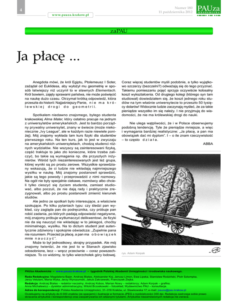 Numer 180 11 października 2012 4 www.pauza.krakow.pl zaPAU Ja płacę ... Anegdota mówi, że król Egiptu, Ptolemeusz I Soter, zażądał od Euklidesa, aby wyłożył mu geometrię w sposób łatwiejszy niż uczynił to w sławnych Elementach. Król bowiem, zajęty sprawami państwa, nie może poświęcić na naukę dużo czasu. Otrzymał krótką odpowiedź, która przeszła do historii: Najjaśniejszy Panie, n i e m a k r ó l e w s k i e j d r o g i d o g e o m e t r i i. Spotkałem niedawno znajomego, byłego studenta krakowskiej Alma Mater, który ostatnio pracuje na jednym z uniwersytetów amerykańskich. Jest to bardzo porządny prywatny uniwersytet, znany w świecie (może niekoniecznie „Ivy League”, ale w każdym razie niewiele poni żej). Mój znajomy wykłada tam kurs fizyki dla studentów pierwszego roku. Na ten kurs, jak to jest w zwyczaju na amerykańskich uniwersytetach, chodzą studenci różnych wydziałów. Nie wszyscy są zainteresowani fizyką, część traktuje to jako zło konieczne, które trzeba zaliczyć, bo takie są wymagania np. dla przyszłych inżynierów. Wśród tych niezainteresowanych jest też grupa, której wyniki są po prostu zerowe. Wszystkie sprawdziany wskazują, że ci ludzie nie wkładają najmniejszego wysiłku w naukę. Mój znajomy postanowił sprawdzić, jakie są tego powody i przeprowadzić z nimi rozmowy. Na ogół nie były specjalnie ciekawe, rozmówcy albo chcieli tylko cieszyć się życiem studenta, zamiast studiować, albo poczuli, że nie dają rady i praktycznie zrezygnowali, albo po prostu postanowili zmienić kierunek studiów. Ale jedno ze spotkań było interesujące, a właściwie szokujące. Po kilku pytaniach typu: czy śledzi pan wykład, czy zagląda pan do podręcznika, czy próbuje pan robić zadania, po których padają odpowiedzi negatywne, mój znajomy próbuje wytłumaczyć delikwentowi, że fizyki nie da się nauczyć nie wkładając w to jakiegoś, choćby minimalnego, wysiłku. Na to dictum student jest autentycznie zdziwiony i spokojnie oświadcza: „Zupełnie pana nie rozumiem. Przecież ja płacę, a pan ma o b o w i ą z e k mnie n a u c z y ć ”. Może to był jednostkowy, skrajny przypadek. Ale mój znajomy twierdzi, że nie jest to w Stanach zjawisko odosobnione, lecz – wręcz przeciwnie – coraz powszechniejsze. To co widzimy, to tylko wierzchołek góry lodowej. Coraz więcej studentów myśli podobnie, a tylko wyjątkowo szczerzy (bezczelni?) odważają się do tego przyznać. Takiemu pomieszaniu pojęć sprzyja oczywiście kolosalny koszt wykształcenia. Od drugiego kolegi (którego syn tam studiował) dowiedziałem się, że koszt jednego roku studiów na tym właśnie uniwersytecie to przeszło 50 tysię cy dolarów! Widocznie ludzie zaczynają myśleć, że za takie pieniądze wszystko im się należy. I nie przyjmują do wia domości, że nie ma królewskiej drogi do nauki. Nie ulega wątpliwości, że i w Polsce obserwujemy podobną tendencję. Tyle że pieniądze mniejsze, a więc i wymagania bardziej realistyczne: „Ja płacę, a pan ma obowiązek dać mi dyplom”. I – o ile znam rzeczywistość – to często d z i a ł a . ABBA rys. Adam Korpak PAUza Akademicka – www.pauza.krakow.pl – tygodnik Polskiej Akademii Umiejętności i środowiska naukowego. Rada Redakcyjna: Magdalena Bajer, Andrzej Białas, Aleksander Koj, Janusz Limon, Ewa Lipska, Stanisław Rodziński, Piotr Sztompka, Jerzy Vetulani, Marta Wyka, Jerzy Wyrozumski, Jakub Zakrzewski, Franciszek Ziejka. Redakcja: Andrzej Białas – redaktor naczelny; Andrzej Kobos, Marian Nowy – redaktorzy; Adam Korpak – grafika; Anna Michalewicz – dyrektor administracyjny; Witold Brzoskowski – fotoskład; Wydawnictwo PAU – konsultacje. Adres do korespondencji: Polska Akademia Umiejętności, 31–016 Kraków, ul. Sławkowska 17; e-mail: [email protected] Oczekujemy na artykuły do 6 000 znaków (ze spacjami) i ilustracje w formacie JPEG o rozdzielczości 300 dpi. Redakcja zastrzega sobie prawo skracania artykułów i korespondencji oraz zaopatrywania ich własnymi tytułami. Artykułów niezamówionych redakcja nie zwraca.