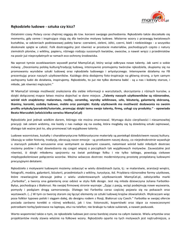 Rękodzieło ludowe - sztuka czy kicz? Ostatnimi czasy Polacy coraz chętniej sięgają do tzw. korzeni swojego pochodzenia. Rękodzieło także doczekało się momentu, gdy cenne i inspirujące stają się dla twórców motywy ludowe. Misterne wzory z przewagą kwiatowych kształtów, w odcieniach podstawowej palety barw: czerwieni, zieleni, żółci, czerni, bieli i niebieskiego - a wszystko doskonale spięte w całość. Folk dostrzegalny jest również w prostocie materiałów, pochodzących często z natury ziemskich plonów, z wikliny, papieru, różnego rodzaju suszonych kwiatów, owoców, a nawet wręcz z przedmiotów na pozór już nieprzydatnych w ramach eco-ochrony środowiska. Na wprost tymże oczekiwaniom wyszedł portal MamyCel.pl, który wciąż odkrywa nowe talenty. Jak sami o sobie mówią: „Doceniamy polską kulturę/tradycję ludową, intensywnie promujemy twórców rękodzieła, skupiamy się na promowaniu wyrobów sztuki ludowej oraz rękodzieła ludowego i artystycznego. Intensywnie działamy na FB prezentując prace naszych użytkowników. Każdego dnia dodajemy foto-inspiracje na główną stronę, a tym samym zachęcamy ludzi do działania, inspirujemy. Rękodzieło, to już nie tylko domena babć - są u nas i kobiety starsze, i młode, jak również mężczyźni.” W MamyCel istnieje możliwość znalezienia dla siebie informacji o warsztatach, skorzystania z różnych kursów, a dzięki dołączonej mapce łatwo można dojechać w dane miejsce. „Talenty naszych użytkowników są różnorodne, wśród nich znajdziemy: malarstwo, rzeźby, ceramikę, wyroby wiklinowe, szło, biżuterię, galanterię skórzaną, tkaniny, koronki, ozdoby ludowe, meble oraz pamiątki. Każdy użytkownik ma możliwość dodawania na swoim profilu artykuły/poradniki/tutoriale, promując dzięki temu swoje talenty, firmę, usługi czy produkty.” - opowiada Beata Marszałek (właścicielka serwisu MamyCel.pl) Rękodzieło jest jednak wielkim darem, którego nie można zmarnować. Wymaga dużo cierpliwości i niesamowitej precyzji. Jak zatem widzimy, nie każdy z nas nadaje się na osobę, która mogłaby się tą dziedziną sztuki zajmować, dlatego tak ważne jest to, aby promować tak wyjątkowe talenty. Ludowe wzornictwo, kształty i charakterystyczne folklorystyczne materiały są poniekąd dziedzictwem naszej kultury. Ukazują w sobie historię, tradycję, obrazują nasze emocje - są przekazem naszej duszy, co niejednokrotnie wywołuje u starszych pokoleń wzruszenie oraz sentyment za dawnymi czasami, natomiast wśród ludzi młodych dostrzec możemy podziw i chęć dowiedzenia się czegoś więcej o początkach tak wyjątkowych motywów. Zauważalne jest również, iż dzięki młodemu spojrzeniu na świat polskiego folku i nie tylko takiego, powstają ciekawe międzypokoleniowe połączenia wzorów. Można wówczas dostrzec modernistyczną prostotę przeplataną ludowymi precyzyjnymi detalami. Rękodzieło z motywami ludowymi możemy zobaczyć w wielu dziedzinach życia, tj.: w malarstwie, aranżacji wnętrz, fotografii, modzie, galanterii, biżuterii, przedmiotach z wikliny, turystyce, itd. Przybiera różnorodne formy użytkowe, które rewelacyjnie obrazuje jedna z wielu utalentowanych użytkowniczek MamyCel.pl, założycielka marki „Farbotka”, a tworzy ona galanterię oraz odzież w stylu folk design. Jest nią młoda dziewczyna Juliana FarbotkoBytys, pochodząca z Białorusi. Na swojej firmowej stronie wyznaje: „Żyjąc z pasją, wciąż podejmuję nowe wyzwania, pomysły i podążam drogą samorozwoju. Dlatego też Farbotka coraz częściej pojawia się na pokazach oraz wystawach. (…) W tym co tworzę staram się łączyć elementy ze sztuki ludowej krajów słowiańskich. Wykraczam więc poza folklor typowo polski i sięgam dalej, do designu rodem z Rosji, Białorusi czy Czech.” Farbotka w swojej ofercie posiada zarówno torebki o różnej wielkości, jak i tzw. listonoszki, kopertówki oraz idące za nowoczesnymi potrzebami torby/pokrowce na laptopa, etui na telefon; nie brakuje tu także sukienek, a nawet poduszek. Warto wspomnieć także o tym, że rękodzieło ludowe jest coraz bardziej znane na całym świecie. Wielu artystów oraz projektantów mody stawia właśnie na folkowe wzory. Rękodzieło oparte na tych motywach jest najtrudniejsze, a zarazem najpiękniejsze. Trudność ta polega na tym, iż twórca jest poniekąd obciążony presją myślową, aby jak najdokładniej zachować przekaz ludowości, która wręcz krzyczy do nas, gdy spoglądamy na te dzieła i wywołuje w nas chęć zaśpiewania czegoś na ludową nutę. Czy jednak rękodzieło ludowe może być sztuką? Zadając sobie to pytanie zdefiniujmy pojęcie sztuka. Dla mnie jest nią wszelki talent podparty kreatywnym myśleniem, który możemy dostrzec, usłyszeć, poczuć, który wymaga precyzji, nakładu pewnej energii, wywołujący w nas jakieś emocje i doznania. Mogę więc śmiało powiedzieć, iż dopracowane pod każdym względem rękodzieło ludowe jest swoistą sztuką godną oglądania, rozmawiania o niej, czasem podziwu, a niekiedy konstruktywnej krytyki - z czym musimy się liczyć w każdej dziedzinie sztuki. Autor: Magdalena Ulbin