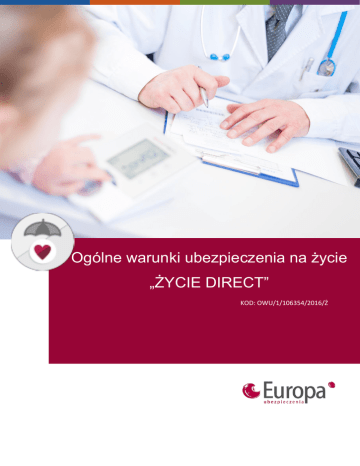 Ogólne warunki ubezpieczenia na życie „ŻYCIE DIRECT” KOD: OWU/1/106354/2016/Ż Informacja na podstawie Rozporządzenia Ministra Finansów w sprawie sposobu sporządzania informacji zamieszczanych we wzorcach umów. 1. Przesłanki wypłaty odszkodowania i innych świadczeń lub wartość wykupu ubezpieczenia opisane są w § 3 OWU. 2. Ograniczenia oraz wyłączenia odpowiedzialności zakładu ubezpieczeń uprawniające do odmowy wypłaty odszkodowania i innych świadczeń lub ich obniżenia opisane są w § 8 OWU. Ogólne warunki ubezpieczenia na życie „ŻYCIE DIRECT” (zatwierdzone Uchwałą Zarządu Towarzystwa Ubezpieczeń na Życie Europa S.A. nr 04/09/16 z dnia 13.09.2016 r. które wchodzą w życie z dniem uchwalania i mają zastosowanie do umów ubezpieczenia zawieranych od dnia 13.09.2016 r.) Kod: OWU/01/106354/2016/Z (zwane dalej: OWU) Spis treści Postanowienia wstępne ................................................................................................................................................ 3 Definicje ........................................................................................................................................................................ 3 Przedmiot i zakres ubezpieczenia ................................................................................................................................ 4 Zawarcie umowy ubezpieczenia ................................................................................................................................... 4 Warunki objęcia ochroną ubezpieczeniową ................................................................................................................. 5 Okres ubezpieczenia i okres odpowiedzialności .......................................................................................................... 6 Odstąpienie od umowy ubezpieczenia i wypowiedzenie umowy ubezpieczenia ......................................................... 6 Wyłączenia odpowiedzialności ..................................................................................................................................... 7 Uprawniony ................................................................................................................................................................... 8 Polisa ............................................................................................................................................................................ 9 Suma ubezpieczenia .................................................................................................................................................... 9 Wysokość świadczenia ubezpieczeniowego ................................................................................................................ 9 Zgłoszenie roszczenia o wypłatę świadczenia ubezpieczeniowego .......................................................................... 10 Wypłata świadczenia ubezpieczeniowego ................................................................................................................. 11 Składka ubezpieczeniowa .......................................................................................................................................... 12 Postanowienia końcowe ............................................................................................................................................. 13 Towarzystwo Ubezpieczeń na Życie Europa S.A. ul. Gwiaździsta 62 53-413 Wrocław [email protected] www.tueuropa.pl tel. 71 36 92 887, fax 71 36 92 707 Biuro Obsługi Klienta 801 500 300 (dla telefonów stacjonarnych) lub 71 36 92 887 (dla telefonów kom.) koszt połączenia zgodny z taryfą operatora TU na Życie Europa S.A. Sąd Rejonowy dla Wrocławia-Fabrycznej we Wrocławiu, KRS 0000092396, NIP 895-17-65-137, kapitał zakładowy zarejestrowany i opłacony 307 800 000 zł posiadająca zezwolenie Ministra Finansów nr FI/756/AU/KF/2001 z dnia 17 stycznia 2002 r. na prowadzenie działalności ubezpieczeniowej 2 Postanowienia wstępne §1 Na podstawie OWU, Towarzystwo Ubezpieczeń na Życie Europa S.A., zwane dalej ubezpieczycielem, zawiera umowy ubezpieczenia z osobami fizycznymi posiadającymi pełną zdolność do czynności prawnych lub osobami prawnymi, zwanymi dalej ubezpieczającymi. Definicje §2 Użyte w niniejszych OWU terminy, pisane wielką literą, oznaczają: 1. choroba – schorzenie powodujące zaburzenia w funkcjonowaniu układów lub narządów ciała, zaistniałe niezależnie od woli ubezpieczonego, powstałe w wyniku patologii możliwej do zdiagnozowana przez lekarza, wymagające leczenia, diagnostyki lub rehabilitacji, 2. ciężkie zachorowanie – schorzenie, które na podstawie aktualnej wiedzy medycznej, specjalistycznych badań medycznych, i/lub badania histopatologicznego lekarz medycyny określa jako terminalne (nieuleczalne). Według kryteriów medycznych takie schorzenie jest leczone objawowo a nie przyczynowo i przyjmuje prawdopodobieństwo Zgonu Ubezpieczonego w dającej się przewidzieć, krótkiej perspektywie czasowej oraz trwale uniemożliwia samodzielną egzystencję, przyjmuje (powoduje) konieczność podtrzymywania czynności życiowych. Do takich schorzeń należą przede wszystkim: 1) choroby nowotworowe, potwierdzone histopatologicznie z rozpoznanymi przerzutami do innych narządów, do tej grupy należą również schorzenia rozrostowe (npl) układu limfatycznego (np. chłoniak) i białokrwinkowego (np. białaczka limfatyczna), 2) ciężkie, nieuleczalne schorzenia układu krążenia (NYHA IV) i układu oddechowego (skrajne POCHP lub astma oskrzelowa), 3) skrajna, przewlekła niewydolność nerek poprzedzona długotrwałą dializą wraz z zespołem wątrobowonerkowym, 4) schyłkowa niewydolność wątroby przebiegająca z nadciśnieniem wrotnym, powikłana krwawieniem z górnego odcinka przewodu pokarmowego, powstała