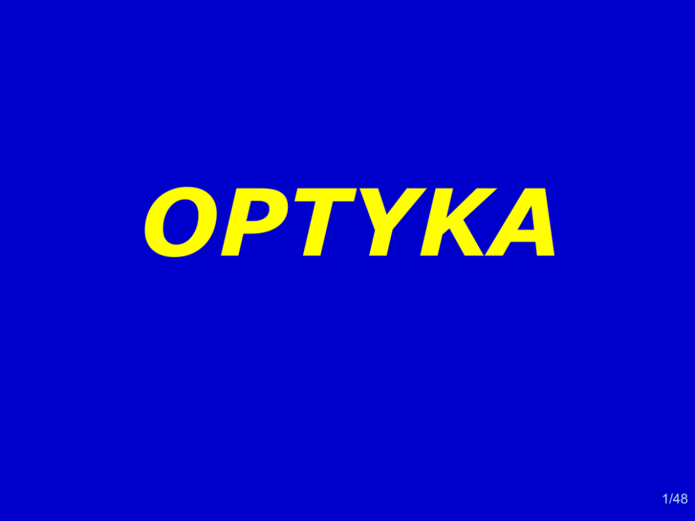 OPTYKA 1/48 Źródła światła Światło jest falą elektromagnetyczną. c = 300 000 km/s Naturalnymi źródłami światła są wszystkie ciała świecące światłem własnym. Światło porusza się prostoliniowo. 2/48 Źródła światła Przyczyny świecenia źródeł światła: - podgrzewanie do wysokiej temperatury - gazy pobudzone do świecenia w silnym polu elektrycznym 3/48 Źródła światła - pochłanianie promieniowania ultrafioletowego - reakcje chemiczne 4/48 Wtórne źródła światła Wszystkie przedmioty oświetlone światłem naturalnym (np. słonecznym) odbijają lub rozpraszają to światło, stając się wtórnymi źródłami światła 5/48 Prawo odbicia światła Normalna Promień padający Promień odbity a b Zwierciadło płaskie a - kąt padania b - kąt odbicia 6/48 Prawo odbicia światła Prawo odbicia światła Światło odbija się od powierzchni ciał zawsze w takim kierunku, że kąt odbicia b jest równy kątowi padania a. a=b Promień padający, promień odbity i normalna leżą w jednej płaszczyźnie. 7/48 Odbicie i rozproszenie Dzięki rozproszeniu światła widzimy przedmioty, które same nie są źródłami światła. 8/48 Odbicie w lustrze Za — — — — pomocą zwierciadła płaskiego otrzymujemy obraz: pozorny, prosty, tej samej wielkości, symetryczny względem płaszczyzny zwierciadła. 9/48 Odbicie w lustrze Obraz powstaje w wyniku przecięcia się przedłużeń promieni odbitych 10/48 od powierzchni lustra. Podział zwierciadeł kulistych Zwierciadło kuliste stanowi część gładkiej wypolerowanej kuli. Zwierciadła kuliste dzielimy na: - wklęsłe (odbija wewnętrzna powierzchnia kuli) - wypukłe (odbija zewnętrzna powierzchnia kuli) 11/48 Cechy zwierciadła Każde zwierciadło kuliste posiada: - środek krzywizny O - promień krzywizny r - oś główną OS r S O oś główna zwierciadła 12/48 Cechy obrazu i bieg promieni Cechy obrazu: - rzeczywisty lub pozorny - prosty lub odwrócony - powiększony, pomniejszony lub tej samej wielkości Bieg promieni w zwierciadle wklęsłym: a. Promień padający równoległy do osi optycznej po odbiciu przechodzi przez ognisko. b. Promień padający przechodzący przez ognisko po odbiciu jest równoległy do osi optycznej. c. Promień padający na punkt S po odbiciu jest symetryczny względem osi optycznej. 13/48 Zwierciadło wklęsłe O S FF Ogniskowa zwierciadła f jest równa połowie promienia krzywizny r: r f  2 f r F – ognisko zwierciadła f - ogniskowa zwierciadła r – promień krzywizny 14/48 Obraz w zwierciadle wklęsłym Cechy obrazu: – rzeczywisty – powiększony B O F A A1 – odwrócony B1 15/48 Zwierciadło wypukłe O S F’ f r F’ – ognisko pozorne 16/48 Światło na granicy ośrodków Jeżeli światło pada na granice dwóch ośrodków przezroczystych to najczęściej − część się odbija (zgodnie z prawem odbicia) − część wchodzi do drugiego ośrodka zmieniając kierunek swego biegu Mówimy, że światło ZAŁAMUJE SIĘ. 17/48 Zjawisko załamania Zjawisko załamanie światła występuje wtedy, gdy światło przechodzi z jednego ośrodka przezroczystego do drugiego. a – kąt padania b – kąt załamania 18/48 Prawo załamania światła Promień padający Normalna a - kąt padania a b - kąt załamania Granica ośrodków b Promień załamany 19/48 Przyczyny załamania światła Zmiana kierunku promienia na granicy dwóch ośrodków spowodowana jest tym, że światło w różnych ośrodkach rozchodzi się z różnymi szybkościami. 20/48 Jak się załamuje Przy przejściu promienia światła z jednego ośrodka (w którym rozchodzi się z szybkością v1) do drugiego (szybkość - v2) rozróżniamy następujące przypadki: − v1 > v2 to a>b − v1 < v2 to a<b − a=0 to b = 0 (brak zmiany kierunku) Gdy kąt padania a rośnie to kąt załamania b również rośnie. 21/48 Światło „białe” Jakie są źródła światła „białego”? Światło słoneczne i światło zwykłej żarówki. Pryzmat to przezroczysty graniastosłup o podstawie trójkąta. 22/48