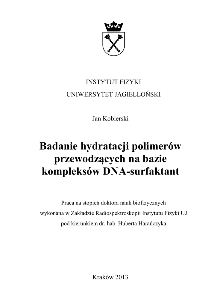 Astronomii i Informatyki Stosowanej Uniwersytetu Jagiellońskiego oświadczam, że przedłożona przeze mnie praca doktorska pt. ,,Badanie hydratacji polimerów przewodzących na bazie kompleksów DNA-surfaktant” przedstawia wyniki badań wykonanych przeze mnie osobiście, pod kierunkiem dr. hab. Huberta Harańczyka. Pracę napisałem samodzielnie.