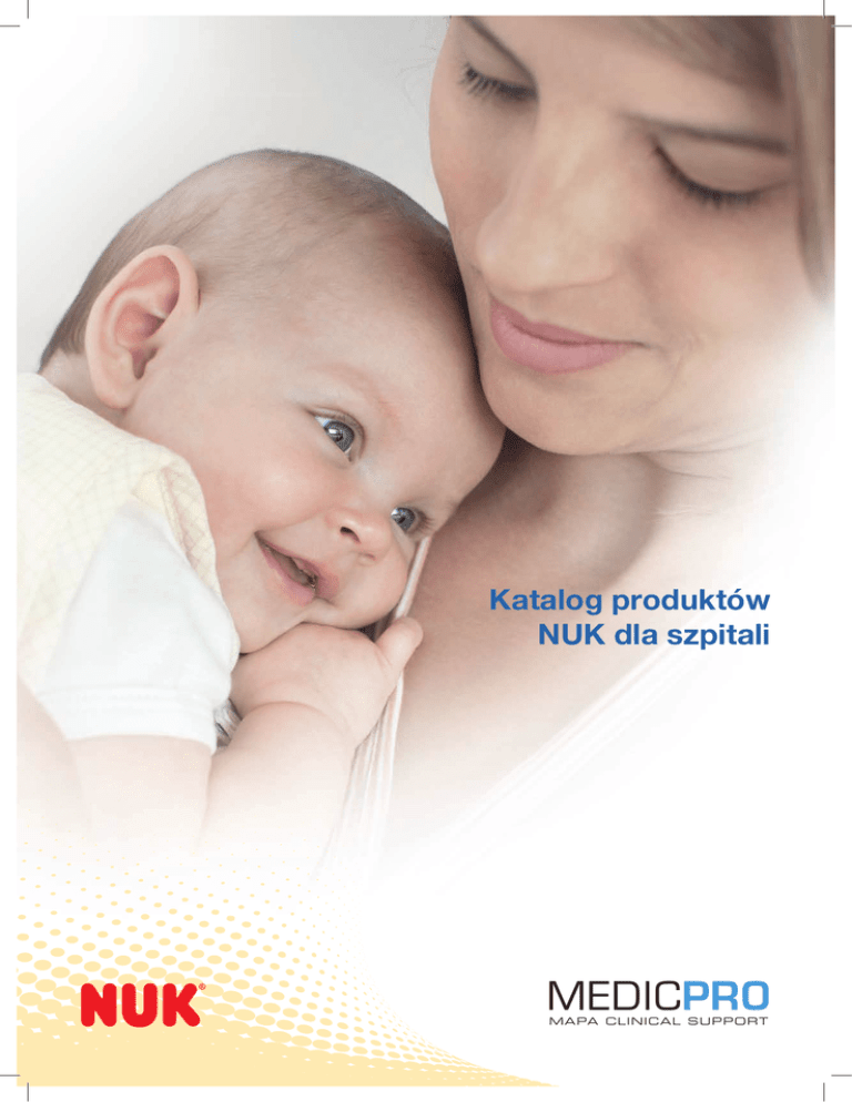 Katalog produktów NUK dla szpitali MEDICPRO MAPA CLINICAL SUPPORT 2 SPIS TREŚCI Smoczki anatomiczne Strona Smoczki do butelek NUK . . . . . . . . . . . . . . . . . . . . . . . . . . . . . . . . . . . . . . . . . . . . . . . . . . . . . . . . . . . . . . . . 4 Smoczki uspokajające NUK ........................................................... 16 Produkty do użytku w szpitalach Smoczki do butelek NUK First Choice . . . . . . . . . . . . . . . . . . . . . . . . . . . . . . . . . . . . . . . . . . . . 4-5 Butelki NUK First Choice ............................................................. 6-7 Jednorazowe smoczki do butelek standardowych NUK . . . . . . . . . . . . . . . . . . . . 8-9 Smoczki specjalistyczne NUK . . . . . . . . . . . . . . . . . . . . . . . . . . . . . . . . . . . . . . . . . . . . . . . . . . . . . . . . . . 9 Jednorazowe butelki standardowe .................................................. 10 Butelki standardowe NUK wielokrotnego użytku . . . . . . . . . . . . . . . . . . . . . . . . . . . . . . . . 11 Butelki i smoczki MedicPro . . . . . . . . . . . . . . . . . . . . . . . . . . . . . . . . . . . . . . . . . . . . . . . . . . . . . . . . 12-13 Smoczki i butelki NUK dla dzieci przedwcześnie urodzonych .............. Smoczki uspokajające NUK dla dzieci przedwcześnie urodzonych Smoczki uspokajające NUK ...................................................... 15 16-19 ....................................... 19 ......................................... 20 ............................................................... 21 Terapeutyczny smoczek treningowy NUK Smoczek do podawania kontrastu NUK Wkładki laktacyjne NUK ....... 14 Pomoce do karmienia NUK ........................................................... 22 Odciągacze pokarmu NUK ........................................................... 23 Inne produkty Urządzenia elektryczne NUK . . . . . . . . . . . . . . . . . . . . . . . . . . . . . . . . . . . . . . . . . . . . . . . . . . . . . . . . . . 24 Podgrzewacze pokarmu NUK ....................................................... 25 Artykuły NUK do higieny i pielęgnacji . . . . . . . . . . . . . . . . . . . . . . . . . . . . . . . . . . . . . . . . . . . . . . 26 Higieniczne akcesoria dla szpitali ................................................... 27 Zalety naszych produktów: Made in Germany Wszystkie jednorazowe produkty medyczne są sterylizowane zgodnie z Farmakopeą Europejską. Sprzedaż butelek dla niemowląt zawierających bisfenol A (BPA) jest zabroniona w Unii Europejskiej od 01.06.2011. Produkty* do użytku w szpitalach są produkowane w Niemczech. Nasze produkty są sterylizowane bez użycia tlenku etylenu. * Wkładki laktacyjne i butelki szklane są produkowane w UE. 3 SMOCZKI DO BUTELEK NUK FIRST CHOICE Inspirowane naturą Karmienie piersią zapewnia dziecku najlepszy start w życiu – nie tylko ze względu na korzyści psychologiczne, lecz także na wartości odżywcze mleka matki. Ssanie piersi wymaga koordynacji ruchów szczęki, podniebienia, języka i warg, a więc karmienie piersią wspiera także zdrowy rozwój jamy ustnej i mowy dziecka. To na podstawie tej wiedzy opracowano anatomiczny smoczek do butelki NUK. Przez dziesięciolecia NUK badał i stale udoskonalał kształt smoczków do butelki i uspokajających na podstawie najnowszych odkryć naukowych. Dzięki temu smoczki NUK umożliwiają ćwiczenie wszystkich funkcji jamy ustnej oraz sprawiają, że dziecko czuje się tak jakby ssało pierś mamy. Nie bez powodu smoczki NUK nie są okrągłe Dwaj stomatolodzy Prof. Dr. Dr. W. Balters oraz Dr. med. dent. A. Müller odkryli, że brodawka sutkowa matki zmienia swój kształt w czasie karmienia piersią, umożliwiając optymalną koordynację ruchów szczęki, podniebienia, języka i warg. To właśnie ten asymetryczny kształt brodawki był wzorem dla wszystkich smoczków NUK do butelki i uspokajających. I to dzięki temu NUK jest najczęściej używaną marką w niemieckich szpitalach. TONGUE TONGUE Karmienie piersią: Zmieniony kształt brodawki sutkowej podczas karmienia. Kształt NUK: Naturalne ruchy podczas ssania, takie jak przy karmieniu piersią. Bliżej piersi matki – NUK First Choice Przez wiele lat NUK pracował nad tym, aby zaspokoić potrzeby położnych, pediatrów oraz milionów matek na całym świecie. Wraz z serią NUK First Choice udało nam się opracować butelkę ze smoczkiem, która umożliwia karmienie jak najbardziej zbliżone do karmienia piersią. Umożliwia łączenie karmienia piersią i butelką na uniwersytecie w Barcelonie dowiodły, że używając butelek do karmienia NUK First Choice, matki mogą bez problemu karmić dziecko zarówno piersią, jak i butelką.* To dlatego opracowaliśmy serię NUK First Choice dla szpitali – aby mieć rozwiązanie w sytuacjach, gdy karmienie piersią jest niemożliwe. Oprócz tego są naukowe dowody na to, że sposób ssania piersi przez dziecko nie ulegnie zmianie, jeżeli między karmieniami będzie dokarmiane butelką. Badania przeprowadzone Nowa miękka strefa Dzięki maksymalnej miękkości dostosowuje się jeszcze lepiej do podniebienia - co sprawia wrażenie naturalnego ssania. Antykolkowy system odpowietrzania NUK AIR SYSTEM Wyrównuje ciśnienie w butelce w czasie karmienia, tym samym zmniejszając ryzyko połykania powietrza i wystąpienia kolki. 4 * Study of the act of sucking in healthy babies in breastfeeding and artificial feeding using NUK Teats. Ortodontia 3 (35) 2006 Spłaszczona gumka Tak aby język mógł się swobodnie poruszać w czasie ssania. Szerokie oparcie dla warg Wzorowane na naturalnym przykładzie piersi matki w czasie karmienia piersią. SMOCZKI DO BUTELEK NUK FIRST CHOICE Spokojne karmienie, tak jak przy piersi mamy Jednorazowe smoczki do butelek NUK First Choice zapewniają wrażenie naturalnego ssania nie tylko dzięki swojemu anatomicznemu kształtowi, lecz także miękkości materiałów, z których są wykonane. NUK oferuje smoc