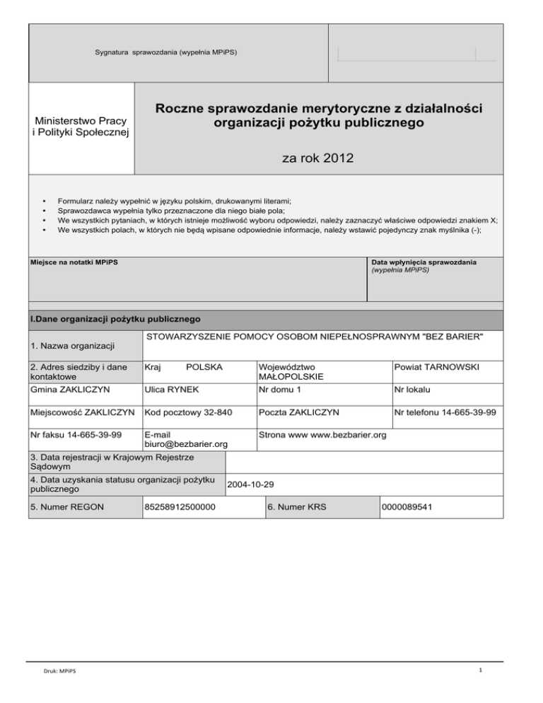 6\JQDWXUDVSUDZR]GDQLDZ\SHáQLD 6\JQDWXUDVSUDZR]GDQLDZ\SHáQLD03L36 MPiPS) Ministerstwo Pracy L3ROLW\NL6SRáHF]QHM 5RF]QHVSUDZR]GDQLHPHU\WRU\F]QH]G]LDáDOQRĞFL RUJDQL]DFMLSRĪ\WNXSXEOLF]QHJR za rok 2012 • • • • )RUPXODU]QDOHĪ\Z\SHáQLüZMĊ]\NXSROVNLPGUXNRZDQ\PLOLWHUDPL 6SUDZR]GDZFDZ\SHáQLDW\ONRSU]H]QDF]RQHGODQLHJRELDáHSROD :HZV]\VWNLFKS\WDQLDFKZNWyU\FKLVWQLHMHPRĪOLZRĞüZ\ERUXRGSRZLHG]LQDOHĪ\]D]QDF]\üZáDĞFLZHRGSRZLHG]L]QDNLHP; :HZV]\VWNLFKSRODFKZNWyU\FKQLHEĊGąZSLVDQHRGSRZLHGQLHLQIRUPDFMHQDOHĪ\ZVWDZLüSRMHG\QF]\]QDNP\ĞOQLND 'DWDZSá\QLĊFLDVSUDZR]GDQLD Z\SHáQLD03L36 Miejsce na notatki MPiPS ,'DQHRUJDQL]DFMLSRĪ\WNXSXEOLF]QHJR 672:$5=<6=(1,(3202&<262%201,(3(à12635$:1<0%(=%$5,(5 1. Nazwa organizacji 2. Adres siedziby i dane kontaktowe Kraj Gmina ZAKLICZYN POLSKA Województwo 0$à232/6.,( Powiat TARNOWSKI Ulica RYNEK Nr domu 1 Nr lokalu 0LHMVFRZRĞü=$./,&=<1 Kod pocztowy 32-840 Poczta ZAKLICZYN Nr telefonu 14-665-39-99 Nr faksu 14-665-39-99 E-mail [email protected] Strona www www.bezbarier.org 3. Data rejestracji w Krajowym Rejestrze 6ąGRZ\P 'DWDX]\VNDQLDVWDWXVXRUJDQL]DFMLSRĪ\WNX publicznego 5. Numer REGON Druk: MPiPS 85258912500000 2004-10-29 6. Numer KRS 0000089541 1 6NáDGRUJDQX]DU]ąG]DMąFHJRRUJDQL]DFML 1DOHĪ\ZSLVDüLPLRQDQD]ZLVNDRUD]LQIRUPDFMHRIXQNFML SHáQLRQHMSU]H]SRV]F]HJyOQ\FKF]áRQNyZRUJDQX ]DU]ąG]DMąFHJR 6NáDGRUJDQXNRQWUROLOXEQDG]RUXRUJDQL]DFML 1DOHĪ\ZSLVDüLPLRQDQD]ZLVNDRUD]LQIRUPDFMHRIXQNFML SHáQLRQHMSU]H]SRV]F]HJyOQ\FKF]áRQNyZRUJDQXNRQWUROL lub nadzoru) 3UH]HVOHNPHG-HU]\:RĨQLDN Wiceprezes: Bogdan Litwa 6HNUHWDU]$QGU]HM6]F]HSDĔVNL Skarbnik: Joanna Mleczko &]áRQHN]Z\Ná\]DU]ąGX,UHQD.ZLHN 3U]HZRGQLF]ąF\.RPLVMLUHZL]\MQHM.U]\V]WRI3DáDFK &]áRQNLQLH$QWRQLQDĝUHGQLDZD7HUHVD3LHNDU] DG]LDáDOQRĞüQLHRGSáDWQDSRĪ\WNXSXEOLF]QHJR 9. Cele statutowe organizacji 1DOHĪ\RSLVDüFHOHQDSRGVWDZLHVWDWXWXRUJDQL]DFML Druk: MPiPS ,3RGVWDZRZ\PFHOHP6WRZDU]\V]HQLDMHVWG]LDáDOQRĞüQDU]HF] RVyEQLHSHáQRVSUDZQ\FKSRSU]H]SURZDG]HQLHUHKDELOLWDFML VSRáHF]QHMOHF]QLF]HML]DZRGRZHM ,,6]F]HJyáRZ\PLFHODPL6WRZDU]\V]HQLDVą DG]LDáDOQRĞüQDU]HF]RVyEVSHFMDOQHMWURVNL b) wszechstronne propagowanie informacji metod i technik w zakresie profilaktyki AIDS; c) popieranie i promocja zdrowia; d) profilaktyka alkoholowa, nikotynowa, narkotykowa; HĞZLDGF]HQLHSRPRF\RVRERPSRV]NRGRZDQ\PZZ\SDGNDFK komunikacyjnych; ISRGHMPRZDQLHG]LDáDĔZ]DNUHVLHSRPRF\VSRáHF]QHMZW\P SRPRF\URG]LQRPLRVRERPZWUXGQHMV\WXDFMLĪ\FLRZHMRUD] wyrównywanie szans tych rodzin i osób; JG]LDáDOQRĞüFKDU\WDW\ZQD KSRGWU]\P\ZDQLHWUDG\FMLQDURGRZHMSLHOĊJQRZDQLHSROVNRĞFL RUD]UR]ZRMXĞZLDGRPRĞFLQDURGRZHMRE\ZDWHOVNLHMLNXOWXURZHM i) promocja zatrudnienia i aktywizacji zawodowej osób SR]RVWDMąF\FKEH]SUDF\L]DJURĪRQ\FK]ZROQLHQLHP]SUDF\ MXSRZV]HFKQLDQLHLRFKURQDSUDZNRELHWRUD]G]LDáDOQRĞüQDU]HF] UyZQ\FKSUDZNRELHWLPĊĪF]\]Q NSRGHMPRZDQLHG]LDáDĔZ]DNUHVLHZVSRPDJDQLDUR]ZRMX JRVSRGDUF]HJRZW\PUR]ZRMXSU]HGVLĊELRUF]RĞFL OG]LDáDOQRĞüZVSRPDJDMąFDUR]ZyMZVSyOQRWLVSRáHF]QRĞFL lokalnych; PG]LDáDOQRĞüSURPXMąFDQDXNĊHGXNDFMĊRĞZLDWĊLZ\FKRZDQLH QG]LDáDOQRĞüSURPXMąFDNXOWXUĊV]WXNĊRFKURQĊGyEUNXOWXU\L tradycji; o) upowszechnianie kultury fizycznej i sportu; SG]LDáDOQRĞüZ]DNUHVLHHNRORJLLLRFKURQ\]ZLHU]ąWRUD]RFKURQ\ dziedzictwa przyrodniczego; TG]LDáDOQRĞüZ]DNUHVLHSRU]ąGNXLEH]SLHF]HĔVWZDSXEOLF]QHJR RUD]SU]HFLZG]LDáDQLDSDWRORJLRPVSRáHF]Q\P UG]LDáDOQRĞüZ]DNUHVLHXSRZV]HFKQLDQLDLRFKURQ\ZROQRĞFLL SUDZF]áRZLHNDRUD]VZREyGRE\ZDWHOVNLFKDWDNĪHG]LDáDĔ ZVSRPDJDMąF\FKUR]ZyMGHPRNUDFML VXG]LHODQLHSRPRF\RILDURPNDWDVWURINOĊVNĪ\ZLRáRZ\FK WG]LDáDQLDQDU]HF]LQWHJUDFMLHXURSHMVNLHMRUD]UR]ZLMDQLD NRQWDNWyZLZVSyáSUDF\PLĊG]\VSRáHF]HĔVWZDPL u) promocja i organizacja wolontariatu; v) wspieranie finansowe i rzeczowe osób fizycznych i prawnych oraz prowadzenie programów stypendialnych. 2 10. Sposób realizacji celów statutowych organizacji 1DOHĪ\RSLVDüVSRVyEUHDOL]DFMLFHOyZVWDWXWRZ\FK organizacji na podstawie statutu organizacji) 1DMZDĪQLHMV]HVIHU\G]LDáDOQRĞFLSRĪ\WNX publicznego 1DOHĪ\ZVND]DüQLHZLĊFHMQLĪWU]\QDMZDĪQLHMV]HSRG Z]JOĊGHPZLHONRĞFLZ\GDWNRZDQ\FKĞURGNyZVIHU\ G]LDáDOQRĞFLSRĪ\WNXSXEOLF]QHJRRNWyU\FKPRZDZDUW XVWXVWDZ\]GQLDNZLHWQLDURG]LDáDOQRĞFL SRĪ\WNXSXEOLF]QHJRLRZRORQWDULDFLH(Dz. U. z 2010 r. Nr 234, poz. 1536), ]DF]\QDMąFRGQDMZDĪQLHMV]HM 6WRZDU]\V]HQLHUHDOL]XMHVZRMHFHOHZV]F]HJyOQRĞFLSRSU]H] DRUJDQL]RZDQLHVSRWNDĔSUHOHNFMLZ\VWDZNRQFHUWyZRUD] UyĪQ\FKLQQ\FKLPSUH]NXOWXUDOQ\FKVSRUWRZ\FKWXU\VW\F]Q\FKR charakterze integracyjnym; EXWZRU]HQLHLSURZDG]HQLHRĞURGNDG]LHQQHJRSRE\WXGODG]LHFL QLHSHáQRVSUDZQ\FK FRUJDQL]RZDQLHLSURZDG]HQLHLQQ\FKSODFyZHNRSLHNXĔF]R Z\FKRZDZF]\FKZW\PZDUV]WDWyZWHUDSLL]DMĊFLRZHM GSURZDG]HQLHG]LDáDOQRĞFLZ\GDZQLF]HM HZVSyáSUDFĊLZ]DMHPQąSRPRFF]áRQNRPVWRZDU]\V]HQLD IZVSyáSUDFĊ]ZV]HONLPLRVREDPLLLQVW\WXFMDPLRSRGREQ\FK FHODFKG]LDáDQLD JZ\VWĊSRZDQLH]ZQLRVNDPLLRSLQLDPLGRZáDĞFLZ\FKZáDG] XU]ĊGyZRUD]VąGyZZVSUDZDFKGRW\F]ąF\FK6WRZDU]\V]HQLD KRSLQLRZDQLHSURMHNWyZGRW\F]ąF\FKG]LDáDOQRĞFL6WRZDU]\V]HQLD LSU]HFLZG]LDáDQLHSU]HPRF\ZURG]LQLH j) organizowanie grup wsparcia dla rodziców dzieci QLHSHáQRVSUDZQ\FK NLQQHG]LDáDQLDUHDOL]XMąFHFHOHVWRZDU]\V]HQLDRUJDQL]RZDQLH turnusów rehabilitacyjnych, organizacja przewozu osób QLHSHáQRVSUDZQ\FKSRPRFRVRERPQLHSHáQRVSUDZQ\PZ ]DRSDWU]HQLXZVSU]ĊWUHKDELOLWDF\MQ\LRUWRSHG\F]Q\RUD]SRPRFZ X]\VNLZDQLXRU]HF]HĔRVWRSQLXQLHSHáQRVSUDZQRĞFL OZVSDUFLHILQDQVRZHLU]HF]RZHRUD]Z\SáDWDVW\SHQGLyZ SRPRFVSRáHF]QDZW\PSRPRFURG]LQRPLRVRERPZWUXGQHM V\WXDFMLĪ\FLRZHMRUD]Z\UyZQ\ZDQLHV]DQVW\FKURG]LQLRVyE G]LDáDOQRĞüQDU]HF]RVyEQLHSHáQRVSUDZQ\FK promocja i organizacja wolontariatu ,,&KDUDNWHU\VW\NDG]LDáDOQRĞFLRUJDQL]DFMLSRĪ\WNXSXEOLF]QHJRZRNUHVLHVSUDZR]GDZF]\P 2SLVG]LDáDOQRĞFLSRĪ\WNXSXEOLF]QHJR 2SLVJáyZQ\FKG]LDáDĔ SRGMĊW\FKSU]H]RUJDQL]DFMĊ Druk: MPiPS DÄ352:$'=(1,(2ĝ52'.$32%<78'=,(11(*2'/$'=,(&, 1,(3(à12635$:1<&+´G]LDáDOQRĞüFDáRURF]QD ']LDáDOQRĞüRĞURGNDILQDQVRZDQDMHVW]EXGĪHWXSDĔVWZD]HĞURGNyZ 3DĔVWZRZHJR)XQGXV]X5HKDELOLWDFML2VyE1LHS