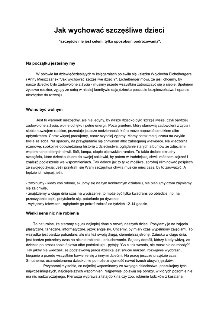 Jak wychować szczęśliwe dzieci "szczęście nie jest celem, tylko sposobem podróżowania". Na początku jesteśmy my W połowie lat dziewięćdziesiątych w księgarniach pojawiła się książka Wojciecha Eichelbergera i Anny Mieszczanek "Jak wychować szczęśliwe dzieci?". Eichelberger mówi, że jeśli chcemy, by nasze dziecko było zadowolone z życia - musimy przede wszystkim zatroszczyć się o siebie. Spełnieni życiowo rodzice, żyjący ze sobą w niezłej komitywie dają dziecku poczucie bezpieczeństwa i oparcie niezbędne do rozwoju. Wolno być wolnym Jest to warunek niezbędny, ale nie jedyny, by nasze dziecko było szczęśliwsze, czyli bardziej zadowolone z życia, wolne od lęku i pełne energii. Poza gruntem, który stanowią zadowoleni z życia i siebie nawzajem rodzice, pozostaje jeszcze codzienność, która może napawać smutkiem albo optymizmem. Coraz więcej pracujemy, coraz szybciej żyjemy. Mamy coraz mniej czasu na zwykłe bycie ze sobą. Na spacery, na przyglądanie się chmurom albo zabieganej wiewiórce. Na wieczorną rozmowę, spokojnie opowiedzianą historię z dzieciństwa, oglądanie starych albumów ze zdjęciami, wspominanie dobrych chwil. Stół, lampa, ciepło ojcowskich ramion. To takie drobne okruchy szczęścia, które dziecko zbiera do swojej sakiewki, by potem w trudniejszej chwili móc tam zajrzeć i znaleźć pocieszenie we wspomnieniach. Tak dalece jak to tylko możliwe, spróbuj eliminować pośpiech ze swojego życia. Jeśli przytrafi się Wam szczęśliwa chwila musicie mieć czas, by to zauważyć. A będzie ich więcej, jeśli: - zwolnijmy - kiedy coś robimy, skupmy się na tym konkretnym działaniu, nie planujmy czym zajmiemy się za chwilę, - znajdziemy w ciągu dnia czas na wyciszenie, to może być tylko kwadrans po obiedzie, np. na przeczytanie bajki, przytulenie się, poturlanie po dywanie - wyłączmy telewizor - oglądanie go potrafi zabrać co tydzień 12-14 godzin. Wielki sens nic nie robienia To naturalne, że staramy się jak najlepiej dbać o rozwój naszych dzieci. Posyłamy je na zajęcia plastyczne, taneczne, informatyczne, język angielski. Chcemy, by miały czas wypełniony zajęciami. To wszystko jest bardzo potrzebne, ale ma też swoją drugą, ciemniejszą stronę. Dziecku w ciągu dnia, jest bardzo potrzebny czas na nic nie robienie, leniuchowanie. Są tacy dorośli, którzy kiedy widzą, że dziecko po prostu sobie śpiewa albo podskakuje - pytają: "Co ci tak wesoło, nie masz nic do roboty?". Tak jakby nie wiedzieli, że podstawową pracą dziecka jest snucie marzeń, rozwijanie wyobraźni, bieganie a przede wszystkim bawienie się z innymi dziećmi. Na pracę jeszcze przyjdzie czas. Smutnemu, osamotnionemu dziecku nie pomoże znajomość nawet trzech obcych języków. Przypomnijmy sobie, co najmilej wspominamy ze swojego dzieciństwa, poszukajmy tych najwcześniejszych, najcieplejszych wspomnień. Najpewniej pojawią się obrazy, w których pozornie nie ma nic nadzwyczajnego. Pierwsza wyprawa z tatą do kina czy zoo, robienie ludzików z kasztana, „przytulanki” w rodzicielskim łóżku w niedzielny poranek, ciasto z owocami, pierwsza Wigilia. Najczęściej dzieci miło wspominają chwile, kiedy dorośli poświęcali im swój czas w beztroski, niezaplanowany sposób. Taki, który mija powoli i wypełniony jest po prostu wspólnym byciem, bliskością, bezpieczeństwem. Kiedy nie ma żadnego "muszę", "trzeba", "powinienem", "natychmiast". Nieoczekiwana zamiana ról Czasem nie doceniamy tego jak wiele siły i poczucia pewności siebie daje dziecku wspólna zabawa z mamą i tatą. Zwłaszcza gdy to nie dorosły, ale dziecko dyktuje warunki. Ono ustala zasady, reguły, rozdaje role i dyryguje zabawą. Do ciebie należy jedynie przestrzeganie reguł i ustalenie ram czasowych. Możecie też razem robić to, na co zwykle nie ma miejsca w dorosłym życiu - malować palcami, przebierać się w stare suknie, udawać niemowlaka. Dajmy się poprowadzić dziecku za rękę w świat jego wyobraźni. Czy woli być wielkim słoniem, czy malutką myszką? Czy przez całą zabawę krzyczy na ciebie odgrywając Waszą ostatnią kłótnię? To są takie chwile, kiedy możemy sobie przypomnieć co my czuliśmy będąc dzieckiem, a nasza córka czy syn poczuć własną samodzielność, niezależną od nas siłę. A przecież naszym zadaniem jest sprawienie, by dziecko dawało sobie radę samo. Wtedy też będzie miało okazje przeżyć dumę i radość z własnych dokonań. Będzie widziało, że zawdzięcza je sobie samemu. Warto dbać o to, by jak tylko to będzie możliwe, mogło samo dokonywać wyborów (wolisz fasolkę, czy buraczki, sweter, czy bluzę, koński ogon, czy warkoczyki), a także miało jak najwięcej samodzielności w tych dziedzinach, w których nie zagraża to jego bezpieczeństwu. Wyręczanie dziecka nie tylko nie pozwala mu nauczyć się niezbędnych umiejętności, a każde dziecko chce, by rodzice wierzyli w jego możliwości, w to, że jak przyjdzie co do czego to da sobie radę. Jeżeli mama i tata w nie wierzą, ono wierzy w siebie podwójnie. Dobrze, że jesteś Dziecko chce się czuć chciane, kochane i bezpieczne. Spróbuj poszukać sposobów na okazywanie mu tego na co dzień. Tak jak dorośli potrzebują zapewnień od swoich partnerów, że są dla siebie ważni i atrakcyjni, tak samo dziecko chce słyszeć, że jest kochane niezależnie od tego co się w Waszym życiu dzieje. Zwłaszcza wtedy kiedy są to trudne momenty, a dla malucha takim jest np. awantura o bałagan w dziecinnym pokoju. Może wymyślicie coś szczególnego, co mówi się (lub rysuje) tylko w Waszym domu, jakiś znak, symbol, który przekazujecie sobie, żeby okazać swoje uczucie. Czasem wystarczy przelotne muśnięcie po głowie, albo zatrzymanie się, by przytulić przechodzące dziecko. Bez słów, za to z ogromnym spokojem. Magiczna moc słów Mamy niedobry nawyk narzekania czy zapominania o nieuważnie danej obietn