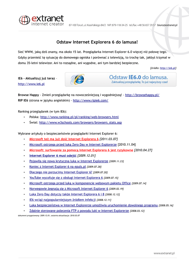 Odstaw Internet Explorera 6 do lamusa! Sieć WWW, jaką dziś znamy, ma około 15 lat. Przeglądarka Internet Explorer 6.0 więcej niż połowę tego. Gdyby przenieść tę sytuację do domowego ogniska i porównać z telewizją, to trochę tak, jakbyś trzymał w domu 35-letni telewizor. Ani to rozsądne, ani wygodne, ani tym bardziej bezpieczne. [źródło: http://ie6.pl] IE6 – Aktualizuj już teraz – http://www.ie6.pl Browse Happy - Zmień przeglądarkę na nowocześniejszą i wygodniejszą! - http://browsehappy.pl/ RIP IE6 (strona w języku angielskim) - http://www.ripie6.com/ Ranking przeglądarek (w tym IE6): • Polska: http://www.ranking.pl/pl/ranking/web-browsers.html • Świat: http://www.w3schools.com/browsers/browsers_stats.asp Wybrane artykuły o bezpieczeństwie przeglądarki Internet Explorer 6: • Microsoft też ma już dość Internet Explorera 6 [2011.03.07] • Microsoft ostrzega przed luką Zero Day w Internet Explorerze [2010.11.04] • Microsoft: surfowanie za pomocą Internet Explorera 6 jest ryzykowne [2010.04.27] • Internet Explorer 6 musi odejść [2009.12.01] • Pojawiła się nowa krytyczna luka w Internet Explorerze • Koniec z Internet Explorer 6 na epuls.pl • Dlaczego nie porzucimy Internet Explorer 6? • YouTube wycofuje się z obsługi Internet Explorera 6 • Microsoft ostrzega przed luką w komponencie webowym pakietu Office • Norwegowie żegnają się z Microsoft Internet Explorer 6 • Luka Zero Day dotyczy także Internet Explorera 6 i 8 • IE6 wciąż najpopularniejszym źródłem infekcji • Luka bezpieczeństwa w Internet Explorerze umożliwia uruchomienie dowolnego programu • Zdalnie sterowane polecenia FTP z powodu luki w Internet Explorerze dokument przygotowany: 2009.12.01, ostatnia aktualizacja: 2010.03.07 [2009.11.23] [2009.07.28] [2009.07.20] [2009.07.15] [2009.07.14] [2009.02.19] [2008.12.12] [2008.12.11] [2008.03.12] [2008.05.16]