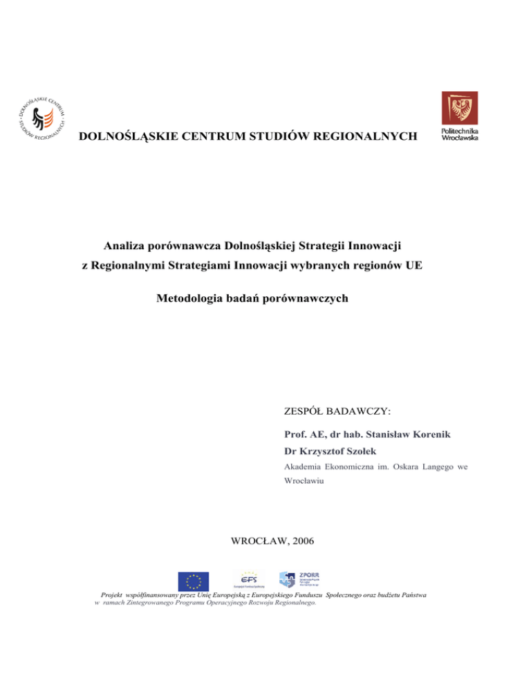 DOLNOŚLĄSKIE CENTRUM STUDIÓW REGIONALNYCH Analiza porównawcza Dolnośląskiej Strategii Innowacji z Regionalnymi Strategiami Innowacji wybranych regionów UE Metodologia badań porównawczych ZESPÓŁ BADAWCZY: Prof. AE, dr hab. Stanisław Korenik Dr Krzysztof Szołek Akademia Ekonomiczna im. Oskara Langego we Wrocławiu WROCŁAW, 2006 Projekt współfinansowany przez Unię Europejską z Europejskiego Funduszu Społecznego oraz budżetu Państwa w ramach Zintegrowanego Programu Operacyjnego Rozwoju Regionalnego. Spis treści Wstęp _________________________________________________________3 Bibliografia: ____________________________________________________3 Identyfikacja pojęć kluczowych i uzasadnienie zastosowania przyjmowanych metod badań porównawczych (Prof. AE, dr hab. Stanisław Korenik) _____6 Określenie kryteriów doboru badanych cech oraz parametrów ich oceny (Dr Krzysztof Szołek)_______________________________________________19 Wstęp Każdy proces badawczy składa się z określonych elementów, które stanowią stabilny układ działań niezależny od miejsca, czasu i dziedziny prowadzonych dociekań. Wśród tych czynności znajduje się określenie specyficznych metod jakimi badany jest dany wycinek rzeczywistości. Zestaw dyrektyw badawczych, które wynikają z przyjętych założeń teoretycznych i praktycznych, a które należy wykonać opracowując pracę naukową określany jest mianem metodologii. Celem prezentowanego opracowania jest określenie metodologii możliwej do zastosowania w zakresie analizy porównawczej Dolnośląskiej Strategii Innowacji z Regionalnymi Strategiami Innowacji wybranego regionu UE. Dla osiągnięcia tak postawionego zamierzenia prace badawcze zostały podzielone na dwa zadania cząstkowe związane z identyfikacją pojęć kluczowych i uzasadnieniem zastosowania przyjmowanych metod badawczych oraz określeniem kryteriów doboru badanych cech oraz parametrów ich oceny. Zadania te należy realizować z uwzględnieniem stosowanych rozwiązań dotyczących oceny efektywności wdrażania strategii. Autorzy zastrzegają, iż w trakcie prowadzonych badań dotyczących określonych strategii proponowane w niniejszym dokumencie metody mogą ulec nieznacznym modyfikacjom, w zależności od wyłaniających się nowych potrzeb badawczych lub innych niezależnych czynników. Jednocześnie autorzy oświadczają, że niniejsza ekspertyzę przygotowali z wykorzystaniem swej najlepszej wiedzy i z należytą starannością. Bibliografia: [1] AJDUKIEWICZ K., Logika pragmatyczna, PWN, Warszawa, 1975. [2] ANTOSZKIEWICZ J., Metody heurystyczne. Twórcze rozwiązywanie, Wyd. II, PWE, Warszawa, 1990. [3] APANOWICZ J., Metodologia nauk, Tonik Dom organizatora, Toruń, 2003. [4] BLAUG M., Metodologia Ekonomii, PWN, Warszawa, 1995. [5] European Innovation Scoreboard 2002, Technical Paper No 3 EU Regions, European Commission, 2002. [6] European Innovation Scoreboard 2004, Comparative analysis of innovation Performance, Commission Staff Working Paper, Brussels 2004. [7] Innovation in Europe Results for the EU, Iceland and Norway. Data 1998–2001. Panorama of the European Union, Office for Official Publications of the European Communities, Luxemburg 2004 [8] JANASZ. W, Innowacje w działalności przedsiębiorstw w integracji z Unią Europejską, Wyd. Difin, Warszawa, 2005 [9] KMITA J., Szkice z teorii poznania naukowego, PWN, Warszawa, 1976. [10] KOLMAN R., Poradnik dla doktorantów i habilitantów, TNOiK, Bydgoszcz, 1997. [11] KORENIK S., Dysproporcje w rozwoju regionów Polski – wybrane aspekty, AE, Wrocław, 2003. [12] KOTARBIŃSKI T., Dzieła wszystkie. Elementy teorii poznania, logiki formalnej i metodologii nauk, Ossolineum 1990. [13] KUKLIŃSKI A., Problematyka Przestrzeni Europejskiej, Euroreg, Warszawa, 1997. [14] M A J K U T J . , O teorii i praktyce badań naukowych, Wyd. WSOWRiA, Toruń, 1992. [15] MARKOCKI Z., KUBIELSKI W., Wybrane zagadnienia metodologii badań społecznych, Wyd. WSP, Słupsk, 1995. [16] Methodology Report on European Innovation Scoreboard 2005, European Commission. May 2005. [17] NOWAK. S., Metodologia badań społecznych, PWN, Warszawa, 1985. [18] PARTEKA T., Planowanie strategiczne w równoważeniu struktur regionalnych, PWN, Warszawa, 2000. [19] PIĘTER J., Z zagadnień prac naukowych, Ossolineum, 1974. [20] PIĘTER J., Zarys metodologii pracy naukowej, PWN, Warszawa, 1975. [21] PILCH T., Zasady badań pedagogicznych, Wyd. „Żak", Warszawa, 1995. [22] PYTKOWSKI W., Organizacja badań i ocena prac naukowych, PWN, Warszawa, 1985. [23] RIS Methodological Guide, Stage 1, IRE Sekretariat, February 2006. [24] Strategia Lizbońska. Droga do sukcesu zjednoczonej Europy,[ w:] www2.ukie.gov.pl/sl [25] ZIELENIEWSKI J., O organizacji badań naukowych, PWE, Warszawa, 1975. Analiza 40 strategii regionalnych wdrożonych w UE Metodologia analizy wdrożonych regionalnych strategii innowacji Identyfikacja pojęć kluczowych i uzasadnienie zastosowania przyjmowanych metod badań porównawczych (Prof. AE, dr hab. Stanisław Korenik) Prezentowane przez autorów opracowanie dotyczy metodologii rozumianej jako zbiór zasad dotyczących sposobów wykonywania jakiejś pracy lub trybu postępowania prowadzącego do określonego celu, w tym przypadku analizy porównawczej Dolnośląskiej Strategii Innowacji z strategią innowacji wybranego regionu. Metodologia jest jednocześnie nauką o czynnościach poznawczych badań naukowych oraz wytworach poznawczych tych czynności. Szczególnym zainteresowaniem metodologii są metody badawcze i ich wytwory w postaci faktów, czyli uzyskanych informacji, czy też danych przedstawionych jako jakościowe lub ilościowe zmienne i ich wskaźniki. W poznaniu naukowym możemy posługiwać się elementami i zasadami metodologii ogólnej jak też zaleceniami i wskazówkami metodologii szczegółowej. W naszym przypadku uzasadnione jest skoncentrowanie na tej ostatniej. Metodologia szczegółowa uwzględniając klasy