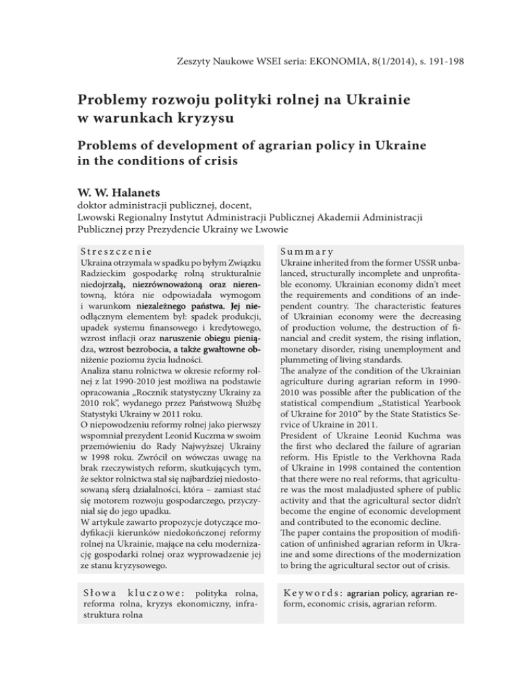 Zeszyty Naukowe WSEI seria: EKONOMIA, 8(1/2014), s. 191-198 Problemy rozwoju polityki rolnej na Ukrainie w warunkach kryzysu Problems of development of agrarian policy in Ukraine in the conditions of crisis W. W. Halanets doktor administracji publicznej, docent, Lwowski Regionalny Instytut Administracji Publicznej Akademii Administracji Publicznej przy Prezydencie Ukrainy we Lwowie Streszczenie Summar y S ł o w a k l u c z o w e : polityka rolna, reforma rolna, kryzys ekonomiczny, infra� struktura rolna K e y w o r d s : agrarian ����������������������������� policy, agrarian re� Ukraina otrzymała w spadku po byłym Związku Radzieckim gospodarkę rolną strukturalnie nie�������������������������������������� dojrzałą,����������������������������� niezrównoważon�������������� ą oraz nieren� towną, która nie odpowiadała wymogom i warunk������������������������� om����������������������� niezależnego ���������������������� państwa��. �������� Jej nie� odłącznym elementem był: spadek produkcji, upadek systemu finansowego i kredytowego, wzrost inflacji oraz ������������������������� naruszenie �������������� obiegu pienią� dza������������������������������������������ , wzrost bezrobocia, ��������������������� a także ������������� gwałtown����� e���� ��� ob� niżenie poziomu życia ludności. Analiza stanu rolnictwa w okresie reformy rol� nej z lat 1990-2010 jest możliwa na podstawie opracowania „Rocznik statystyczny Ukrainy za 2010 rok”, wydanego przez Państwową Służbę Statystyki Ukrainy w 2011 roku. O niepowodzeniu reformy rolnej jako pierwszy wspomniał prezydent Leonid Kuczma w swoim przemówieniu do Rady Najwyższej Ukrainy w 1998 roku. Zwrócił on wówczas uwagę na brak rzeczywistych reform, skutkujących tym, że sektor rolnictwa stał się najbardziej niedosto� sowaną sferą działalności, która – zamiast stać się motorem rozwoju gospodarczego, przyczy� niał się do jego upadku. W artykule zawarto propozycje dotyczące mo� dyfikacji kierunków niedokończonej reformy rolnej na Ukrainie, mające na celu moderniza� cję gospodarki rolnej oraz wyprowadzenie jej ze stanu kryzysowego. Ukraine inherited from the former USSR unba� lanced, structurally incomplete and unprofita� ble economy. Ukrainian economy didn't meet the requirements and conditions of an inde� pendent country. The characteristic features of Ukrainian economy were the decreasing of production volume, the destruction of fi� nancial and credit system, the rising inflation, monetary disorder, rising unemployment and plummeting of living standards. The analyze of the condition of the Ukrainian agriculture during agrarian reform in 19902010 was possible after the publication of the statistical compendium „Statistical Yearbook of Ukraine for 2010” by the State Statistics Se� rvice of Ukraine in 2011. President of Ukraine Leonid Kuchma was the first who declared the failure of agrarian reform. His Epistle to the Verkhovna Rada of Ukraine in 1998 contained the contention that there were no real reforms, that agricultu� re was the most maladjusted sphere of public activity and that the agricultural sector didn’t become the engine of economic development and contributed to the economic decline. The paper contains the proposition of modifi� cation of unfinished agrarian reform in Ukra� ine and some directions of the modernization to bring the agricultural sector out of crisis. form, economic crisis, agrarian reform. Zeszyty Naukowe WSEI seria: EKONOMIA, 8(1/2014) 192 W. W. Halanets, Problemy rozwoju polityki rolnej na Ukrainie w warunkach kryzysu Przez długi czas Ukraina wchodziła w skład ZSRR, którego gospodarka opie� rała się na dwóch formach własności: państwowej oraz spółdzielczej. Pierwsza z nich charakteryzowała się skupieniem społecznych środków produkcji na naj� wyższym, państwowym poziomie, druga natomiast – różnorodność własności uspołecznionej, w której właścicielami wytworzonych produktów stawali się koł� choźnicy. Obie formy własności pozbawiały pracowników własnej inicjatywy oraz możliwości stania się rzeczywistymi właścicielami wytworzonych przez siebie produktów. Brak zainteresowania wynikami pracy nie stymulował rozwoju pro� dukcji rolnej, której tempo systematycznie malało. W ten sposób przedkryzysowa sytuacja w rolnictwie przeszła w fazę kryzysową. W związku z tym, że Ukraina otrzymała w spadku po byłym Związku Radzieckim gospodarkę rolną strukturalnie niedojrzałą, niezrównoważoną oraz nierentowną������������������������������������������������������������ ,����������������������������������������������������������� któr������������������������������������������������������ ���������������������������������������������������������� a�����������������