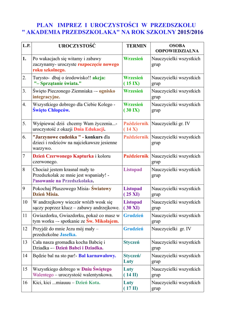 PLAN IMPREZ I UROCZYSTOŚCI W PRZEDSZKOLU " AKADEMIA PRZEDSZKOLAKA" NA ROK SZKOLNY 2015/2016 L.P. UROCZYSTOŚĆ TERMIN OSOBA ODPOWIEDZIALNA 1. Po wakacjach się witamy i zabawy Wrzesień zaczynamy- uroczyste rozpoczęcie nowego roku szkolnego. Nauczycielki wszystkich grup 2. Turysto- dbaj o środowisko!! akcja: "– Sprzątanie świata." Wrzesień ( 15 IX) Nauczycielki wszystkich grup 3. Święto Pieczonego Ziemniaka –- ognisko integracyjne. Wrzesień Nauczycielki wszystkich grup 4. Wszystkiego dobrego dla Ciebie Kolego Święto Chłopców. Wrzesień ( 30 IX) Nauczycielki wszystkich grup 5. Wyśpiewać dziś chcemy Wam życzenia...uroczystość z okazji Dnia Edukacji. Październik Nauczycielki gr. IV ( 14 X) 6. "Jarzynowe cudeńka " - konkurs dla dzieci i rodziców na najciekawsze jesienne warzywo. Październik Nauczycielki wszystkich grup 7 Dzień Czerwonego Kapturka i koloru czerwonego. Październik Nauczycielki wszystkich grup 8 Chociaż jestem krasnal mały to Przedszkolak ze mnie jest wspaniały! Pasowanie na Przedszkolaka. Listopad Nauczycielki wszystkich grup 9 Pokochaj Pluszowego Misia- Światowy Dzień Misia. Listopad ( 25 XI) Nauczycielki wszystkich grup 10 W andrzejkowy wieczór wróżb wosk się Listopad sączy poprzez klucz – zabawy andrzejkowe. ( 30 XI) Nauczycielki wszystkich grup 11 Gwiazdorku, Gwiazdorku, pokaż co masz w Grudzień tym worku –- spotkanie ze Św. Mikołajem. Nauczycielki wszystkich grup 12 Przyjdź do mnie Jezu mój mały – przedszkolne Jasełka. Grudzień Nauczycielki gr. IV 13 Cała nasza gromadka kocha Babcię i Dziadka -– Dzień Babci i Dziadka. Styczeń Nauczycielki wszystkich grup 14 Będzie bal na sto par!- Bal karnawałowy. Styczeń/ Luty Nauczycielki wszystkich grup 15 Wszystkiego dobrego w Dniu Świętego Walentego – uroczystość walentynkowa. Luty ( 14 II) Nauczycielki wszystkich grup 16 Kici, kici ...miauuu – Dzień Kota. Luty ( 17 II) Nauczycielki wszystkich grup 17 " Dzień żaby" i koloru zielonego Marzec ( 1 III) Nauczycielki wszystkich grup 18 Robimy bukiety dla każdej kobiety - święto Marzec dziewczynek. ( 8 III) Nauczycielki wszystkich grup 19 Przychodź Wiosno upragniona, piękna , ciepła i zielona –- pożegnanie zimy i powitanie wiosny. Marzec ( 21 III) Nauczycielki wszystkich grup 20 Woda,woda zdrowia doda – Światowy Dzień Wody Marzec ( 22 III) Nauczycielki wszystkich grup 21 Wszystkim jest nam bliska ochrona środowiska!-Światowy Dzień Ziemi. Kwiecień /(22 IV) Nauczycielki wszystkich grup 22 Śmieciomoda –- konkurs międzygrupowy na najdziwniejszy strój ekologiczny Kwiecień Nauczycielki wszystkich grup 23 Konkurs rodzinno-fotograficznoekologiczny:" Barwy Ziemi " Kwiecień Nauczycielkiwszystkich grup 24 Dzień Czekolady. Kwiecień ( 12IV) Nauczycielki wszystkich grup 25 Dzień Strażaka ( zaproszony Gość). Maj Nauczycielki wszystkich grup 26 Dzień Bibliotekarza ( wyjście do biblioteki). Maj ( 8 V) Nauczycielki gr. IV 27 Rodzina, rodzina zawsze razem się trzyma!- Maj Dzień Mamy i Taty Nauczycielki wszystkich grup 28 Słonko jasno świeci, dziś się cieszą wszystkie dzieci -Dzień Dziecka!! Czerwiec (1 VI) Nauczycielki wszystkich grup 29 Dbam o moje środowisko!- Światowy Dzień Czerwiec Ochrony Środowiska ( 5 VI) Nauczycielki wszystkich grup 30 Jakie to miłe, gdy nas wiatr unosiŚwiatowy Dzień Wiatru. Czerwiec ( 15 VI) Nauczycielki wszystkich grup 31 Festyn Rodzinny na zakończenie roku przedszkolnego. Czerwiec Nauczycielki wszystkich grup 32 Dziś przedszkolaki, jutro już pierwszakiuroczyste pożegnanie Przedszkola. Czerwiec Nauczycielki wszystkich grup 33 Bal Absolwentów Czerwiec Nauczycielki wszystkich grup 34 Chętnie biegnę do przedszkola!- tak radośnie woła Ola –- spotkania adaptacyjne dla nowo przyjętych dzieci i ich Rodziców Sierpień Nauczycielki wszystkich grup INNE IMPREZY ORGANIZOWANE W PRZEDSZKOLU Z UDZIAŁEM DZIECI: * Spektakle teatralne i muzyczne na terenie przedszkola – terminy wg uzgodnienia z grupami teatralnymi, * Pamiętamy o urodzinach dzieci – cały rok, * Wycieczki i spacery związane z realizacją planowanej tematyki kompleksowej, organizowane wg . Miesięcznych planów pracy / do środowisk przyrodniczych, las łąka, park, instytucji użyteczności publicznej- zakłady pracy rodziców,/ , poznanie dalszego otoczenia /biblioteka, sklepy, urzędy itp./ * Wycieczki autokarowe / np. Z okazji Dnia Dziecka, wizyta w teatrze, kinie /, * Spotkania z przedstawicielami różnych zawodów , * Konkursy, * Akcje i projekty organizowane przez instytucje współpracujące z przedszkolem/ np. Zbieranie nakrętek, kluczy, pomoc Polakom na Wschodzie itp./, * Wystawy, * Koncerty muzyczne, * Warsztaty z udziałem Rodziców, * Festyny rodzinne itp. PLAN WYJŚĆ I WYCIECZEK W PRZEDSZKOLU " AKADEMIA PRZEDSZKOLAKA " W ROKU 2015/2016 L.p. Wyjście / Wycieczka Termin Osoba odpowiedzialna 1. Wycieczka do Ogródków działkowych w Lubartowie Wrzesień 2015r. K.Kobus 2. Wycieczka do oczyszczalni ścieków w Lubartowie – czysta woda- darem dla życia na ziemi Październik 2015r. E.Kostyła 3. Wyjście do parku – - zabawy naśladowcze w terenie Październik 2015r. A. Wójcicka 4. Wyjście do galerii dyskontowej Październik/ Listopad 2015r. M.Wołyńczuk 5. Wycieczka Mikołajkowa Grudzień 2015r. K.Kobus E. Kostyła 6. Wycieczka do Nadleśnictwa w Lubartowie chodzimy ścieżkami edukacyjnymi Kwiecień 2016r. K.Kobus Kwiecień/ Maj 2016r. A. Wójcicka 7. Wyjście do sklepu zoologicznego - odwiedzamy – naszych milusińskich przyjaciół 8. Wyjście na łąkę- szanuj zieleń – zabawy w terenie Maj 2016r. M. Wołyńczuk 9 Wycieczka do Ogrodu Botanicznego w Lublinie Maj 2016r. K.Kobus E. Kostyła 9. Wycieczki z okazji Dnia Dziecka –- niespodzianka ! Czerwiec 2016r. Wszystkie nauczycielki 10 Wyjście gr.O do Szkoły Podstawowej nr 3 w Lubartowie Czerwiec 2016r. E. Kostyła