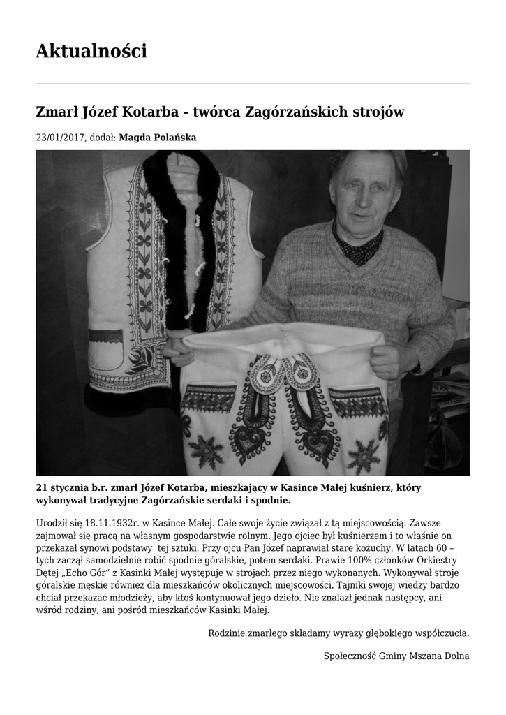 Aktualności Zmarł Józef Kotarba - twórca Zagórzańskich strojów 23/01/2017, dodał: Magda Polańska 21 stycznia b.r. zmarł Józef Kotarba, mieszkający w Kasince Małej kuśnierz, który wykonywał tradycyjne Zagórzańskie serdaki i spodnie. Urodził się 18.11.1932r. w Kasince Małej. Całe swoje życie związał z tą miejscowością. Zawsze zajmował się pracą na własnym gospodarstwie rolnym. Jego ojciec był kuśnierzem i to właśnie on przekazał synowi podstawy tej sztuki. Przy ojcu Pan Józef naprawiał stare kożuchy. W latach 60 – tych zaczął samodzielnie robić spodnie góralskie, potem serdaki. Prawie 100% członków Orkiestry Dętej „Echo Gór” z Kasinki Małej występuje w strojach przez niego wykonanych. Wykonywał stroje góralskie męskie również dla mieszkańców okolicznych miejscowości. Tajniki swojej wiedzy bardzo chciał przekazać młodzieży, aby ktoś kontynuował jego dzieło. Nie znalazł jednak następcy, ani wśród rodziny, ani pośród mieszkańców Kasinki Małej. Rodzinie zmarłego składamy wyrazy głębokiego współczucia. Społeczność Gminy Mszana Dolna
