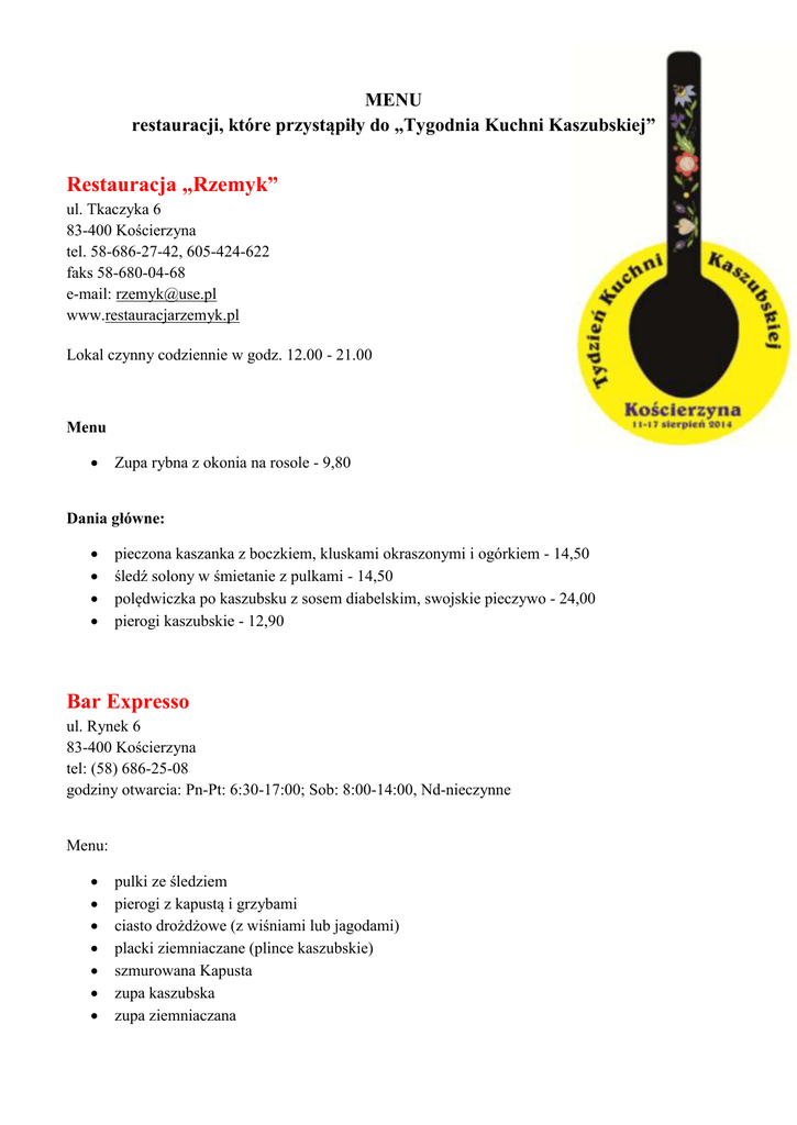 MENU restauracji, które przystąpiły do „Tygodnia Kuchni Kaszubskiej” Restauracja „Rzemyk” ul. Tkaczyka 6 83-400 Kościerzyna tel. 58-686-27-42, 605-424-622 faks 58-680-04-68 e-mail: [email protected] www.restauracjarzemyk.pl Lokal czynny codziennie w godz. 12.00 - 21.00 Menu Zupa rybna z okonia na rosole - 9,80 Dania główne: pieczona kaszanka z boczkiem, kluskami okraszonymi i ogórkiem - 14,50 śledź solony w śmietanie z pulkami - 14,50 polędwiczka po kaszubsku z sosem diabelskim, swojskie pieczywo - 24,00 pierogi kaszubskie - 12,90 Bar Expresso ul. Rynek 6 83-400 Kościerzyna tel: (58) 686-25-08 godziny otwarcia: Pn-Pt: 6:30-17:00; Sob: 8:00-14:00, Nd-nieczynne Menu: pulki ze śledziem pierogi z kapustą i grzybami ciasto drożdżowe (z wiśniami lub jagodami) placki ziemniaczane (plince kaszubskie) szmurowana Kapusta zupa kaszubska zupa ziemniaczana Stary Browar Kościerzyna Sp. z o.o. ul. Słodowa 3, 83-400 Kościerzyna tel. 58 680-07-75 www.starybrowarkoscierzyna.pl Menu Przystawki Pieczona pierś z kaczki z sosem malinowym i gruszką – 21 zł Śledź kaszubskich rybaków na domowym razowcu – 16 zł Zupy Chłodnik z botwiny ze swojskim jajem i kwaśną śmietaną – 12 zł Czernina z lanymi kluskami i suszoną gruszką – 14 zł Dania główne Smażony filet z sandacza z sosem z ogórków małosolnych, świeża sałata i młode ziemniaki – 35 zł Pieczone udko z gęsi z modrą kapustą i knedlami serowymi – 38 zł Golonka Browarnika na zasmażanej kapuście, pieczony ziemniak, dip ogórkowo - czosnkowy – 34 zł Desery Kaszubski grys z sosem malinowym – 9 zł Smażone ruchanki z sosem wiśniowym i lodami waniliowymi – 12 zł Od podanych cen obowiązuje rabat 20% Restauracja "Otwarta" ul. Strzelecka 36 83-400 Kościerzyna tel. 501 754 525 Menu Zupy kartoflanka (na maślance) - zacierka Przystawki gruchalec - baba ziemniaczana w sosie grzybowym plińce (placki ziemniaczane) ruchanki (racuchy) Danie główne pierogi kaczka po kaszubsku Hotel-ik Obiady Domowe ul. Długa 26 83-400 Kościerzyna www.hotelik-koscierzyna.pl Menu Śledź po Kaszubsku w zalewie octowej - 3 szt. (9zł - 20%) – 7 zł (Kaszebsczi sledz) Zupa owocowa z makaronem – 250 ml (7zł - 20%) – 5,50 zł (Zupa Brzadowo) Gotowany kurczak z ryżem i białym sosem z rodzynkami – (18zł-20%) – 14 zł (Frikasy) Placki z jabłkami – 4 szt. (8zł - 20%) – 6 zł (Ruchanczi) Bar Zigi ul. Tadeusza Kościuszki 34 83-400 Kościerzyna Menu: Zupy polewka (zupa ziemniaczana) zupa brzadowa (na suszonych owocach) Dania śledzie po kaszubsku śledź w zalewie octowej śledź w śmietanie z pulkami pieczona ryba z jeziora (leszcz, okoń, szczupak) Deser gryz z jagodami (kaszka manna) Hotel „Gryf” ul. Ogrodowa 2 83-400 Kościerzyna tel./fax +48 58 686 31 55 e-mail: [email protected] www.hotel-gryf.pl Zupy / Zupë Grzybowa / Grzëbòwô Ziemniaczana / Żuchel 7 zł 4 zł Potrawy mięsne / Miãsnô jôda Krokiety ziemniaczane z mięsem / Bùlwòwé klósczi z miãsã Golonka w kwaśnej kapuście/Gòlónka w kwasny kapùsce Schab z kapustą / Karbónada z kapùstą 12 zł 40 zł/1 kg 17 zł Drób/kwĕk Kura w białym sosie / Frikasy Kaczka z jabłkami, gruszkami modrą kapustą / Kaczczi z jabkama, Krëszkama i mòdrą kapùstą 17 zł Ziemniaki / Bùlwe Buraczki / Czwikła Mizeria / Swiéżé gùrczi 3 zł 3 zł 3 zł Śledź po kaszubsku / Kaszëbsczi slédz Śledź w oleju / slédz w òléju 7 zł 6 zł Drożdżówka kaszubska / Młodzewi kùch Placki z jabłkami / Ruchanczi 6 zł 6 zł 25 zł Hotel Bazuny i Restauracja Malëna ul. Kościuszki 17 83-400 Kościerzyna Tel. (58) 680 21 00 www.hotelbazuny.pl Grillowany „smędzony sėr” od Burych Misiów podawany z sałatką i kaszubską konfiturą z żurawiny błotnej - 19 PLN Zalewajka kościerska z kąskami polędwiczki wieprzowej, wędzonką i grzybami – 12 PLN Pierogi z mięsem gęsim polane delikatnym sosem kurkowym – 24 PLN Świeża sielawa (5 szt) smażona na patelni, podana z młodymi ziemniakami i sałatką z pomidorów – 35 PLN Restauracja „Kościerzanka” ul. 3 maja 9 83-400 Kościerzyna Menu: Kartoflanka (zupa ziemniaczana) - 4 zł Pierogi z jagodami - 10 zł Trampane Bulwe z kwaśnym mlekiem - 10 zł (odsmażane ziemniaki z boczkiem i maślanką + ogórek kiszony) Slédze z pulkami - 10 zł (Śledź w śmietanie z cebulką, jabłkiem, ogórkiem z ziemniakami) Piekarnia-Cukiernia BJ Jarzębińscy Sklepy firmowe ul. Świętojańska 20, tel. (58) 686-44-43, (58) 686-44-27 ul. M. C. Skłodowskiej 15, tel. (58) 686-42-22 ul. M. C. Skłodowskiej 40, tel. (58) 680-83-00 ul. Długa 23, tel. (58) 686-72-43 www.jarzebinski.pl Menu: „Młodzowy kuch” „Sznek z glancem” Restauracja „Lemon Tree” - oferta dostępna w lokalu ul. Świętojańska 17 83-400 Kościerzyna Tel. 58 686 81 80 Restauracja „Pod Kurem” - oferta dostępna w lokalu ul. Strzelnica 2 83-400 Kościerzyna Tel: 58 681 44 92 e-mail: [email protected] www.podkurem.pl Gyros. ZPHU.Bar Mański R ul. Długa 34 83-400 Kościerzyna Tel. 58 686 48 83 - oferta dostępna w lokalu